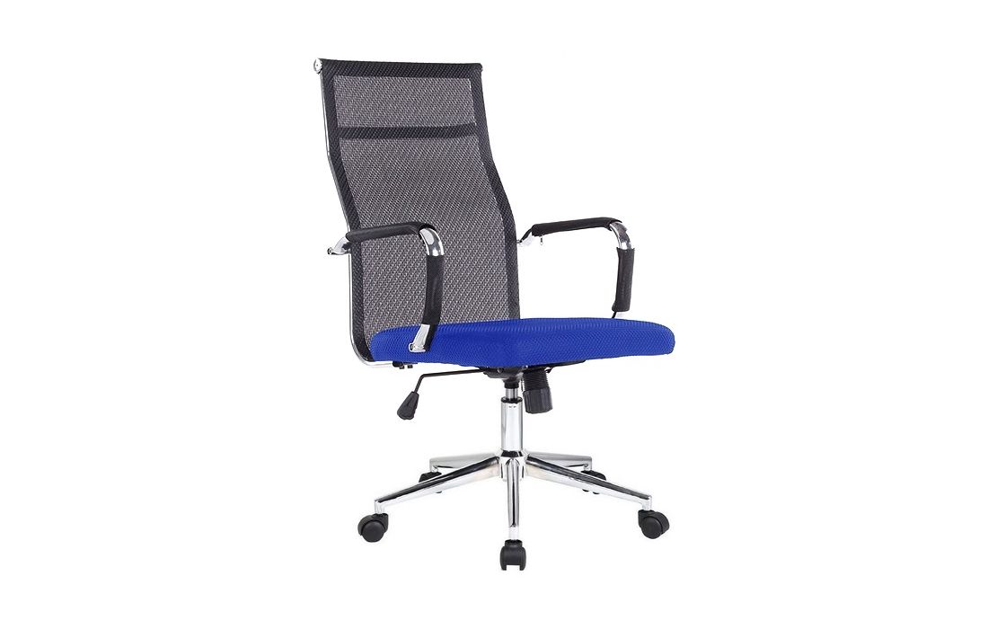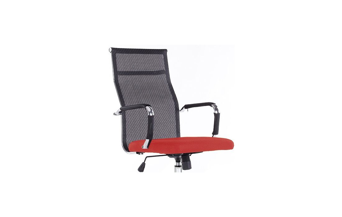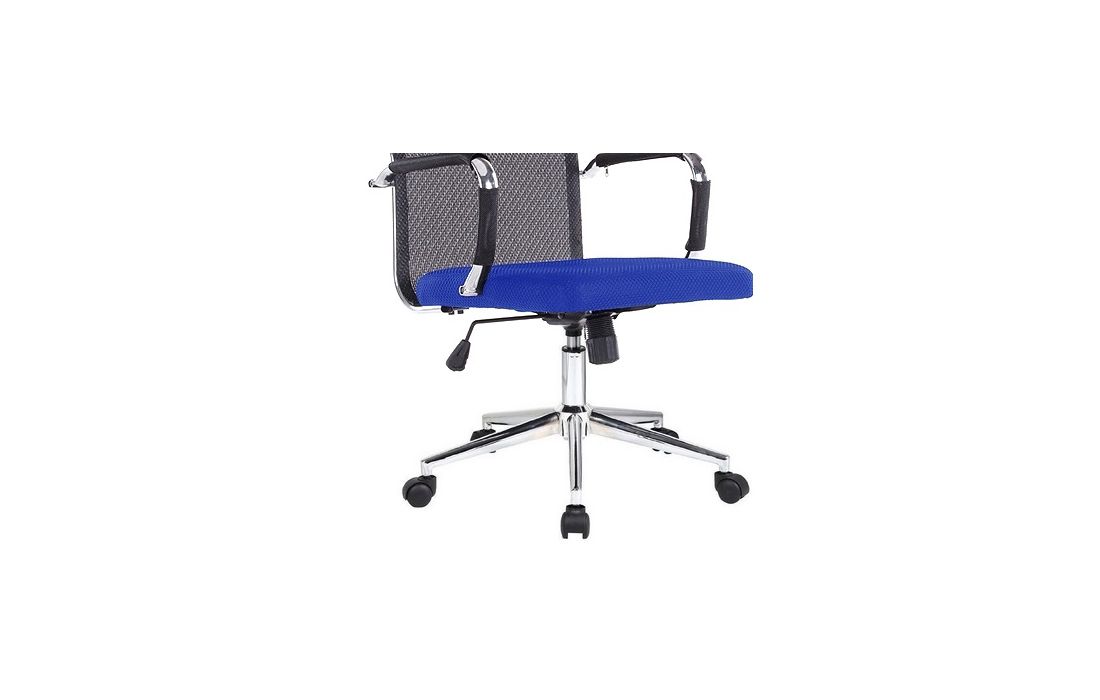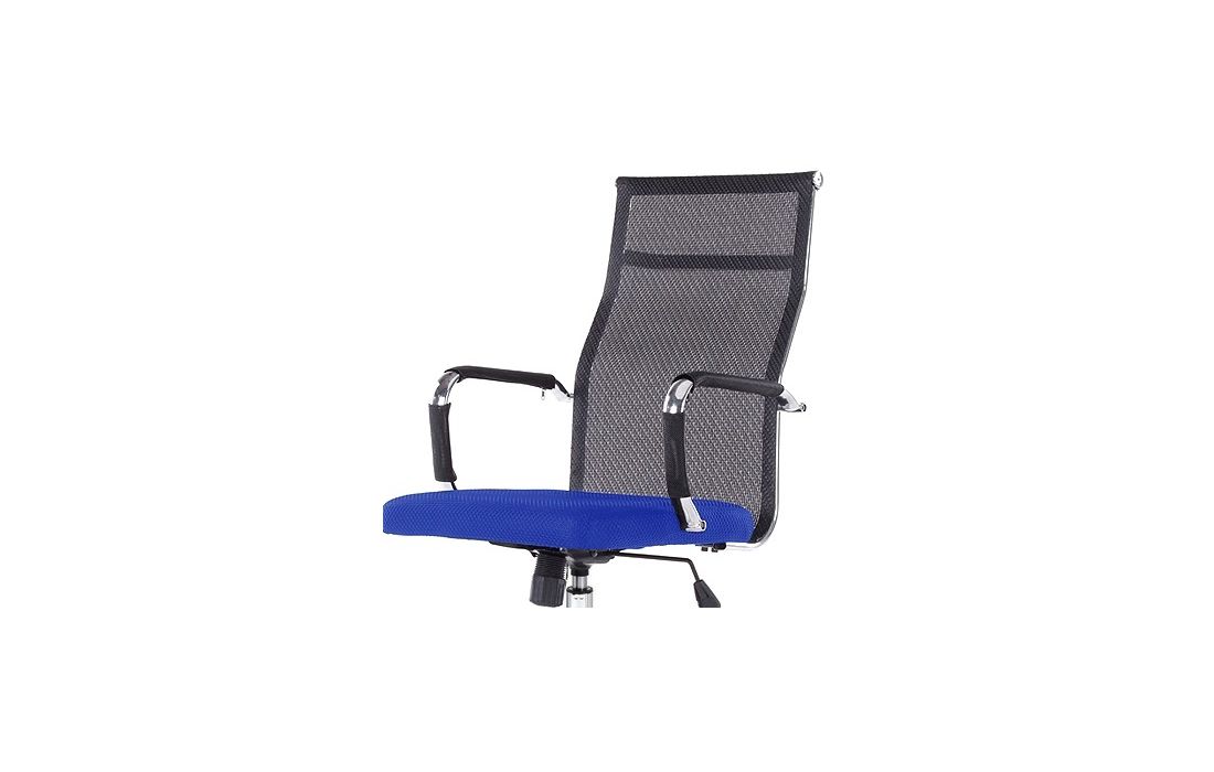 Cadeira giratória de elevação a gás com inclinação e bloqueio, base de metal e estofo com rede preta e tecido nas cores azul e vermelho.