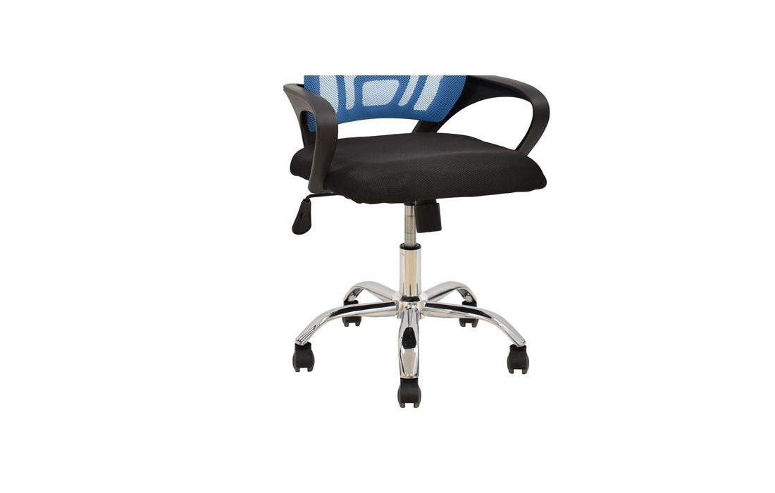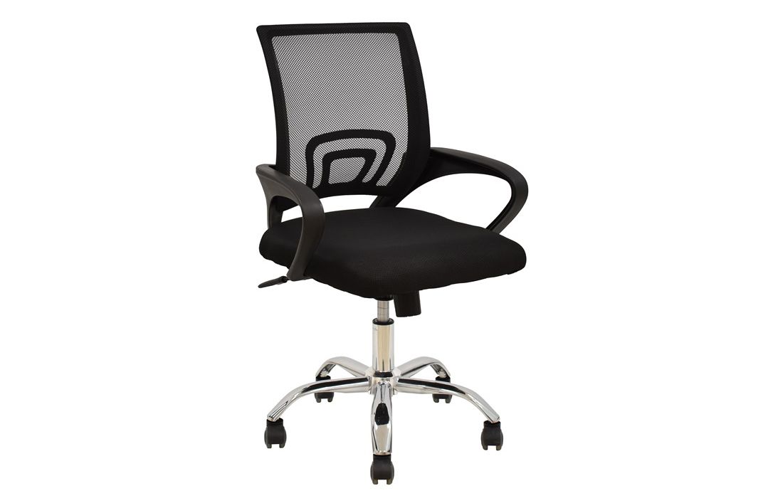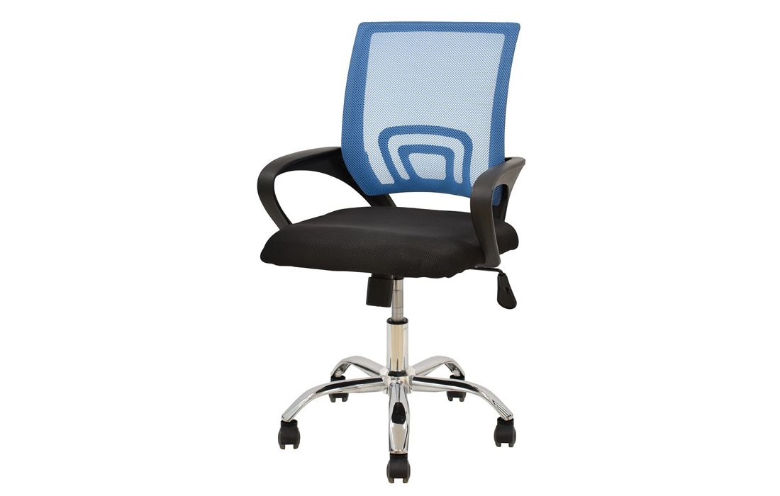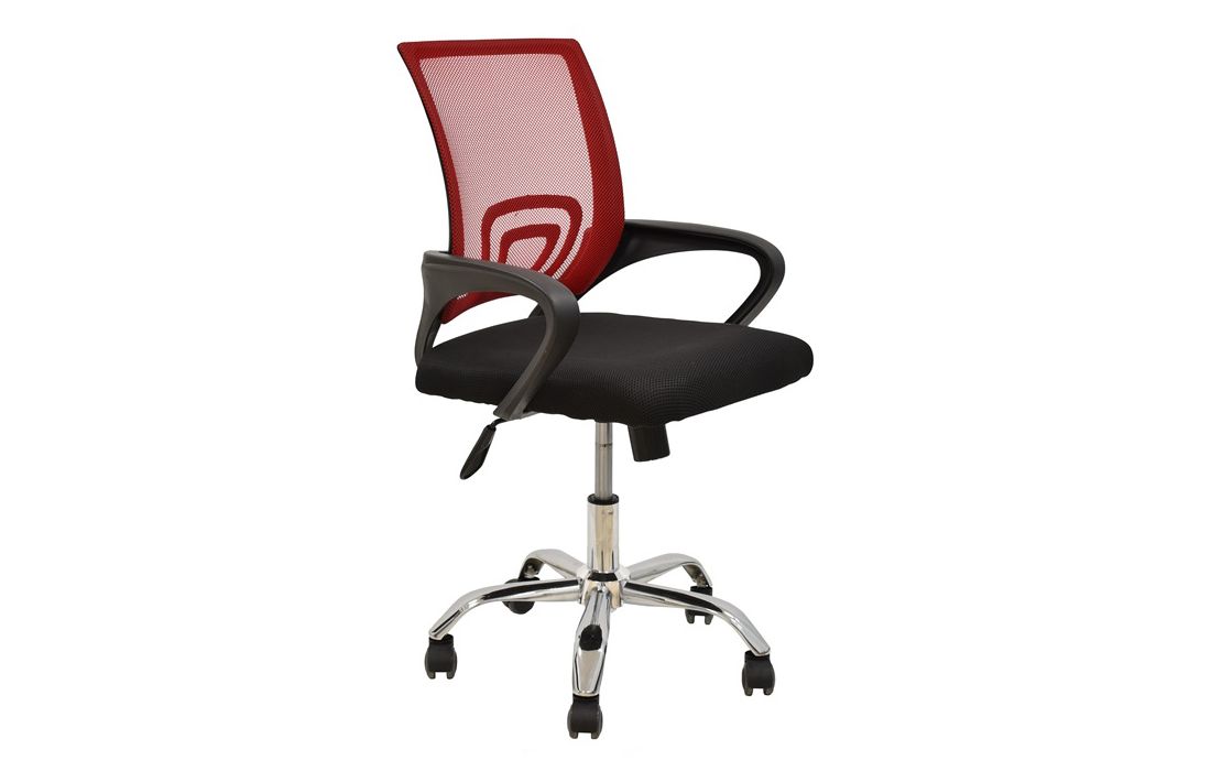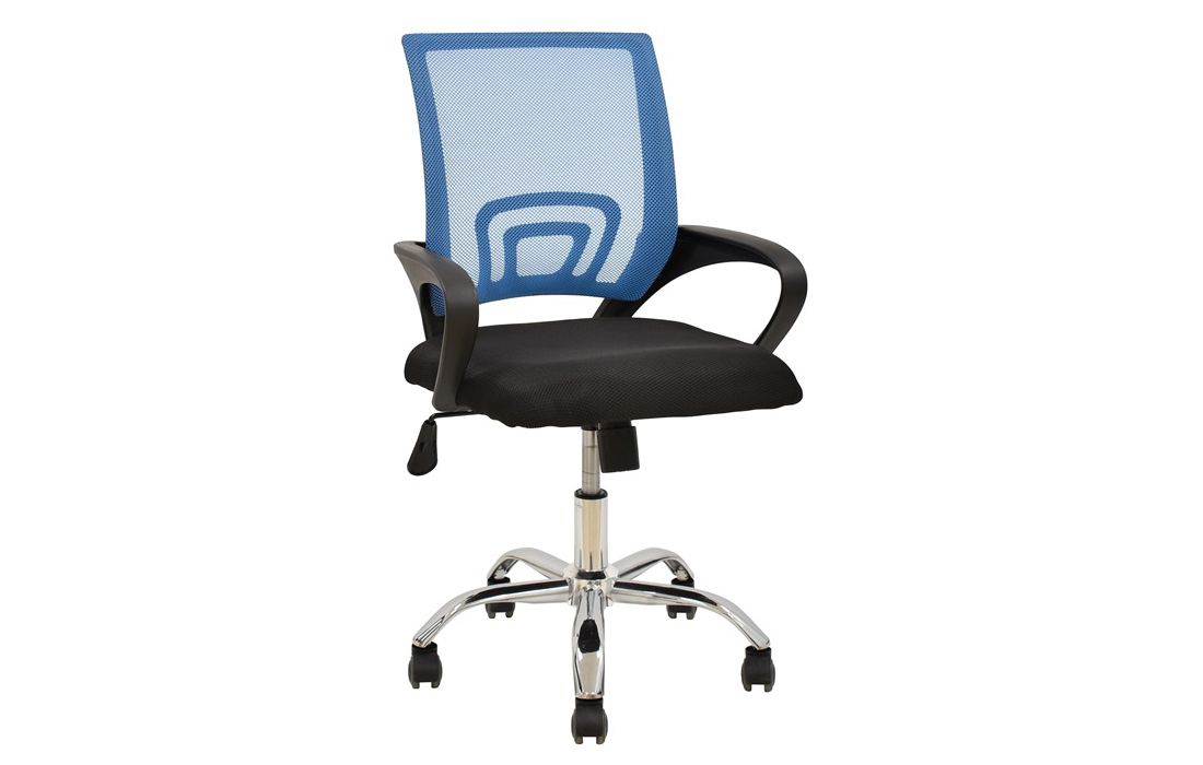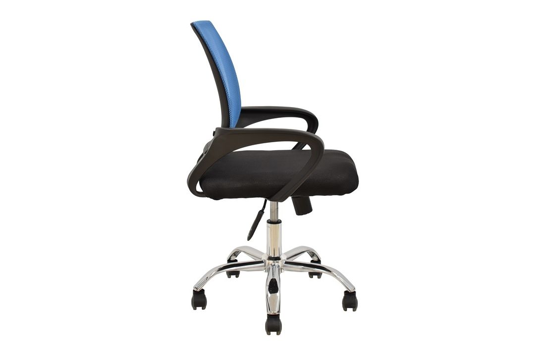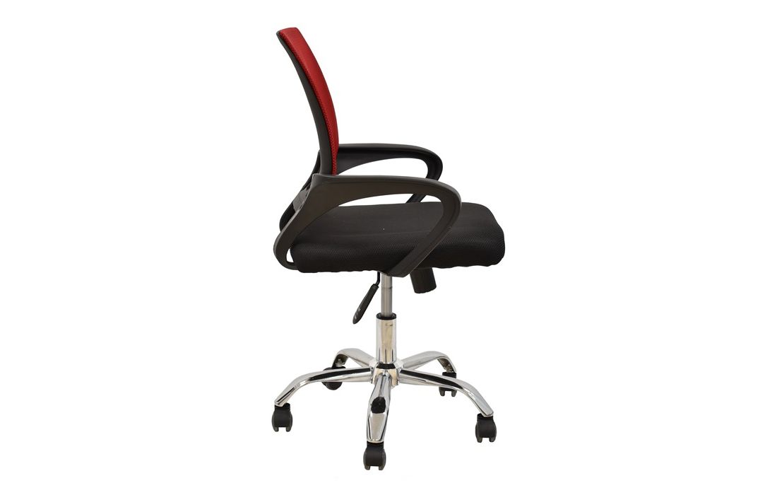 Cadeira giratória de elevação a gás com inclinação e bloqueio, estrutura de polipropileno preto, base de metal cromado e estofo nas cores com tecido preto e rede nas cores azul, cinza, preto e vermelho.