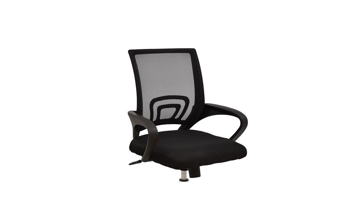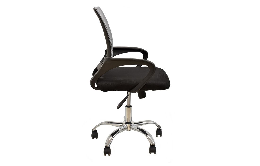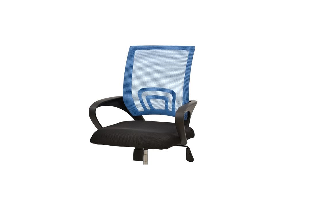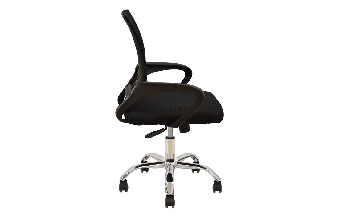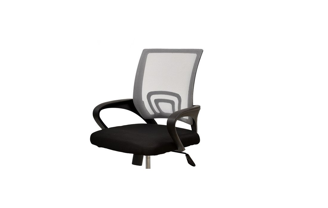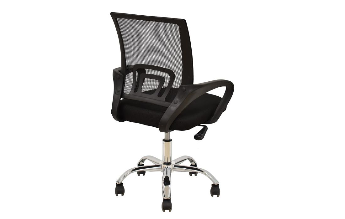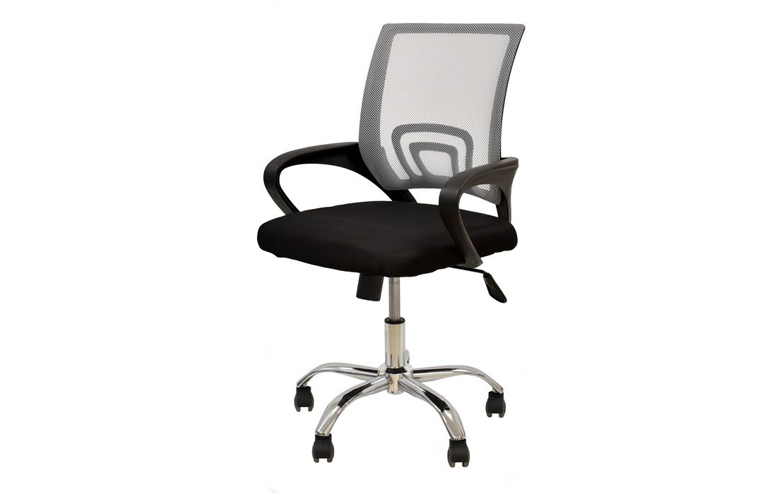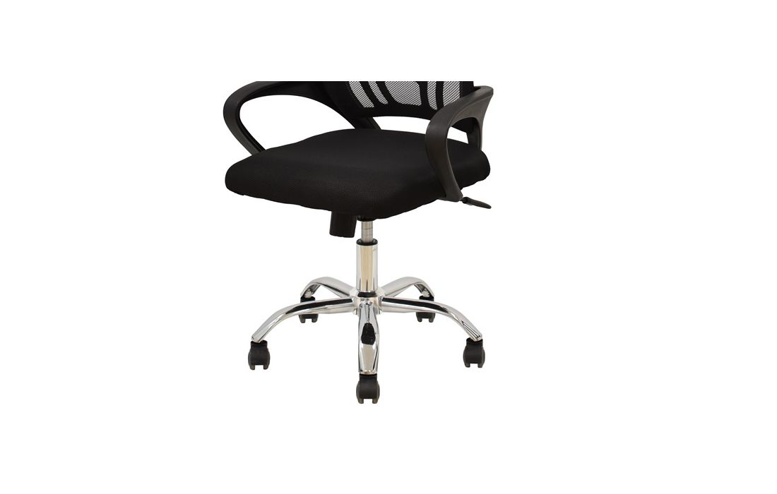 Cadeira giratória de elevação a gás com inclinação e bloqueio, estrutura de polipropileno preto, base de metal cromado e estofo nas cores com tecido preto e rede nas cores azul, cinza, preto e vermelho.