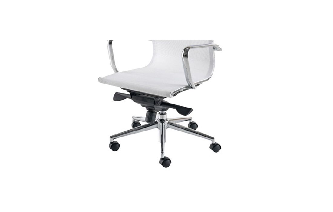 Cadeira geratória de elevação a gás com inclinação e bloqueio, multifunções com estrutura de metal e estofo em rede nas cores branca e preta.