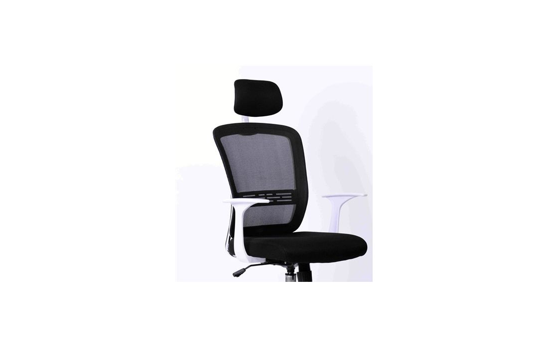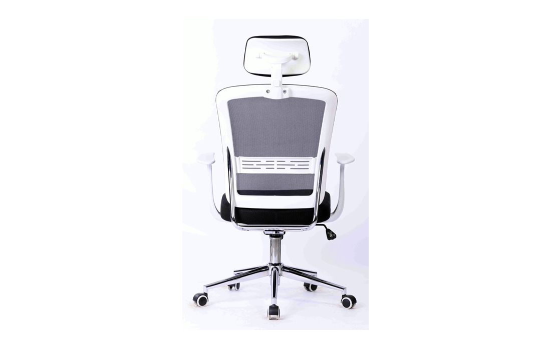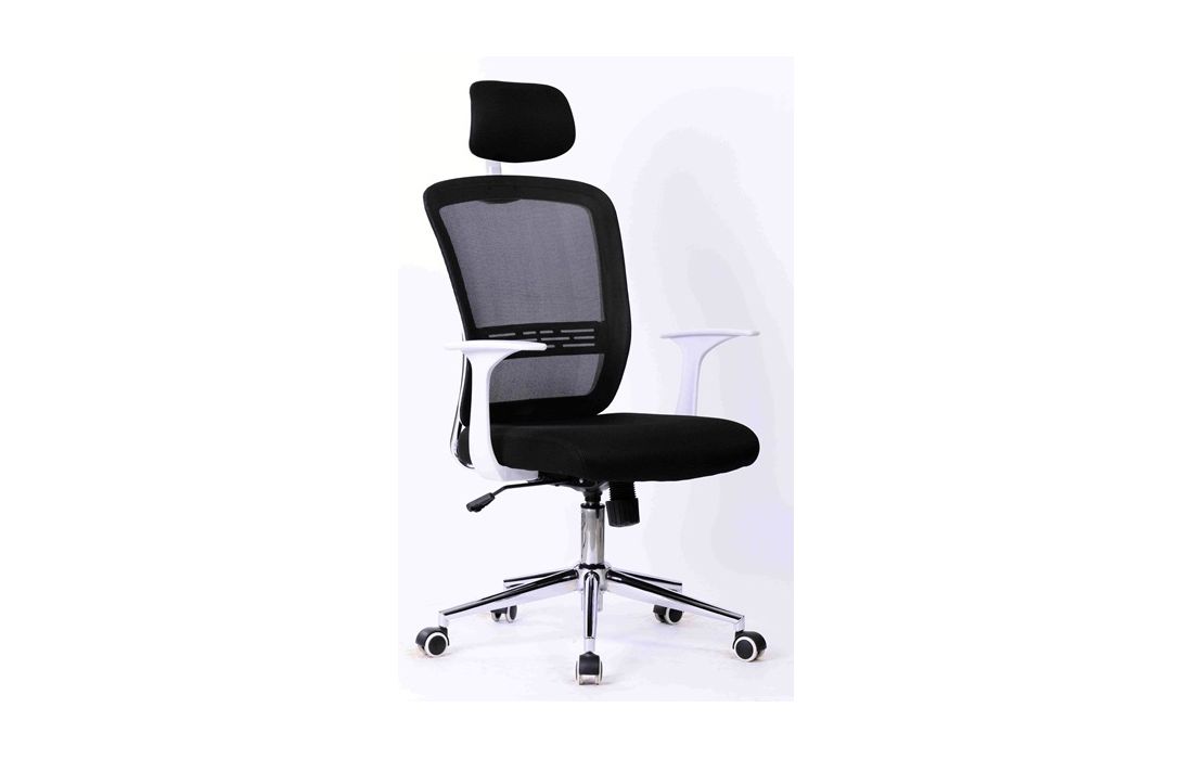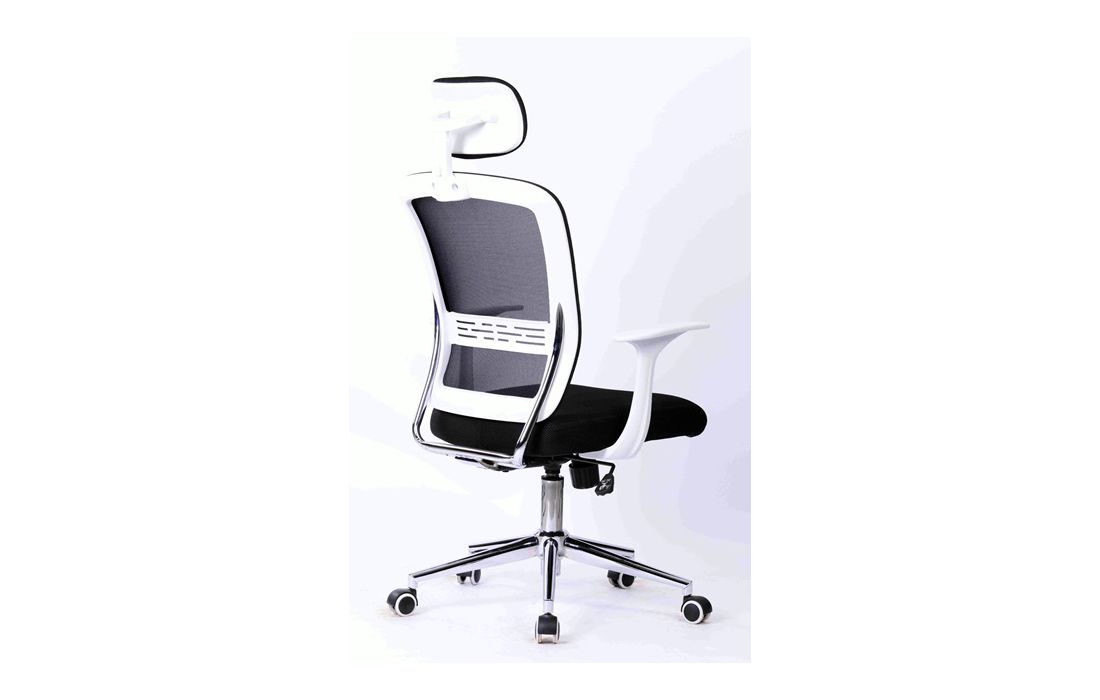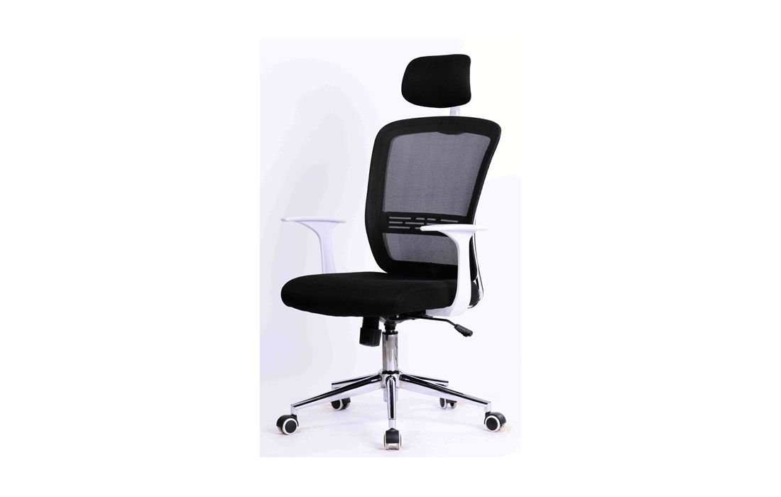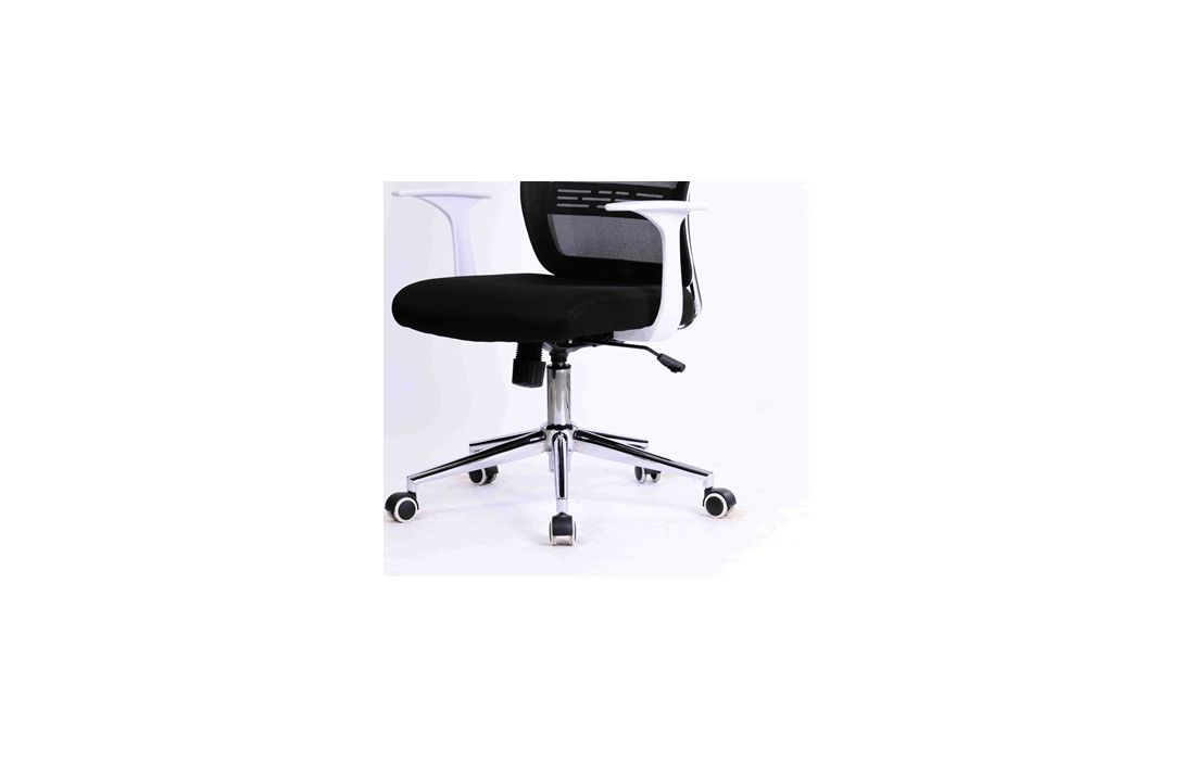Cadeira geratória de elevação a gás com inclinação e bloqueio, base de metal e estofo em rede e tecido cor preta.