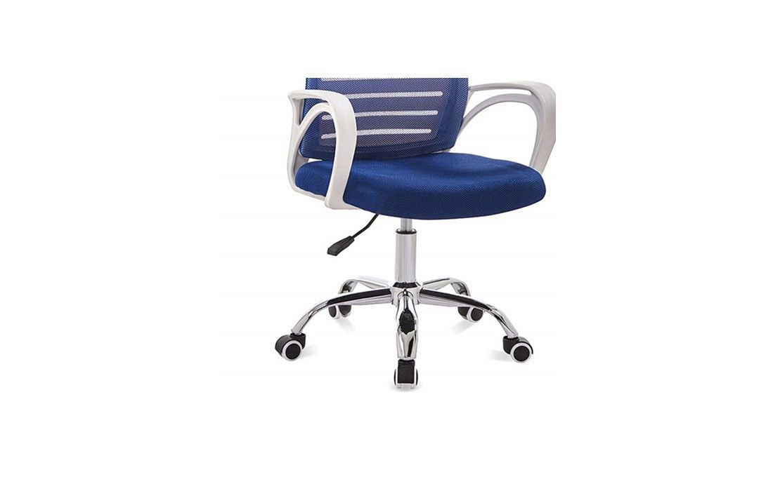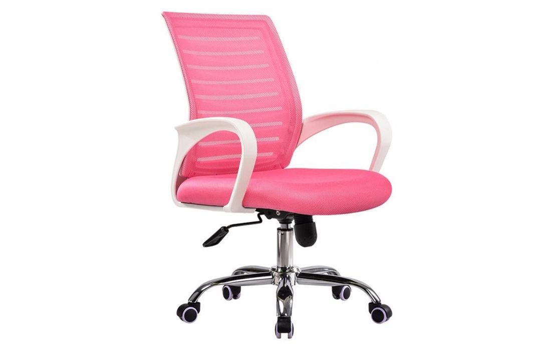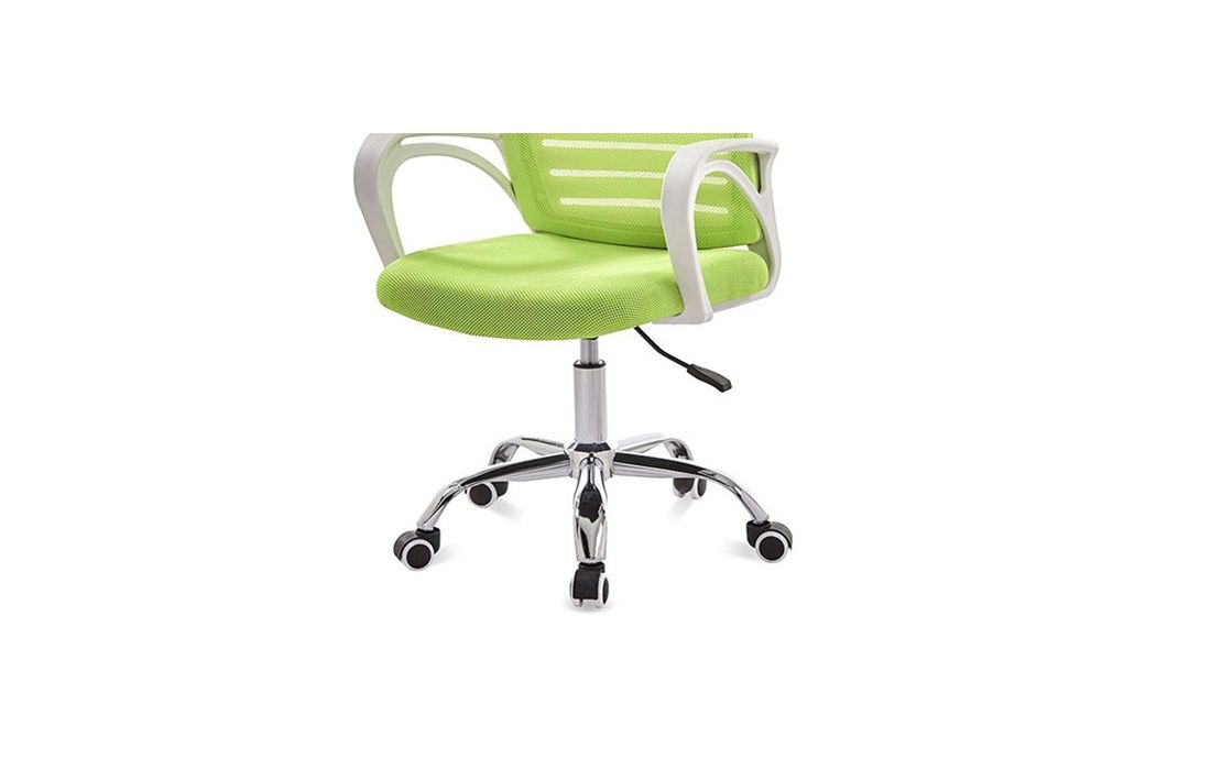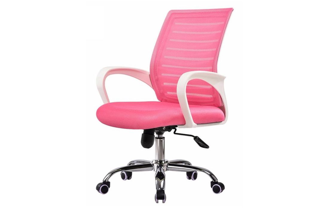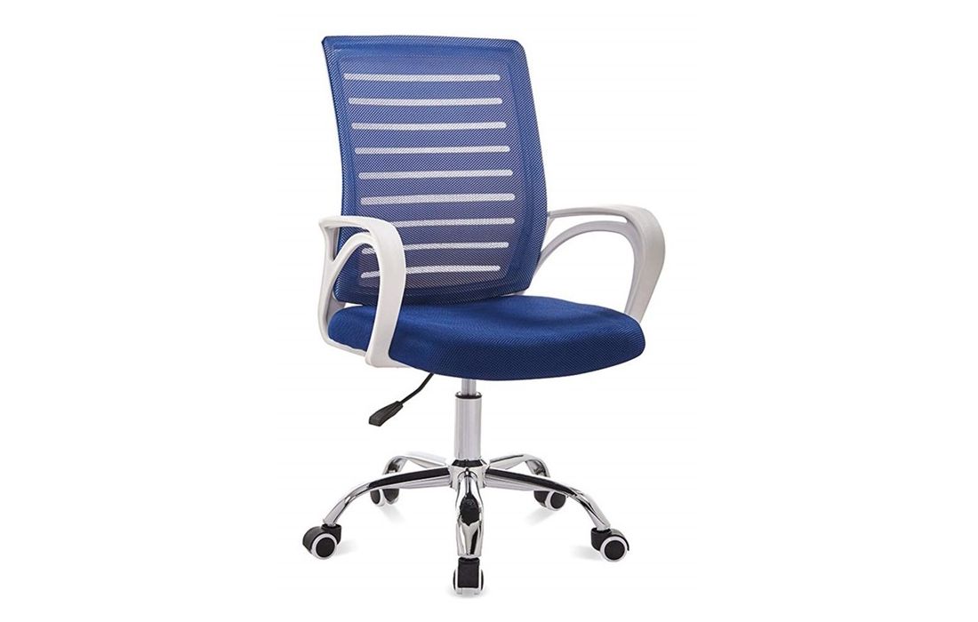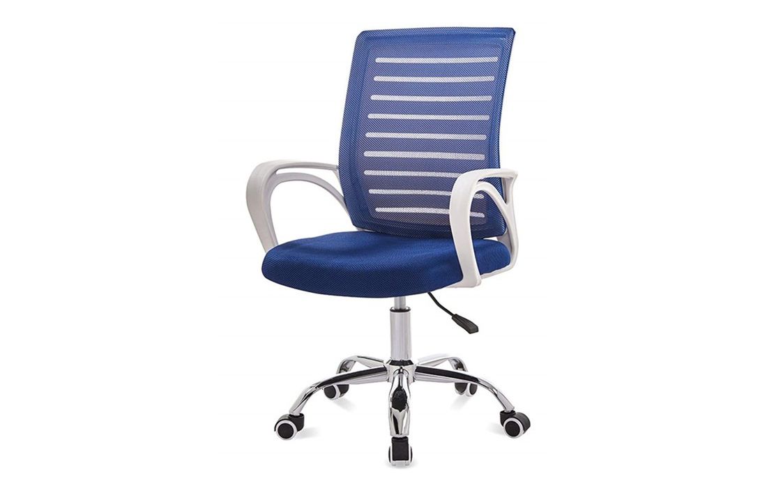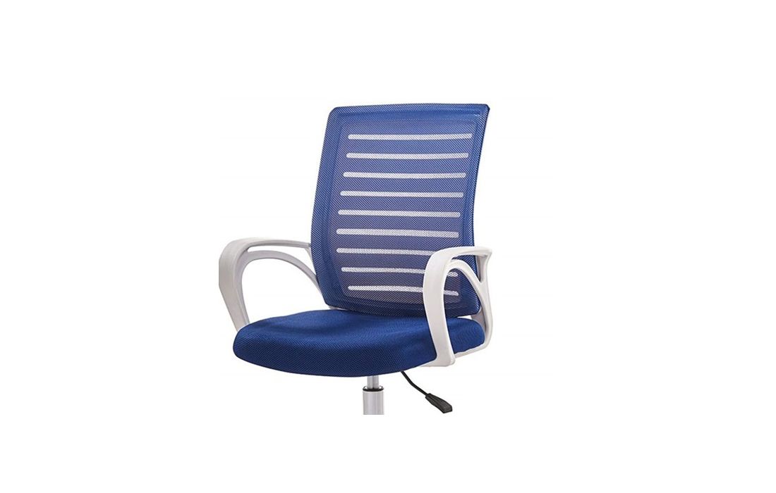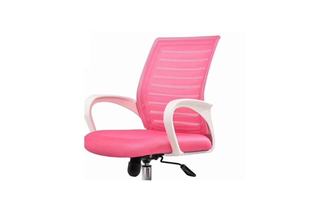 Cadeira geratória de elevação a gás com inclinação e bloqueio, estrutura de polipropileno branco, base de metal cromado e estofo em rede e tecido nas cores azul, preta, rosa e verde.