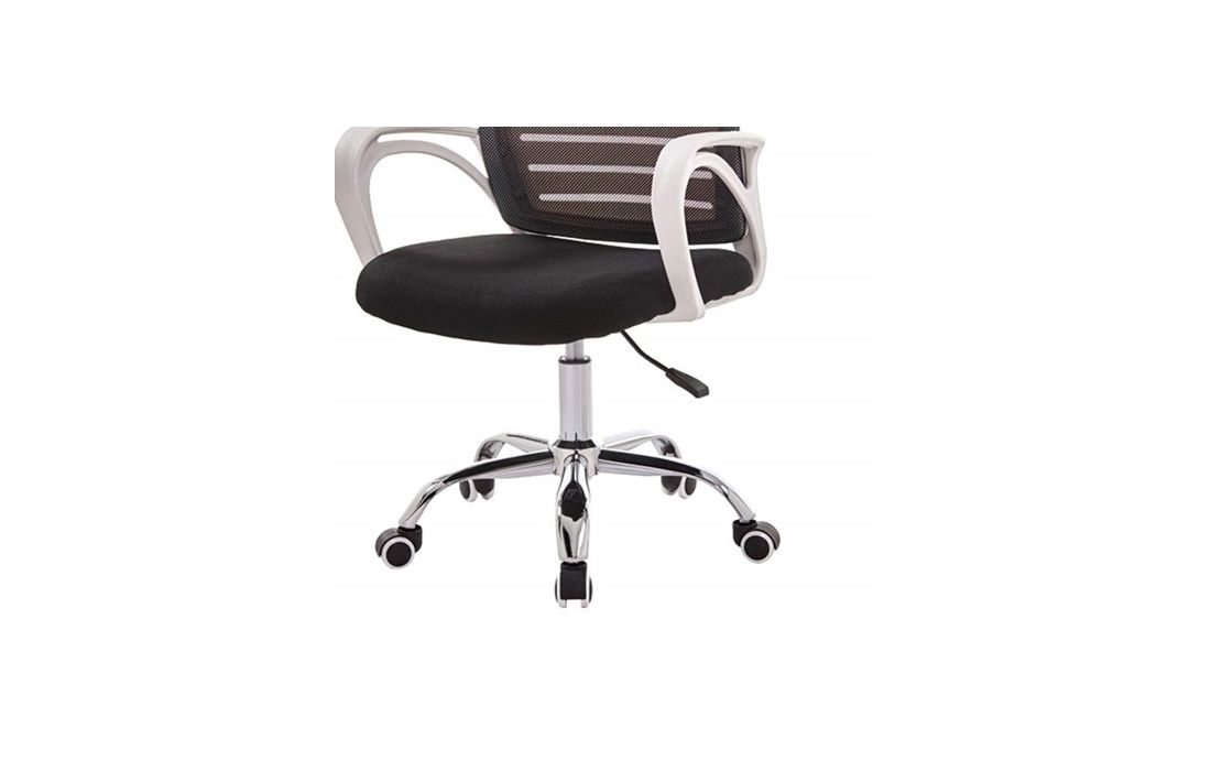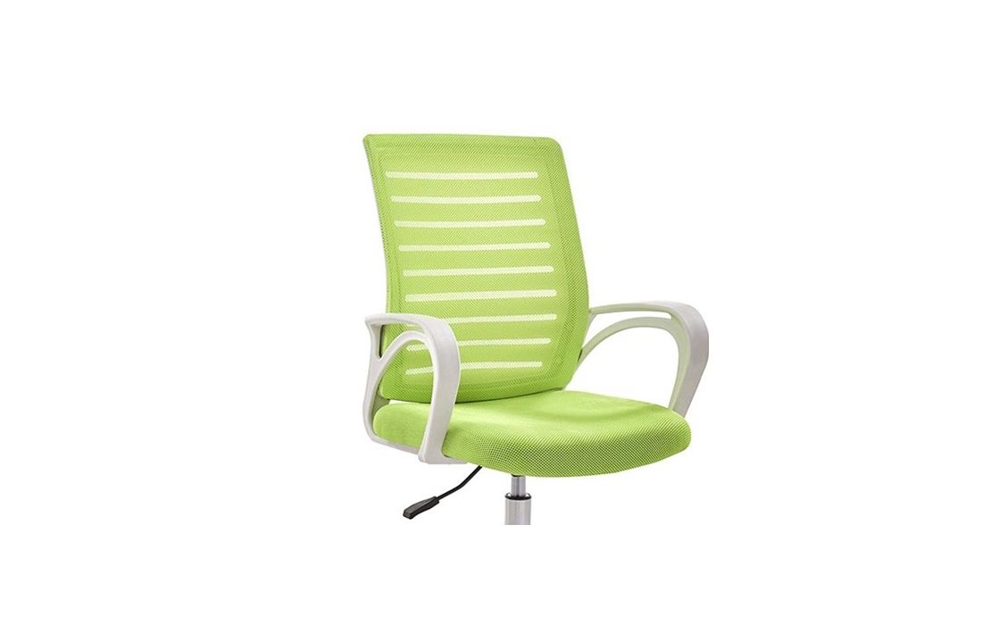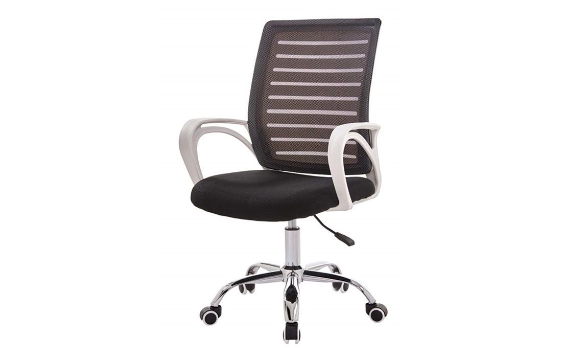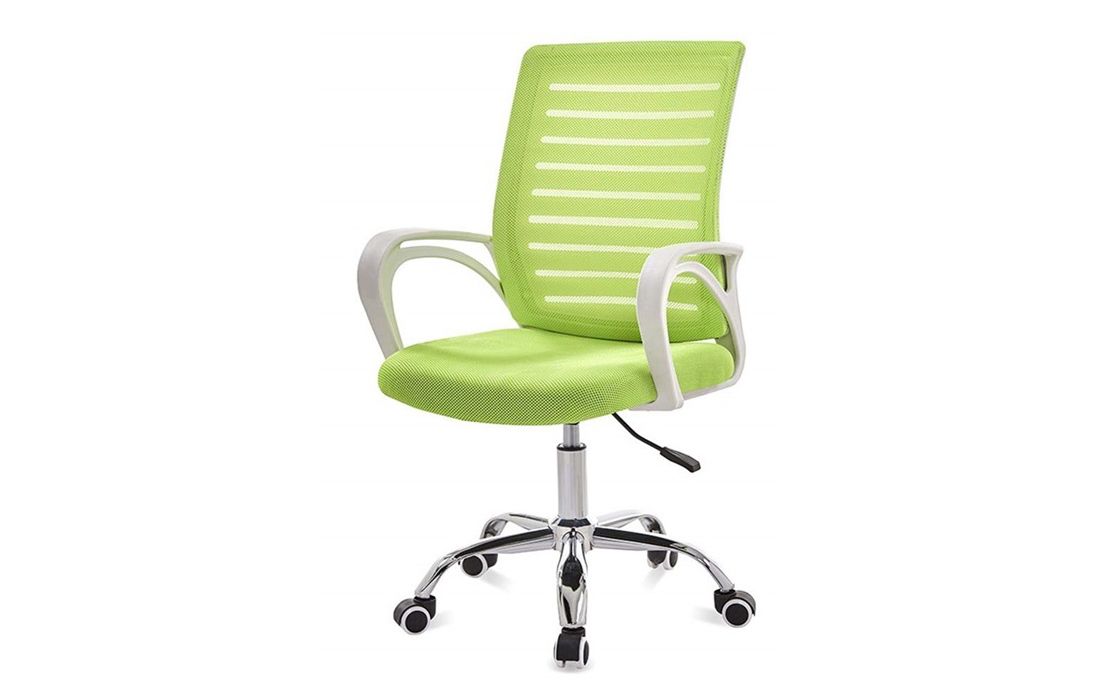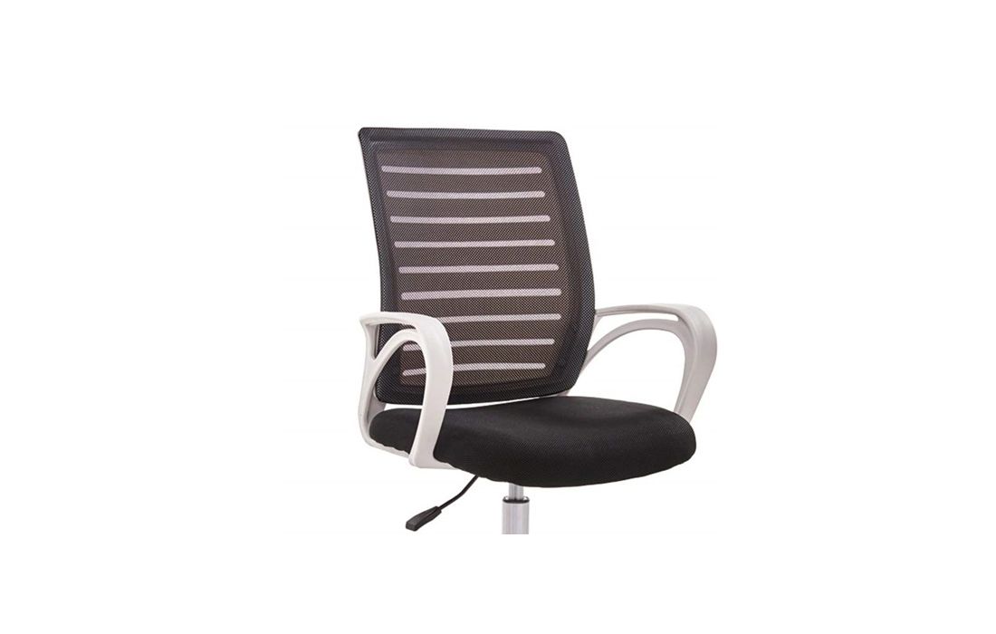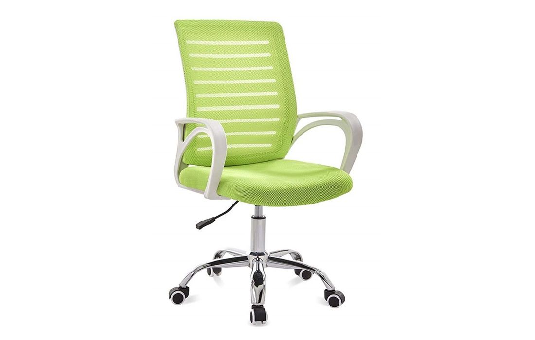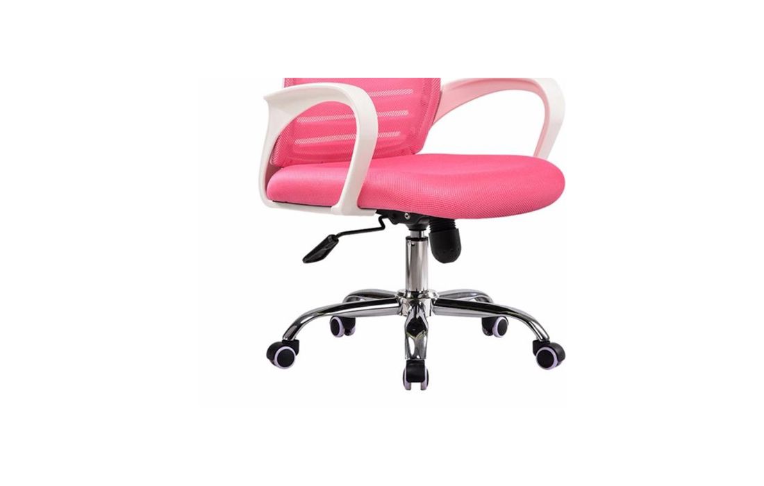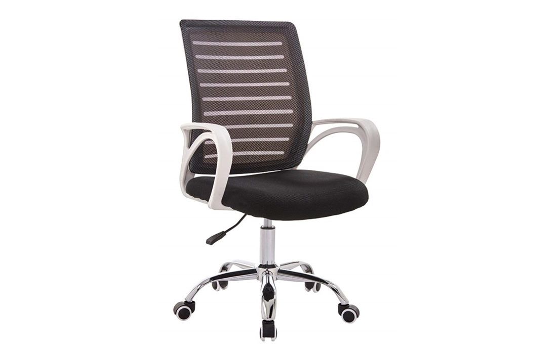 Cadeira geratória de elevação a gás com inclinação e bloqueio, estrutura de polipropileno branco, base de metal cromado e estofo em rede e tecido nas cores azul, preta, rosa e verde.