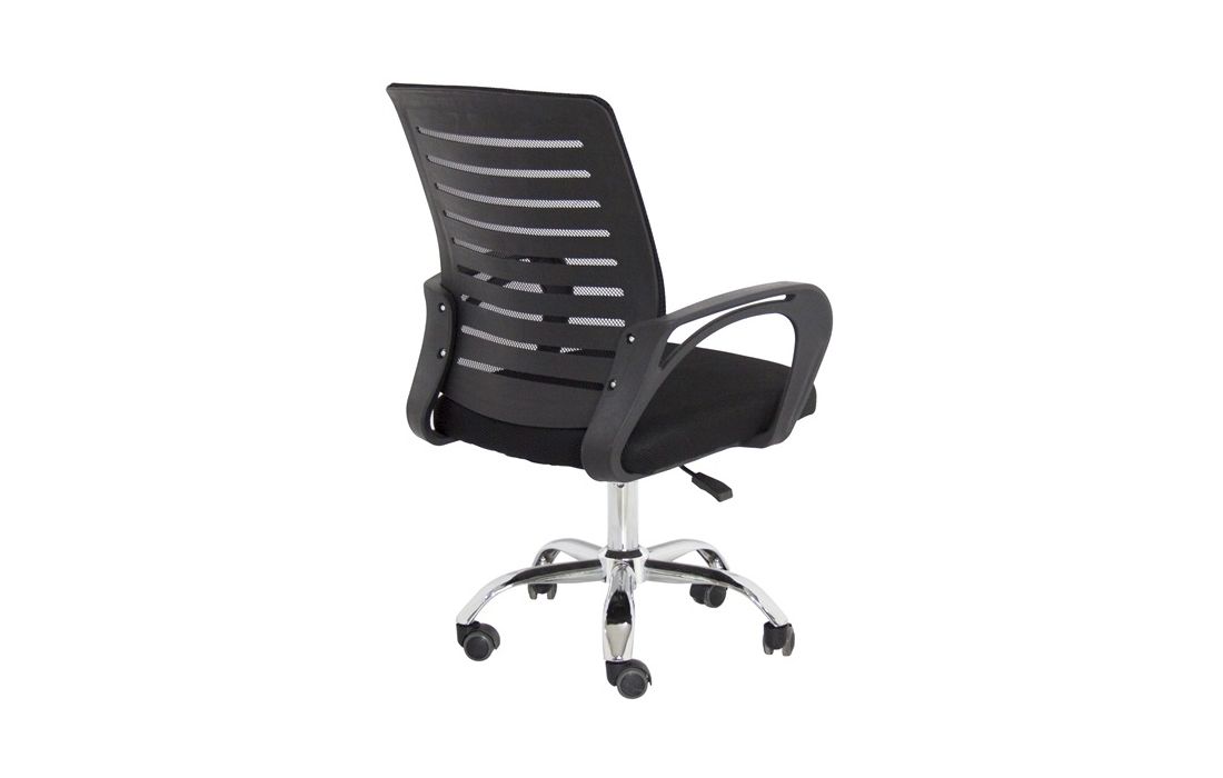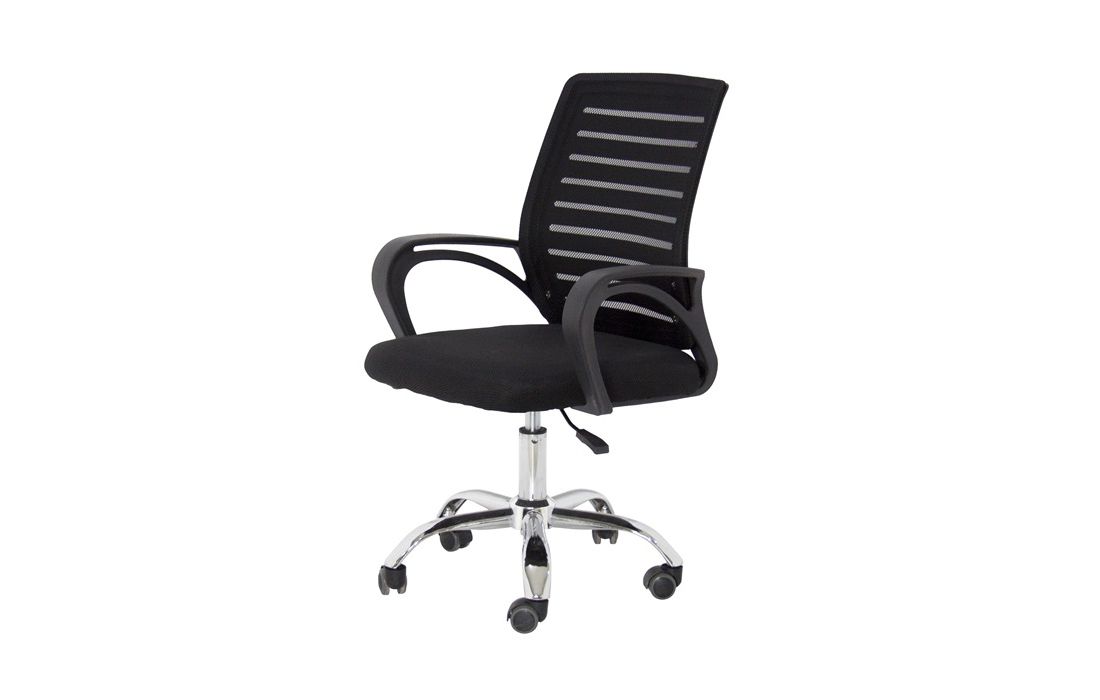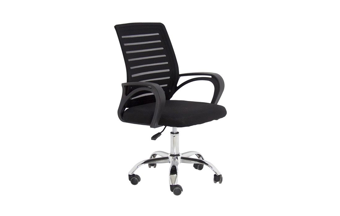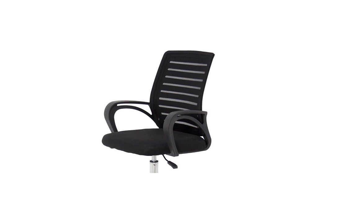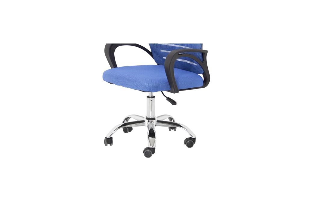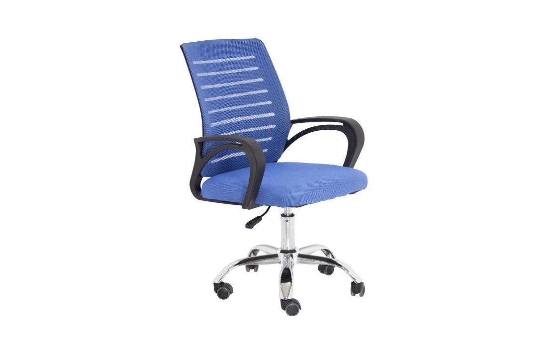 Cadeira geratória de elevação a gás com inclinação e bloqueio, estrutura de polipropileno preto, base de metal cromado e estofo em rede e tecido nas cores azul e preta.