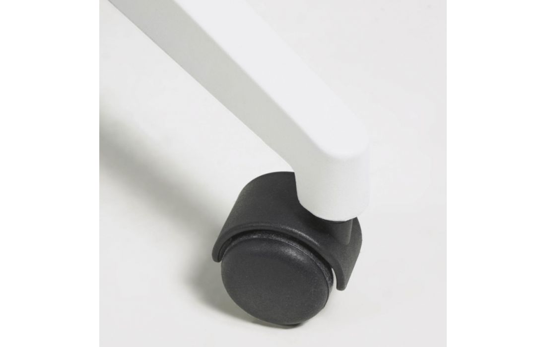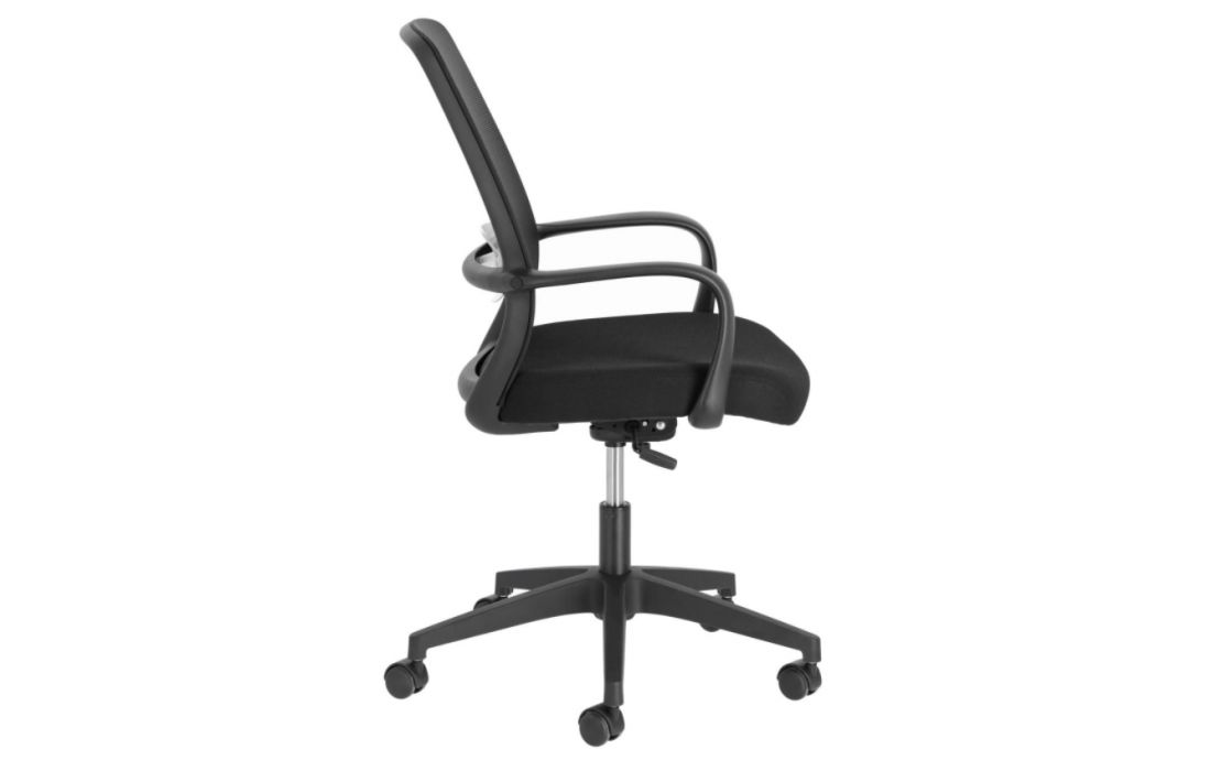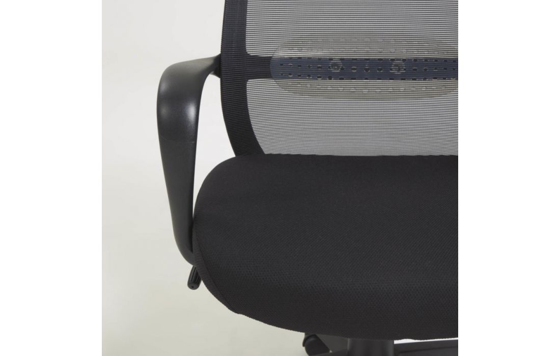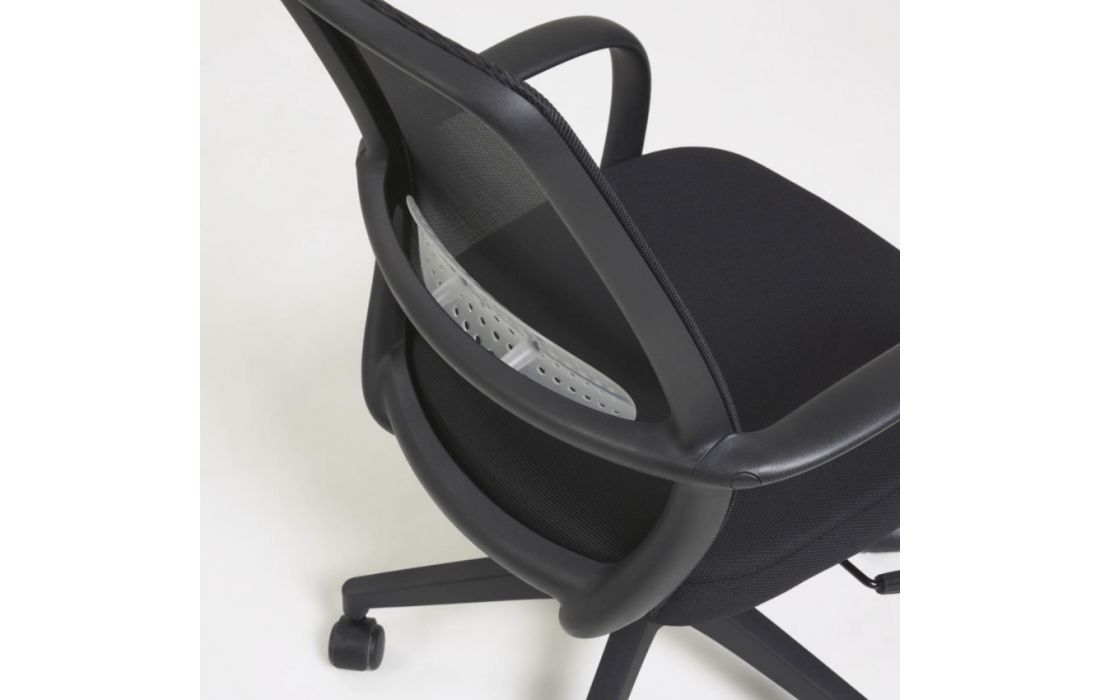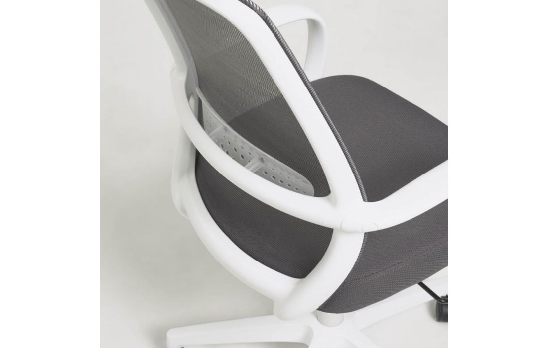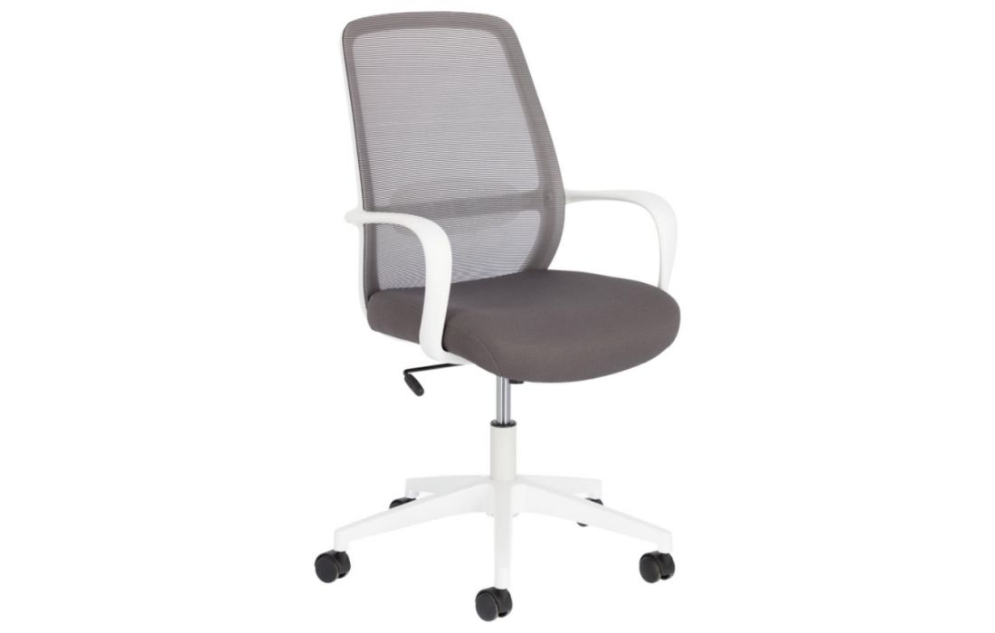Cadeira de escritorio giratória com rodas e altura regulável, disponivel nas cores cinza e preto.