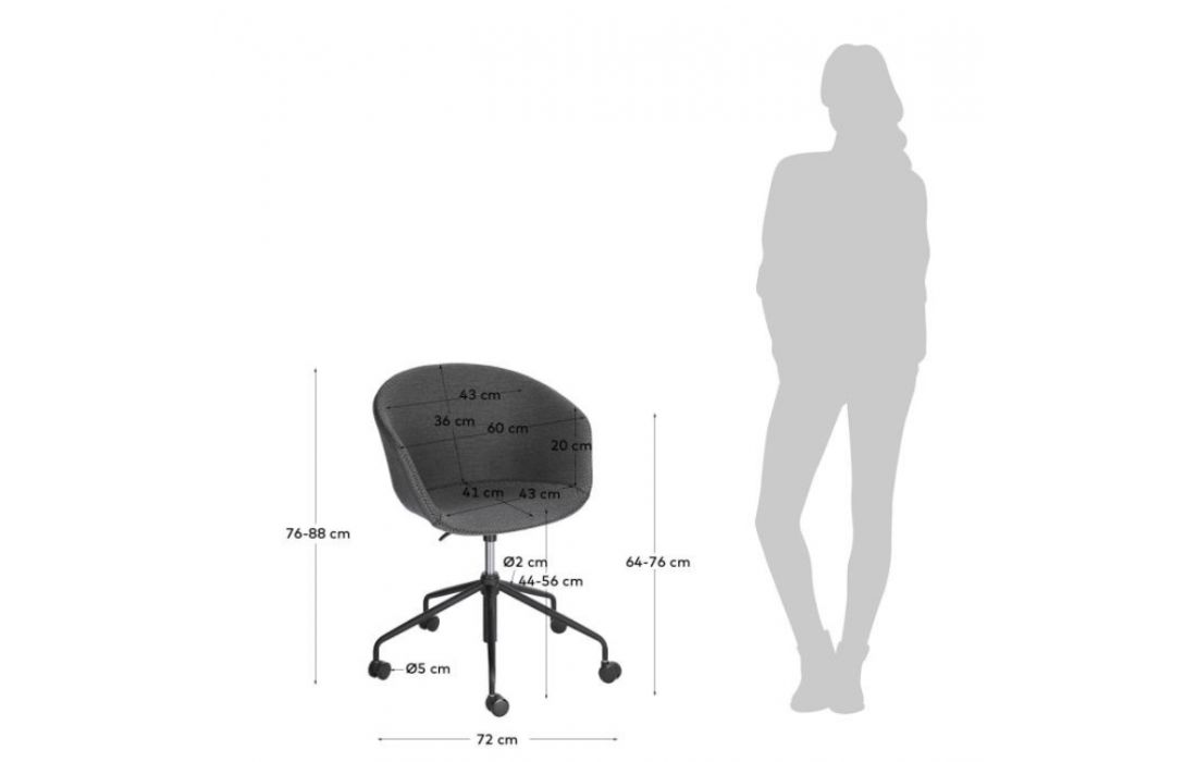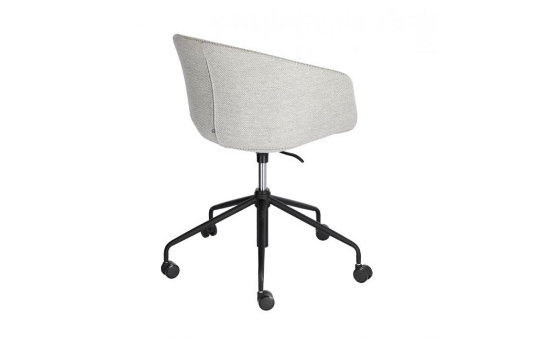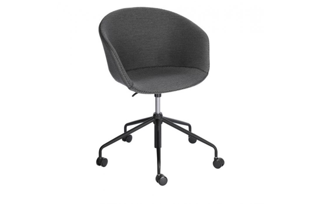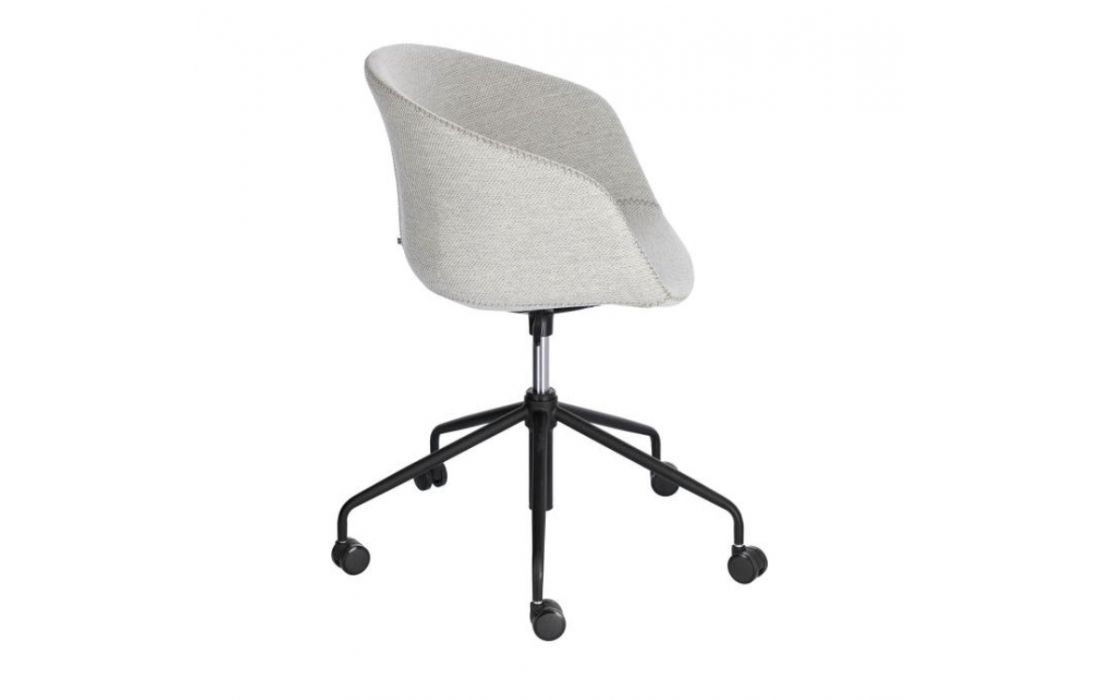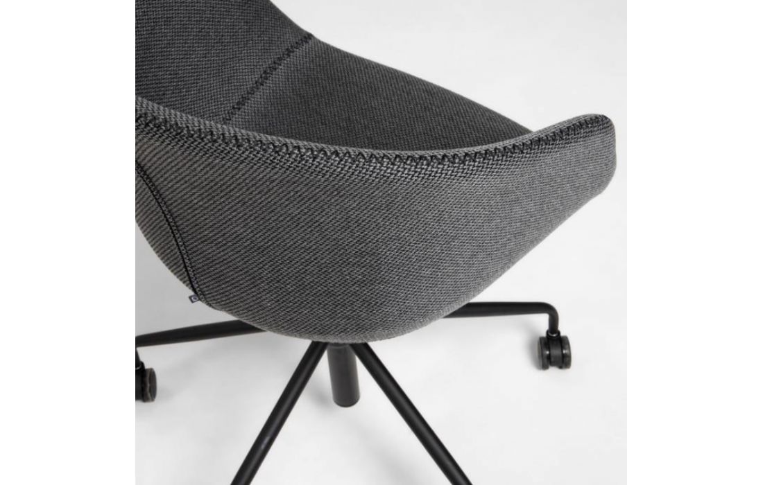 Cadeira de escritorio giratória com rodas pretas e altura regulável.