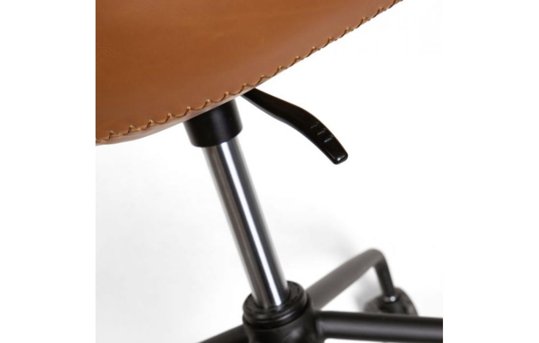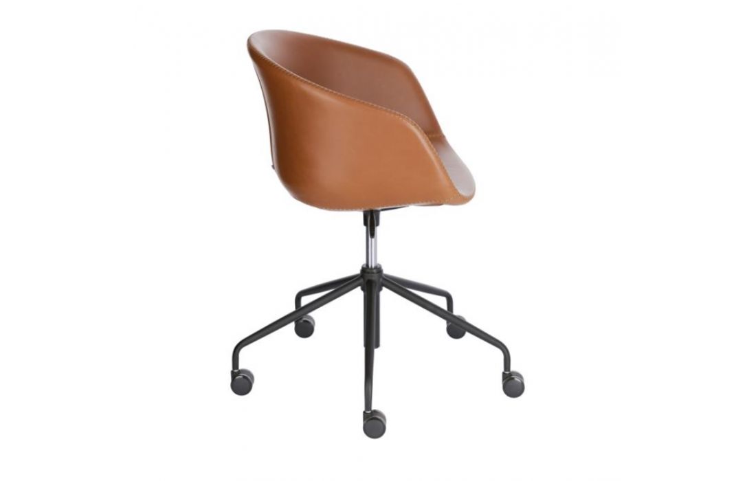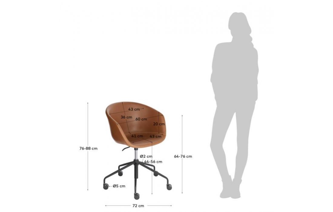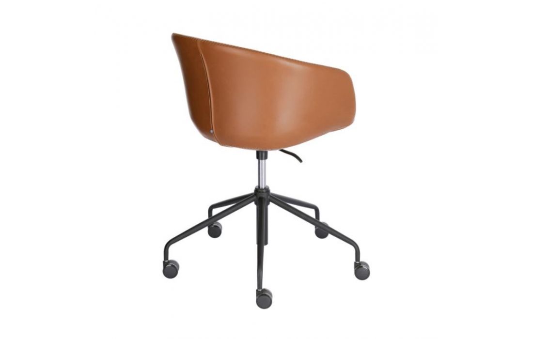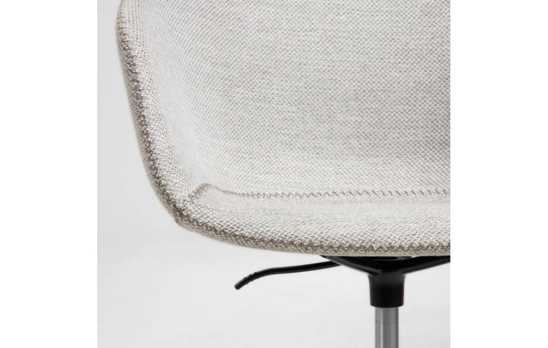 Cadeira de escritorio giratória com rodas pretas e altura regulável.