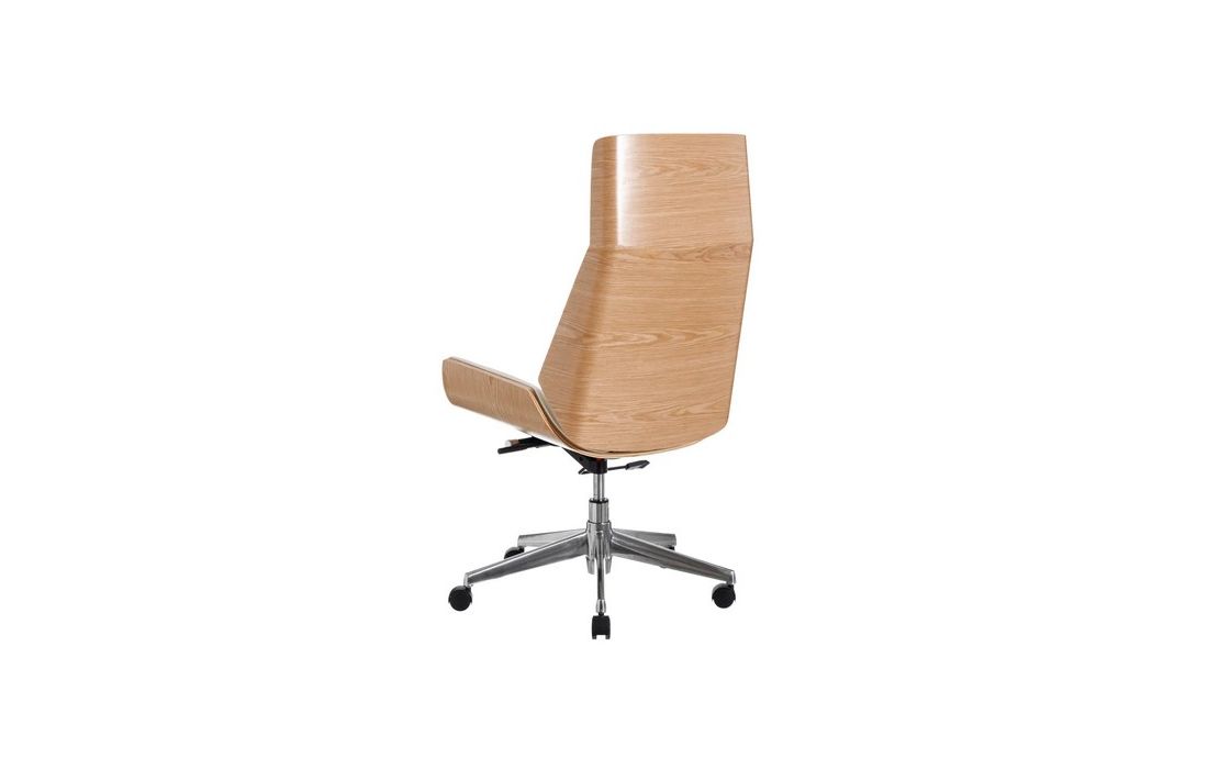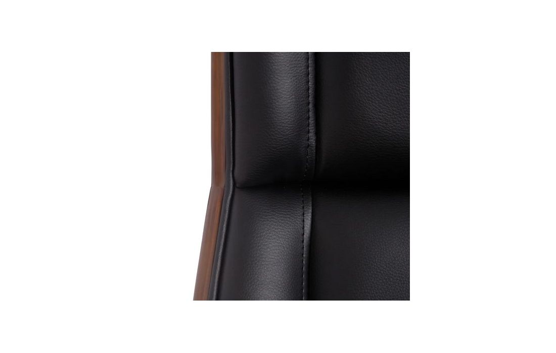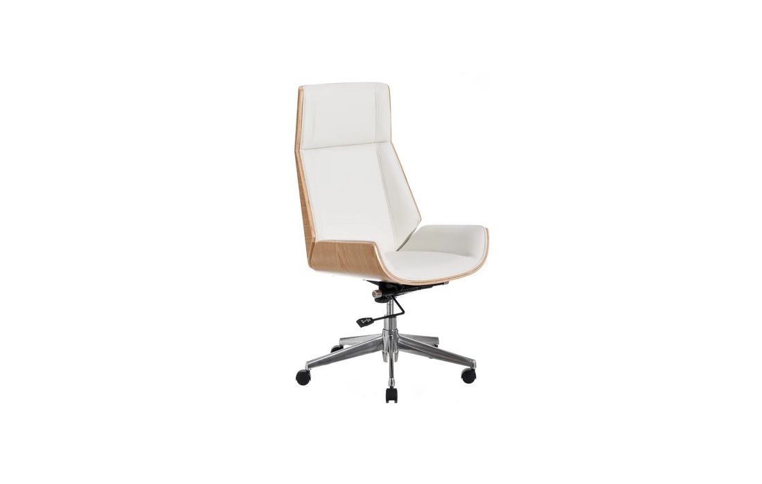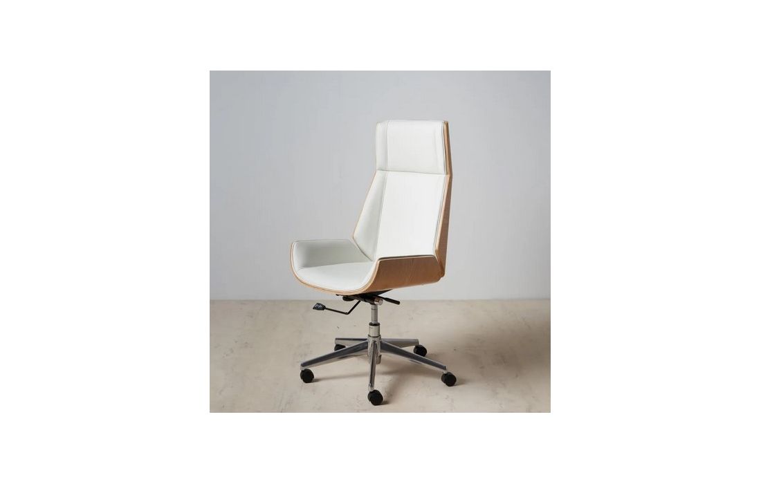 Cadeira de escritorio giratoria em ferro e pele nas cores branco e preto.