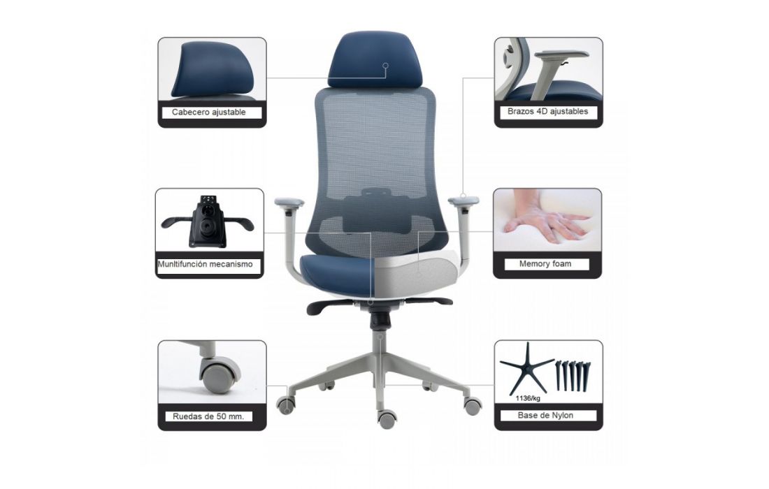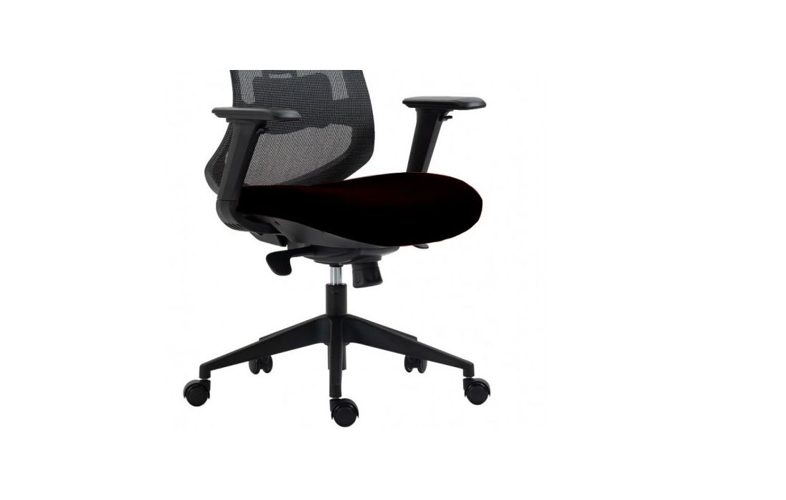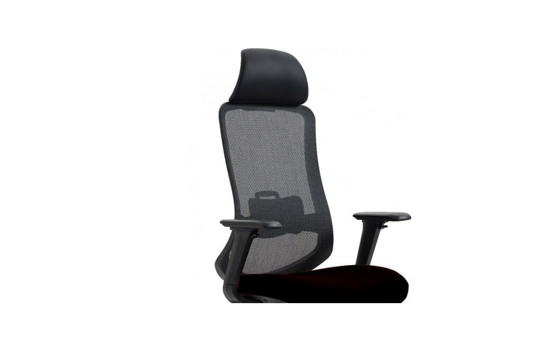 Cadeira de escritório, ergonômica, multifuncional com estrutura de nylon acabamento preto, encosto super alto com cabeceira ajustável, braços ajustáveis em altura, largura, profundidade e lateral, assento estofado em tecido preto e encosto estofado em rede preto translúcida