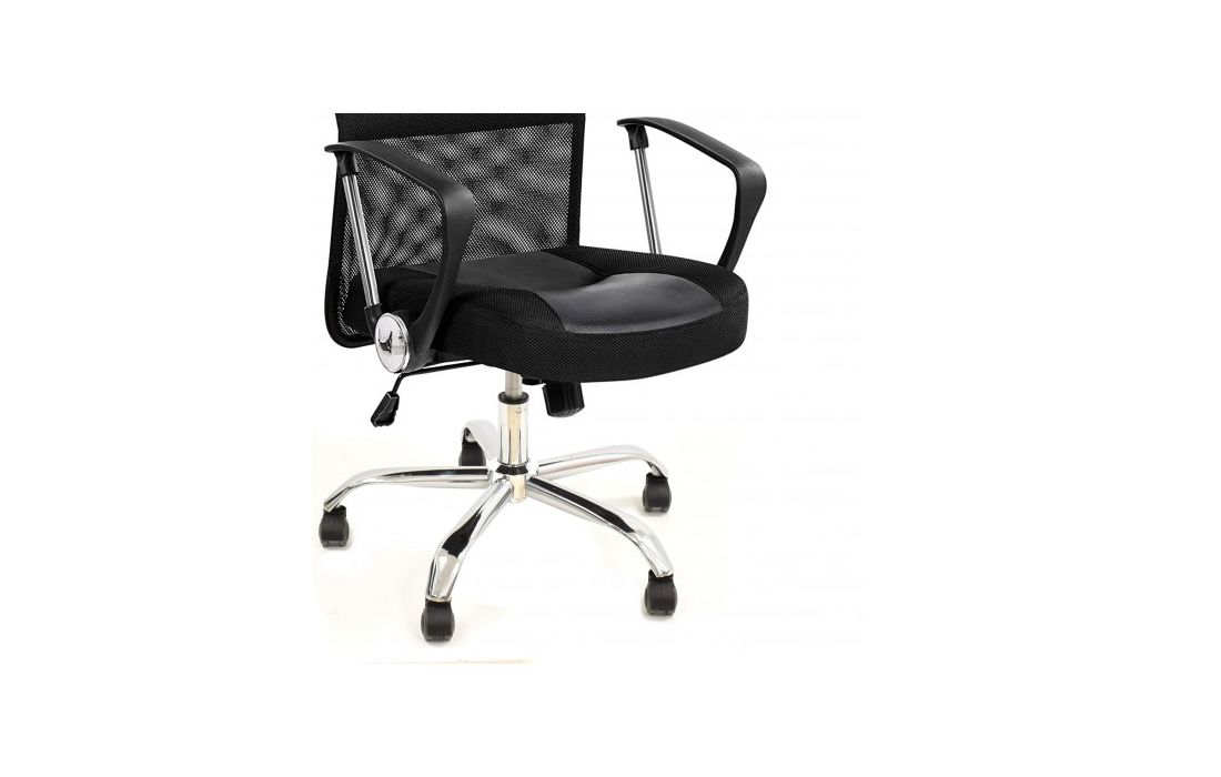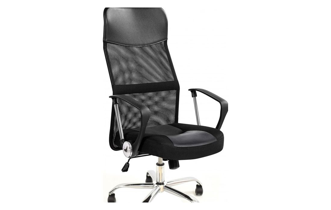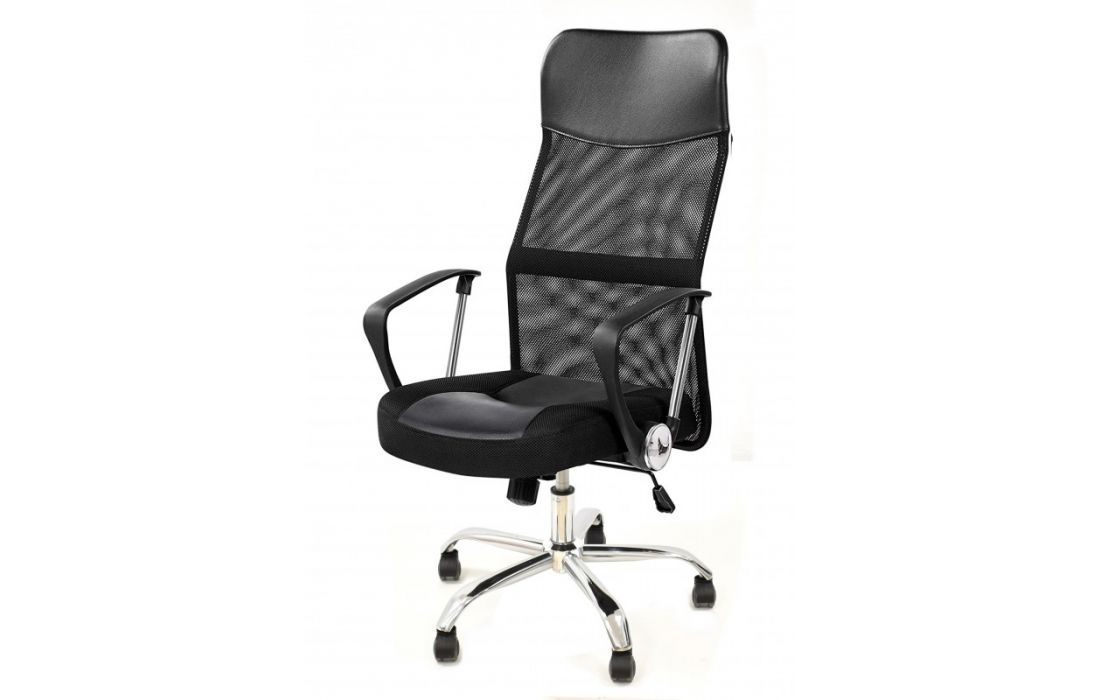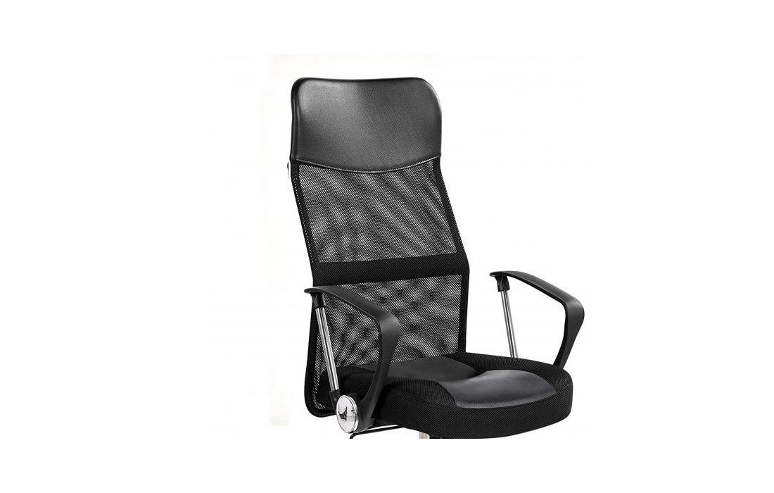 Cadeira de escritório giratoria com mecanismo giratório de inclinação e bloqueio, regulação de altura por sistema de elevação a gás e estofo em rede, pele sintética e tecido preto