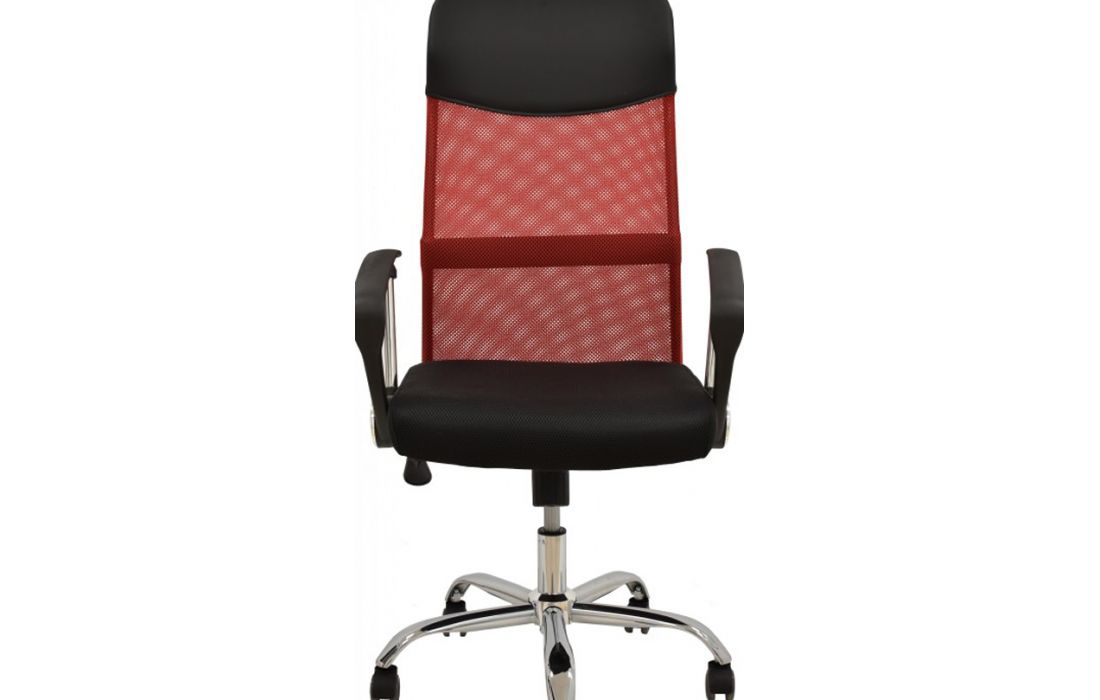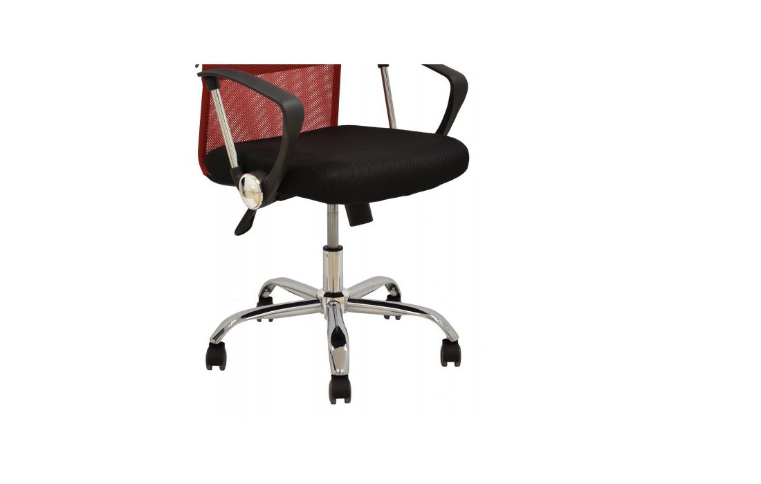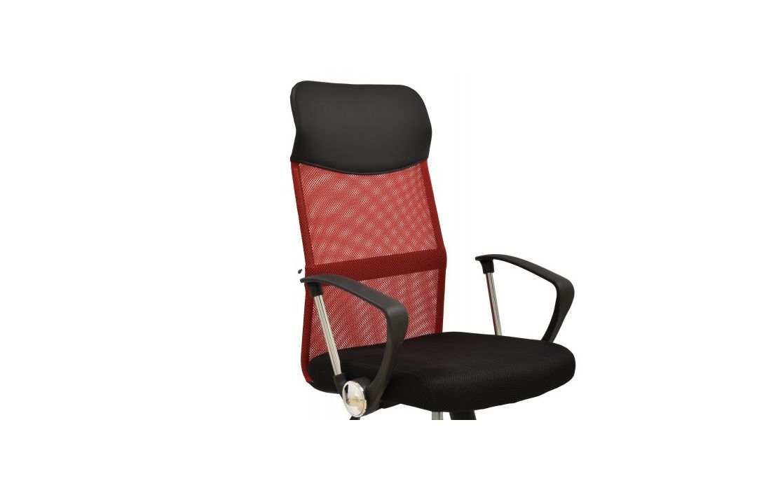 Cadeira de escritório giratoria com mecanismo giratório de inclinação e bloqueio, regulação de altura por sistema de elevação a gás e estofo em rede vermelha e tecido preto