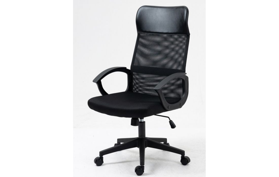 Cadeira de escritório giratoria com mecanismo giratório de elevação a gás com inclinação e bloqueio, estofo em rede preta, cabeceira de pele sintética e assento de tecido preto