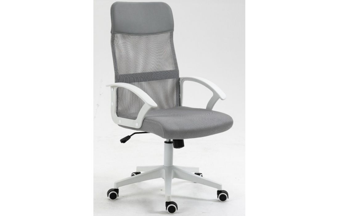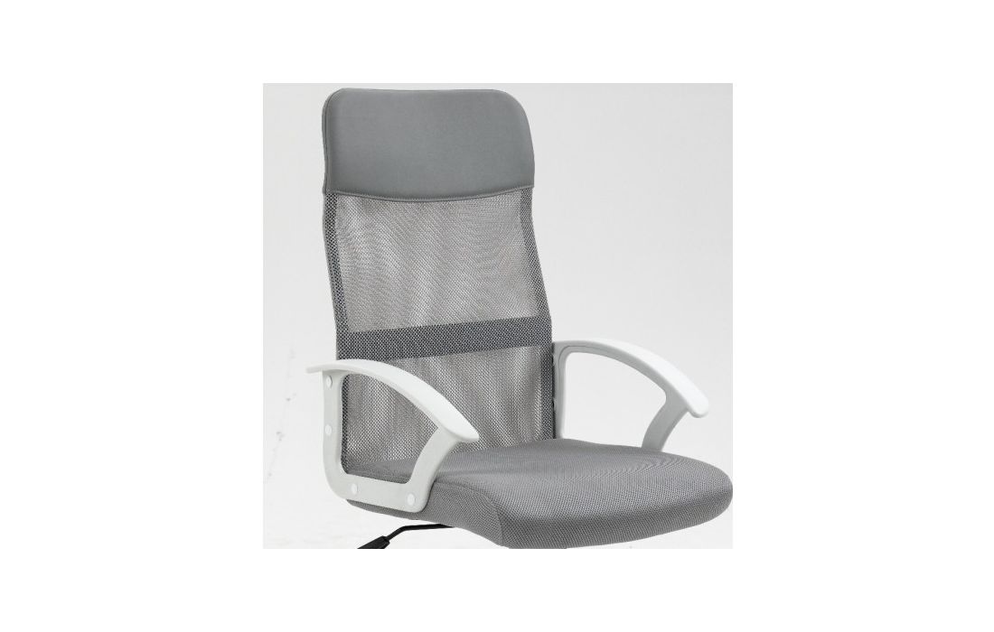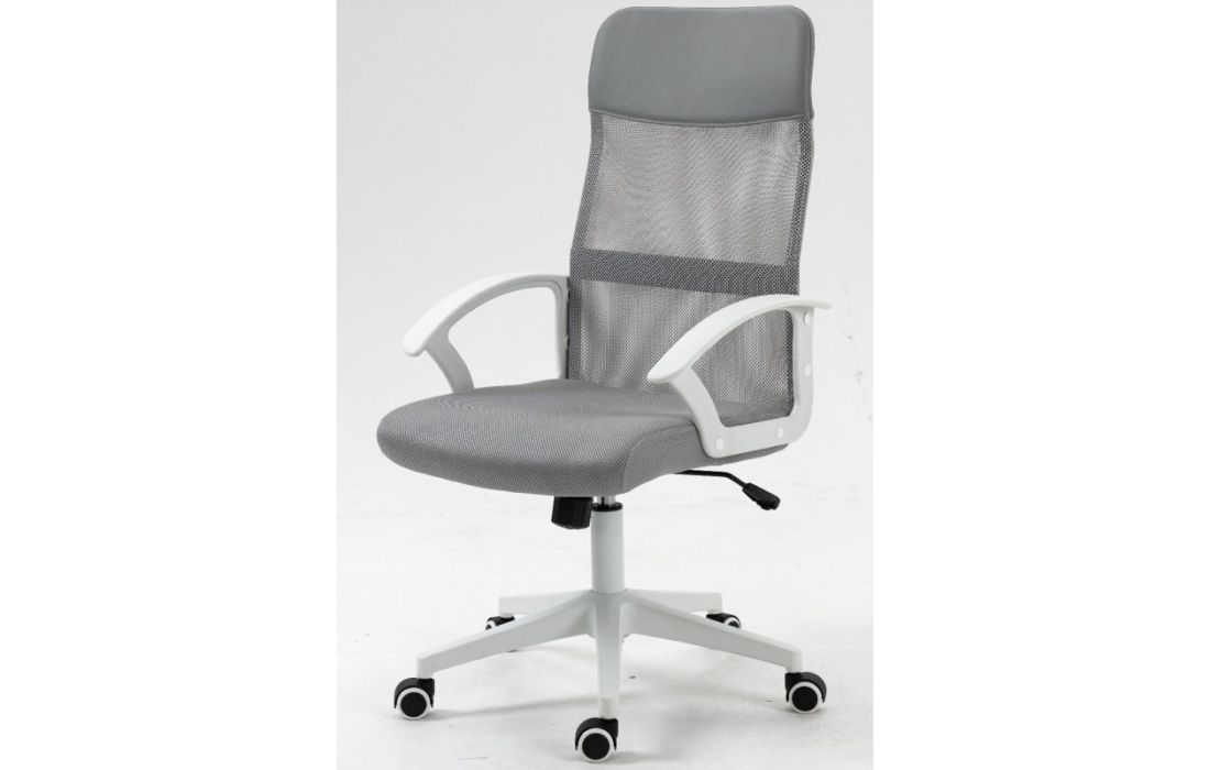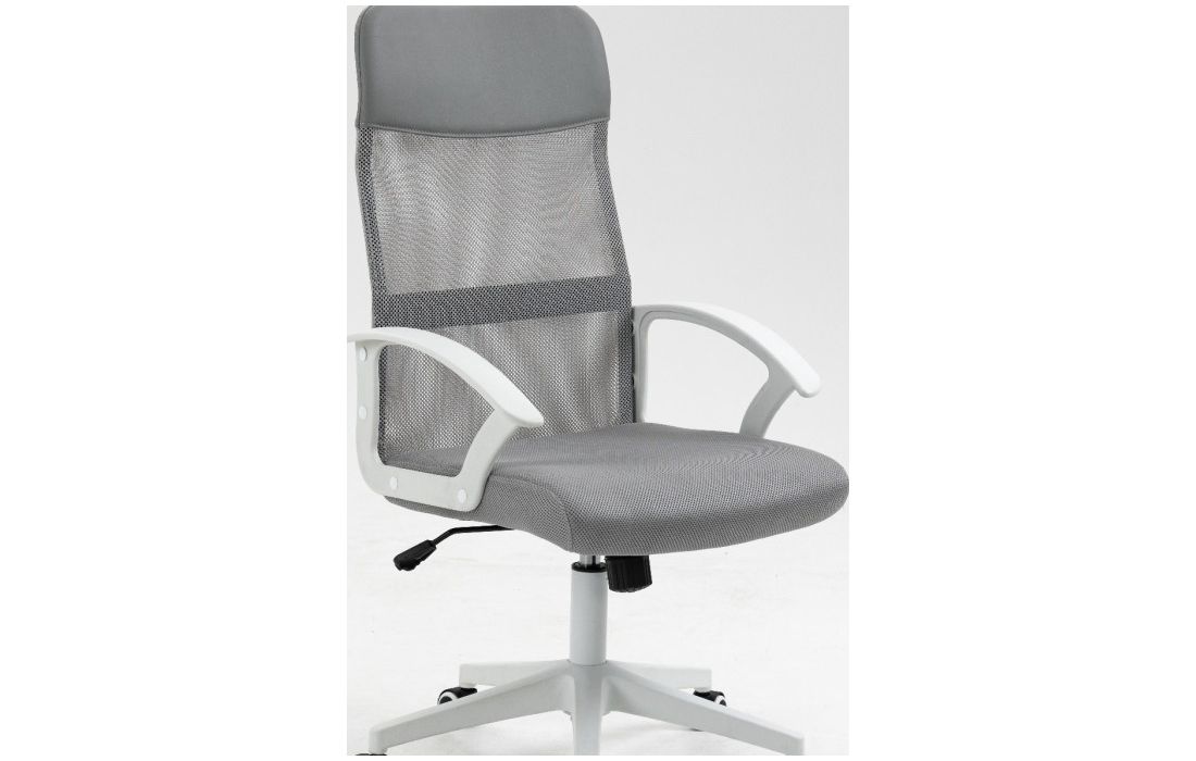 Cadeira de escritório giratoria com mecanismo giratório de elevação a gás com inclinação e bloqueio, estofo em rede cinza, cabeceira de pele sintética e assento de tecido cinza