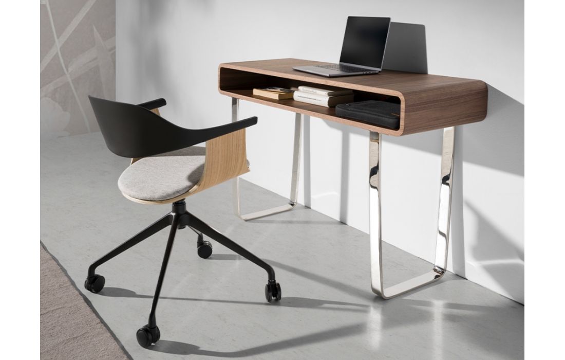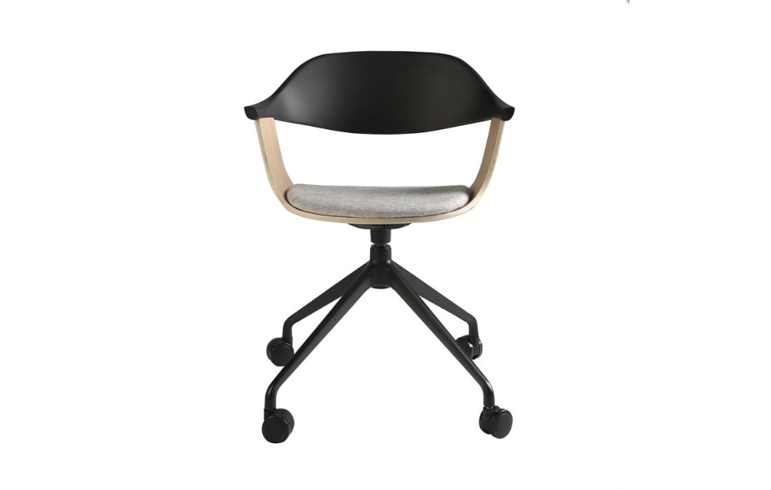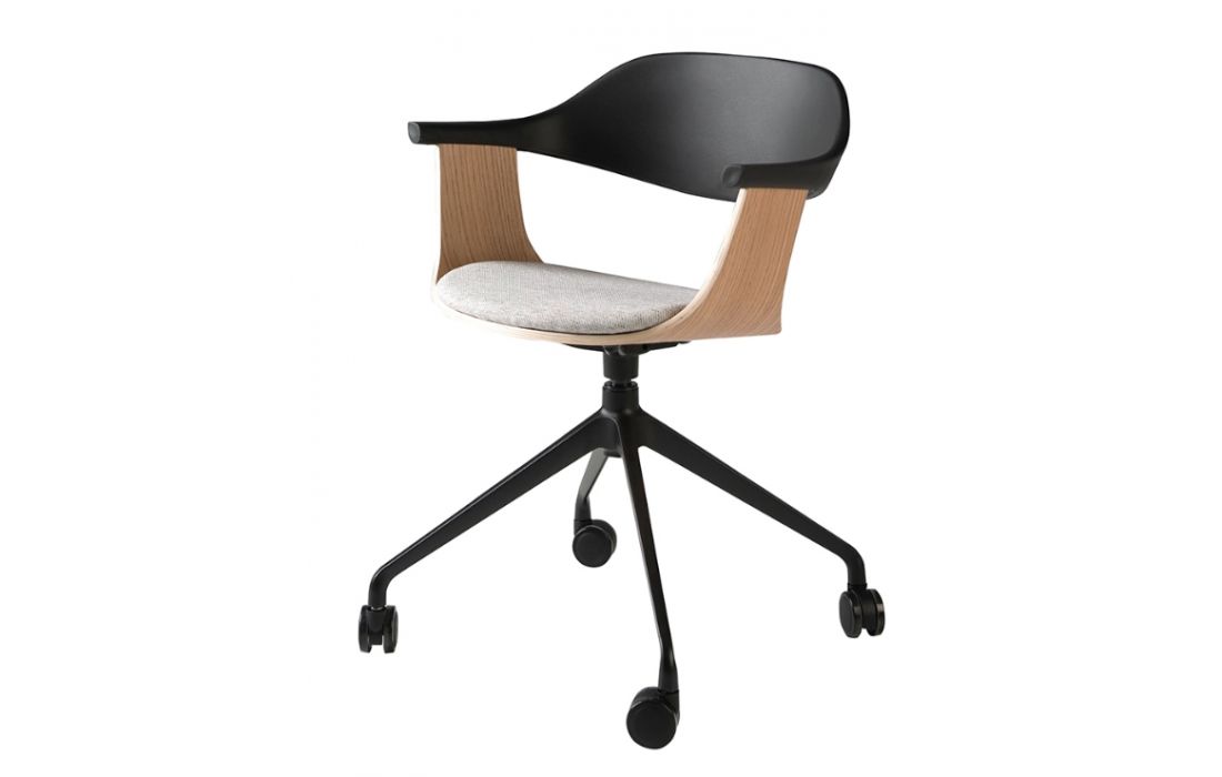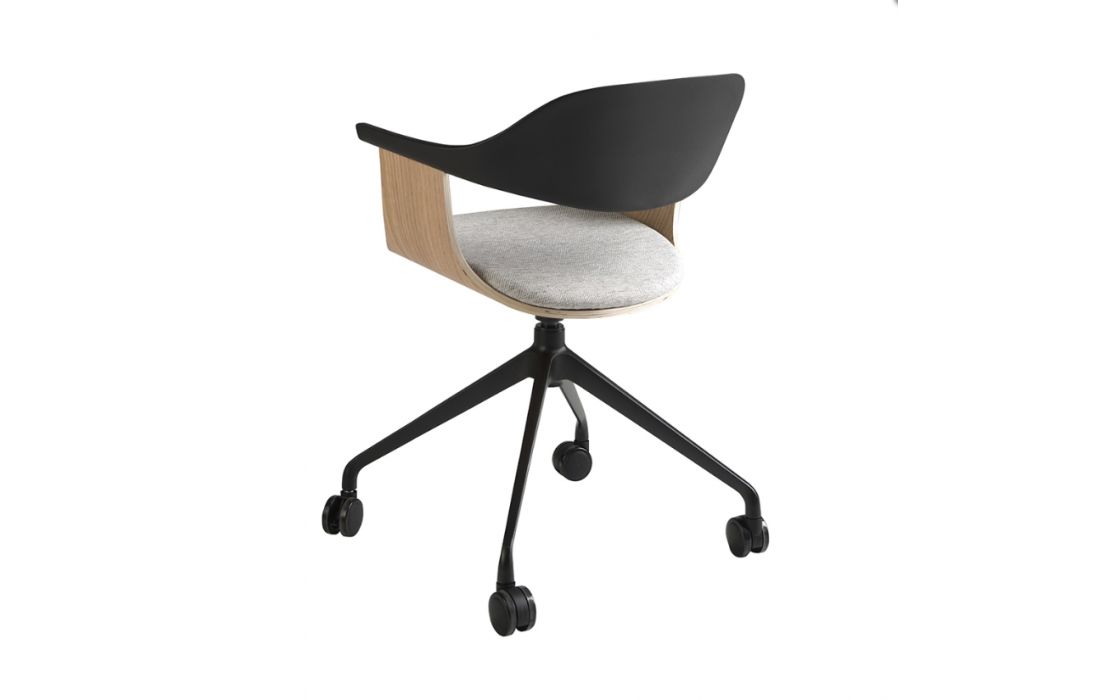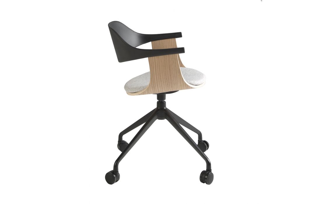 Cadeira de escritório giratória de design moderno com assento estofado em tecido cinza claro e encosto em PVC preto. Possui estrutura e apoios de braços em madeira folheada a carvalho, o que lhe confere maior estabilidade e conforto.