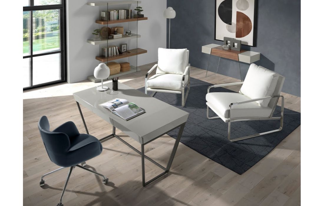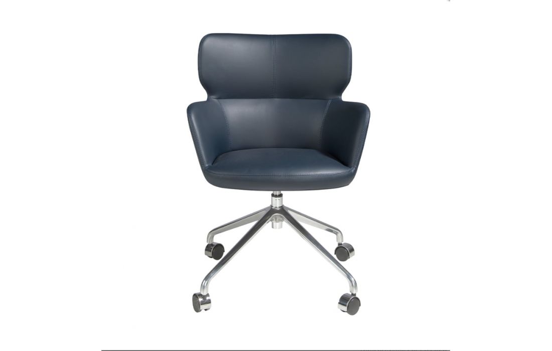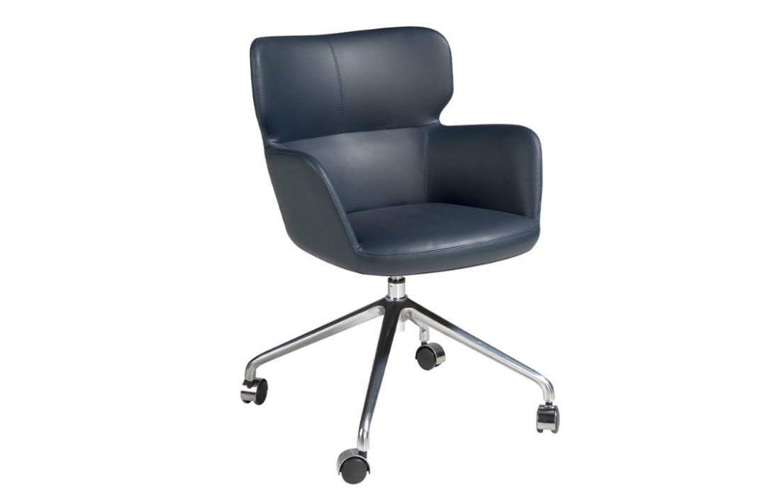 Cadeira de escritório giratória com braços. Estofado em couro sintético azul marinho. Sistema giratório 360º. Estrutura de pernas em aço inoxidável cromado com rodas.