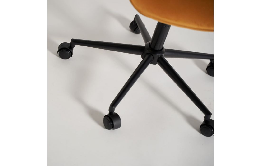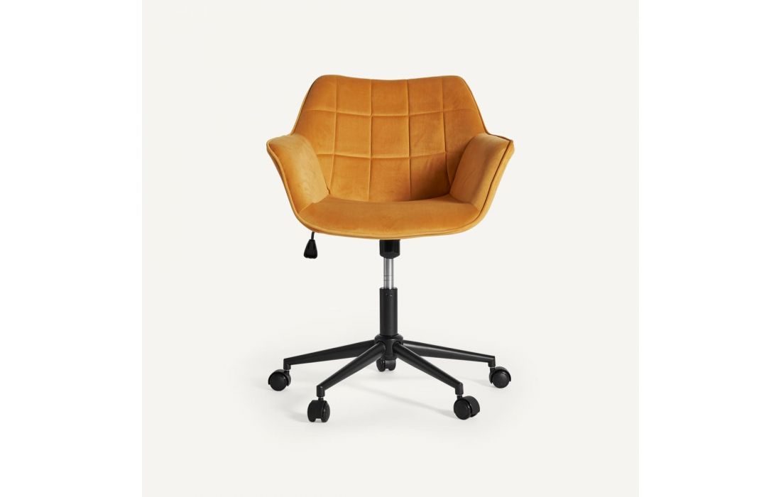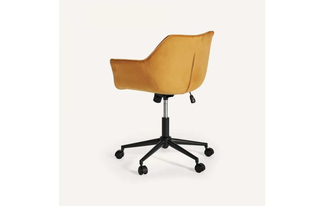 Cadeira de escritório com rodas elevável, estrutura em aço e estofo em tecido aveludado cor mostarda.Destinatário :