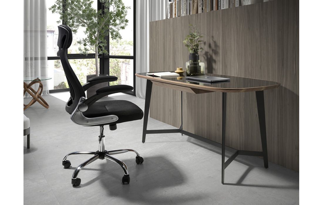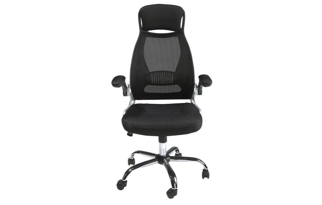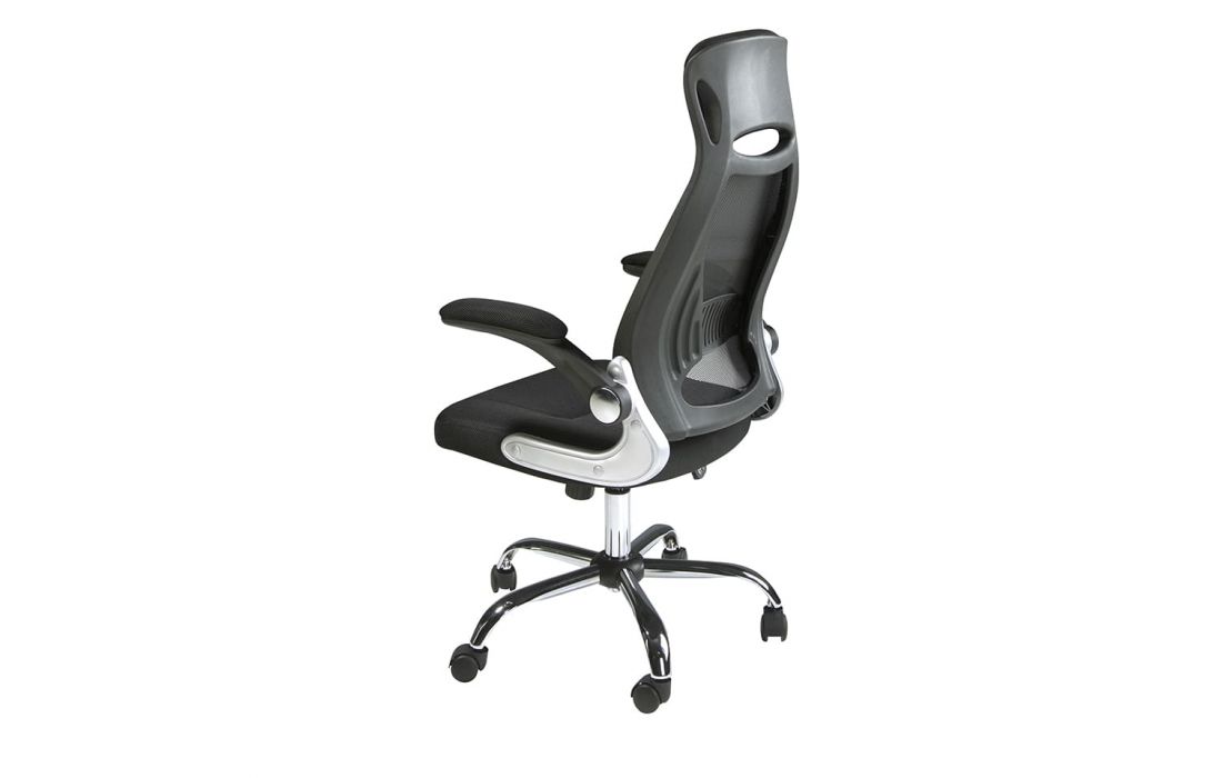 Cadeira de escritório giratória de design moderno com assento e encosto estofados em tecido preto. Possui apoios de braços, assento regulável em altura e pés em aço inoxidável cromado.