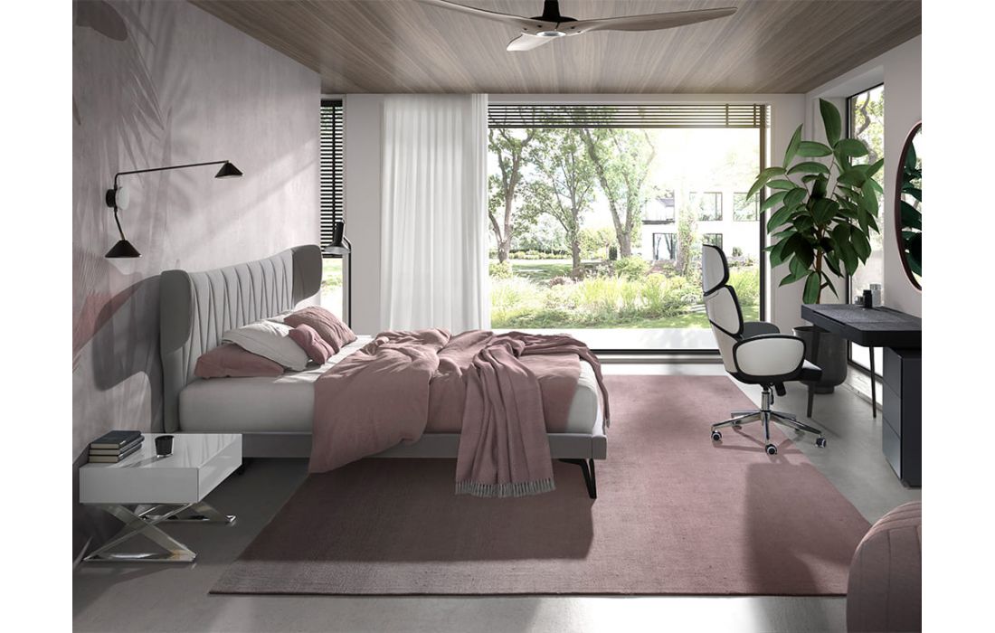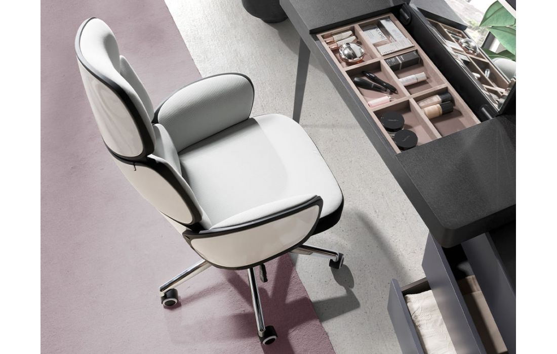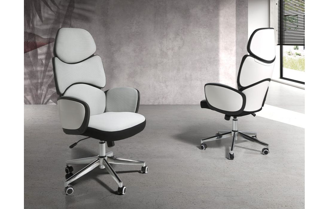 Cadeira de escritório giratória de design moderno com assento estofado em tecido cinza claro e encosto em PVC branco com acabamento brilhante. Possui apoios de braços, pés em aço inoxidável cromado e assento regulável em altura.