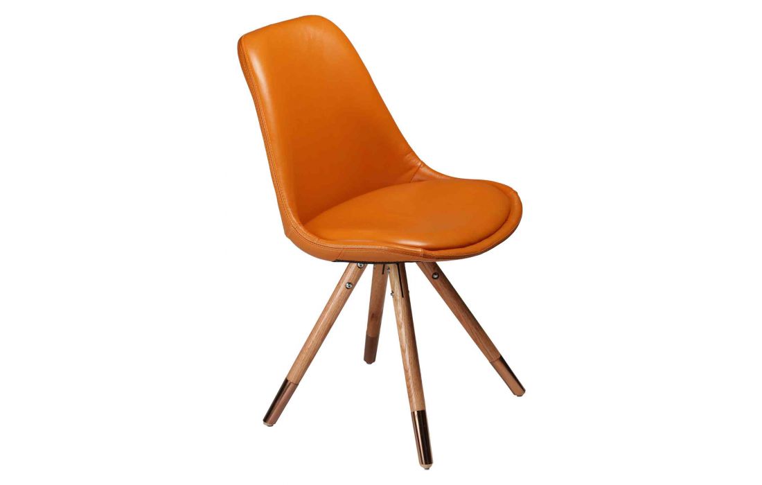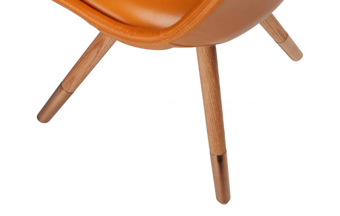Cadeira com estofo em pele genuína laranja, com pés em madeira maciça de carvalho com tampa de metal bronze