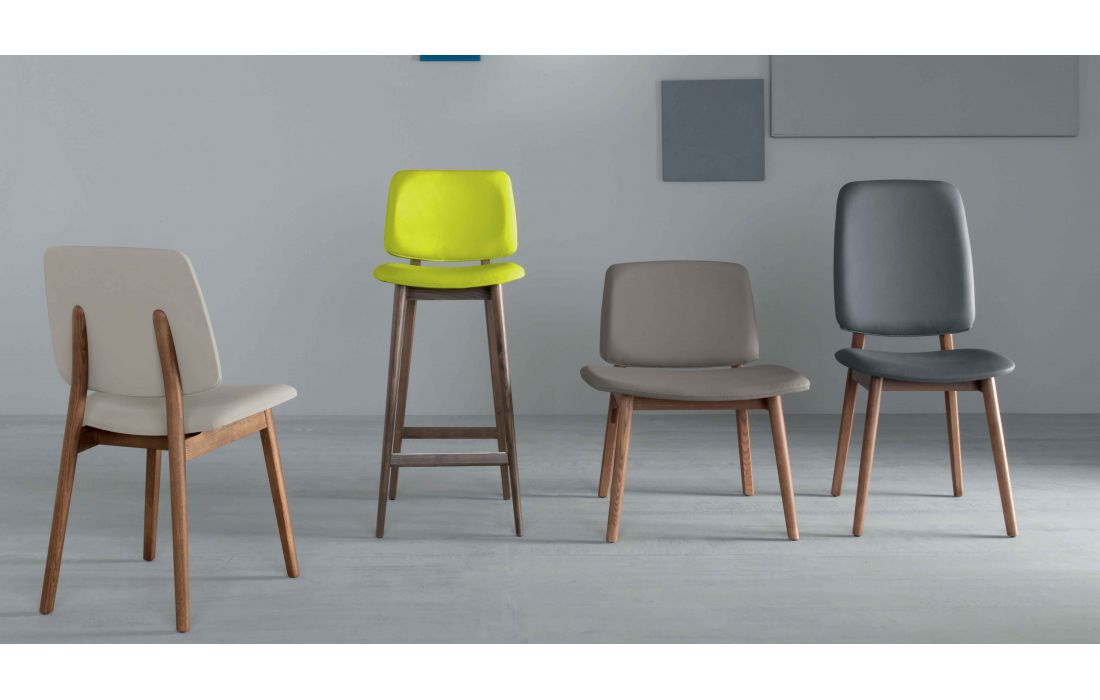 Cadeira com estrutura em nogueira, carvalho ou carvalho queimado com assento e encosto revestido em pele sintética, tecido ou pele genuína