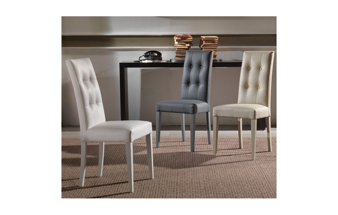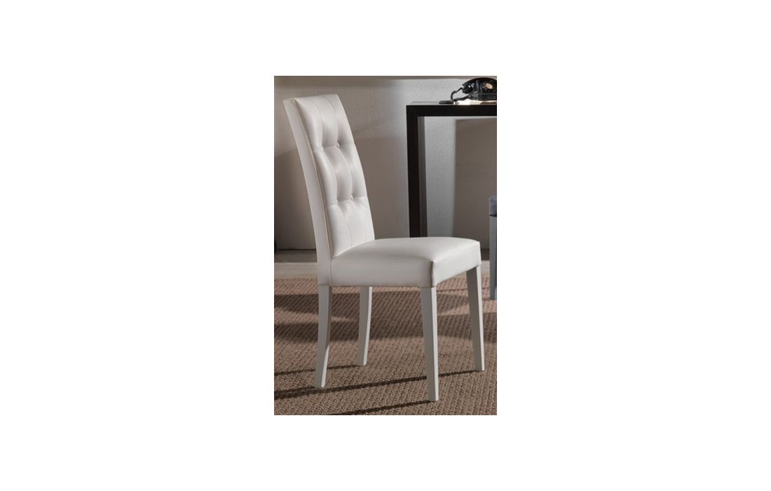 Cadeira com estrutura em madeira maciça de faia, lacada em branco, assento e costa em pele sintética branca.
