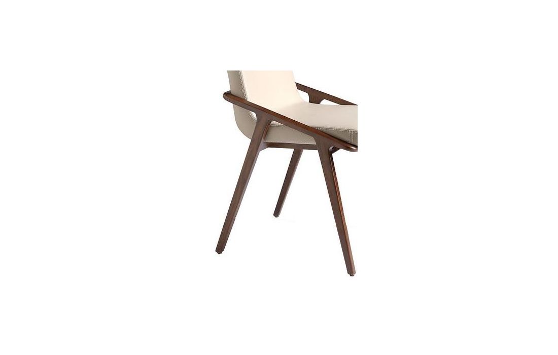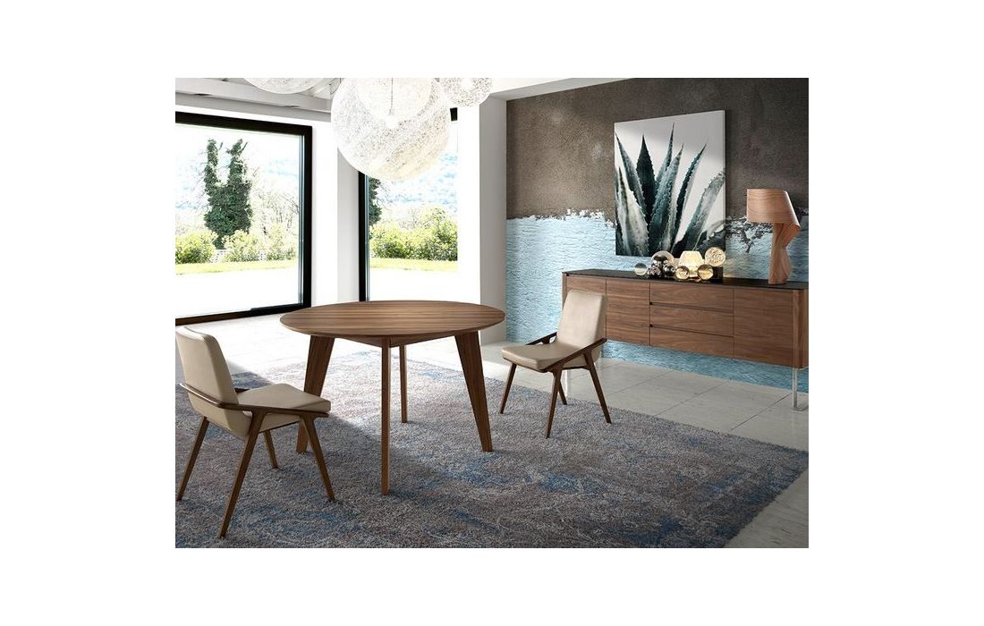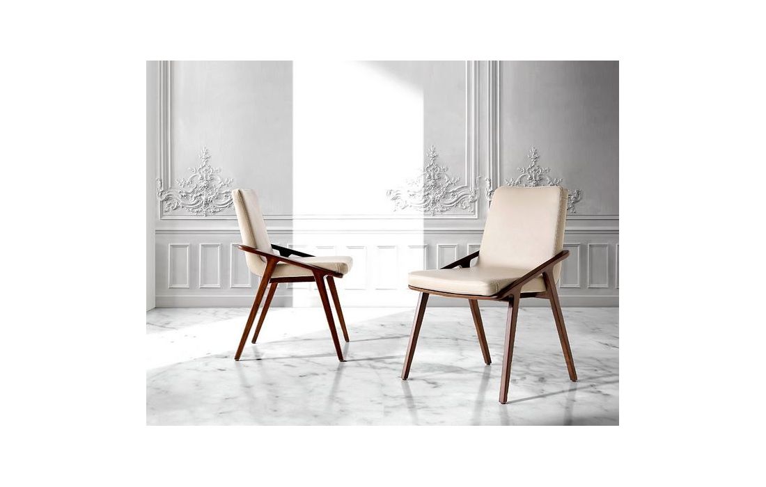Cadeira de design moderno com assento e encosto estofados em pele sintética e as suas pernas de madeira na cor nogueira, com o seu estilo vanguardista e intemporalDestinatário :