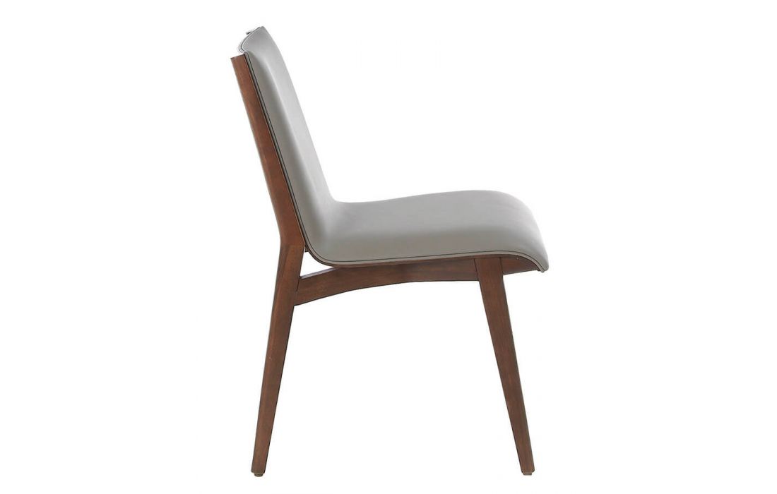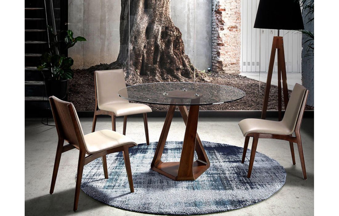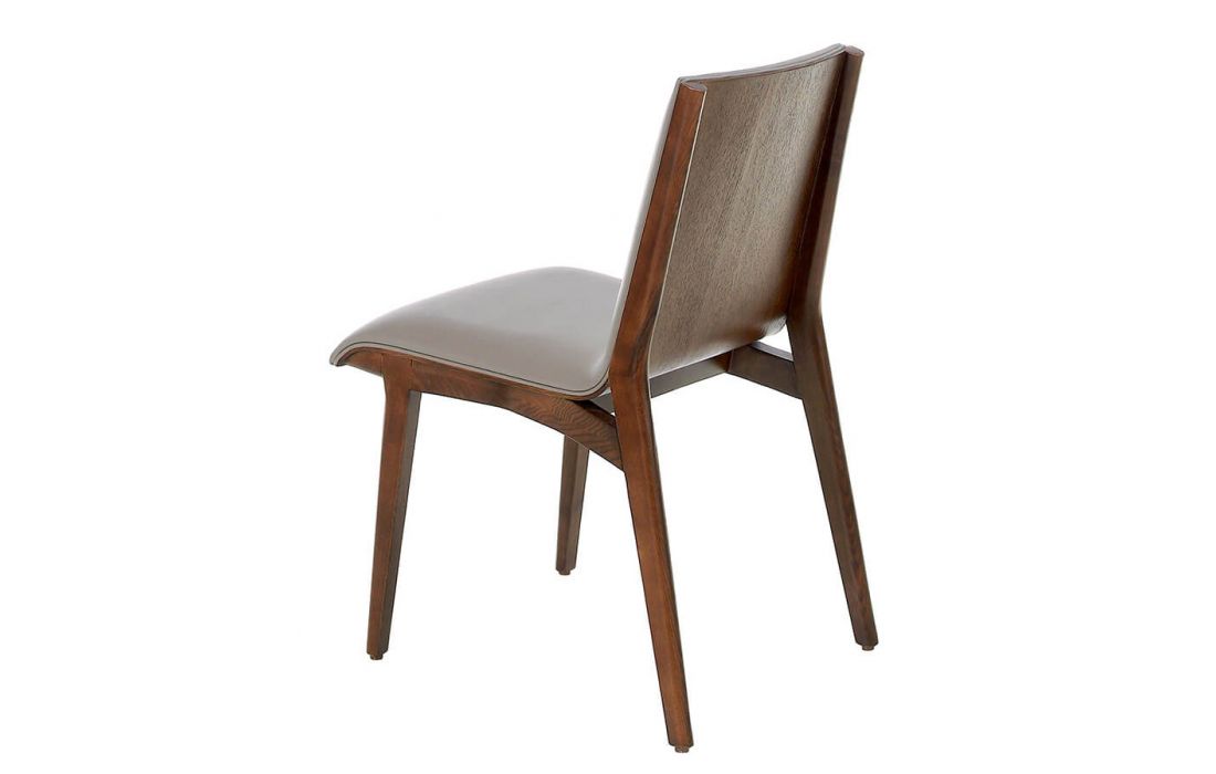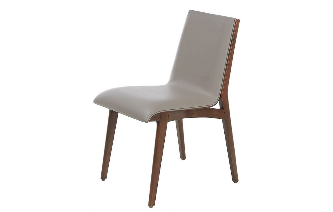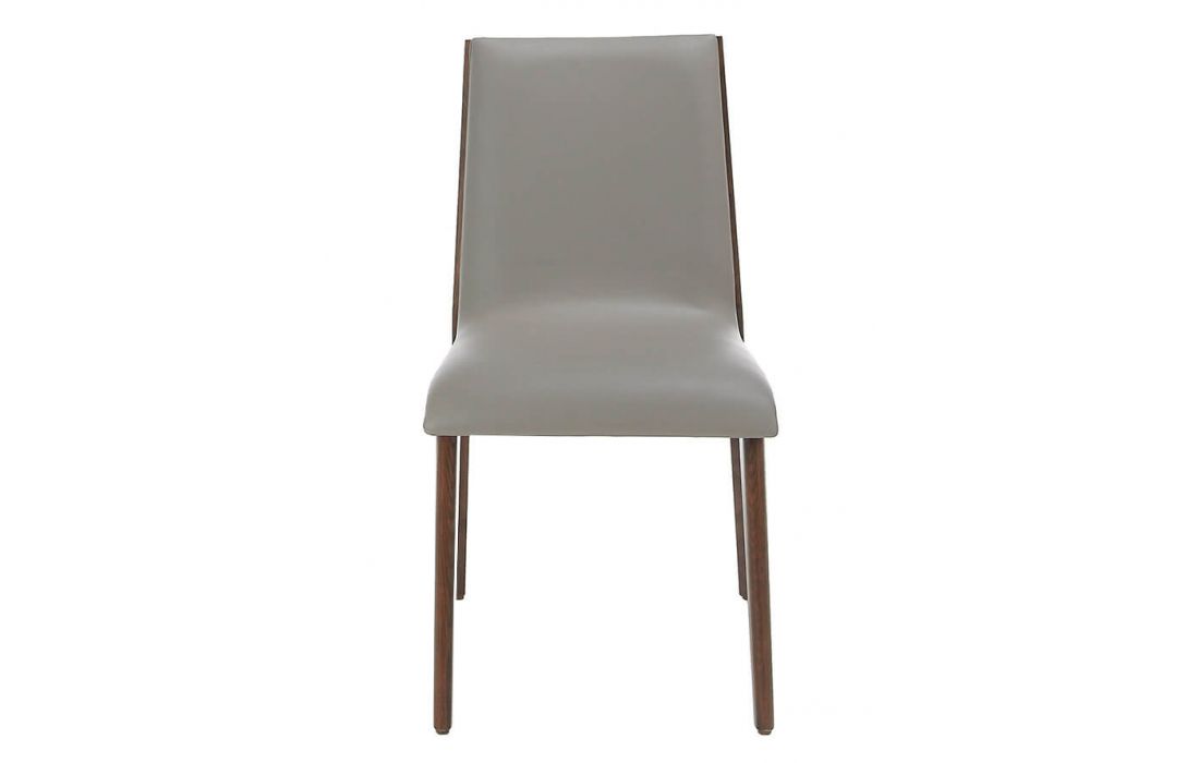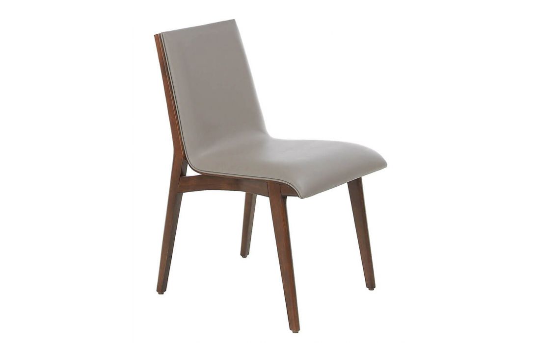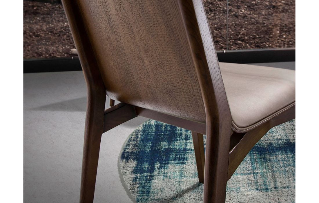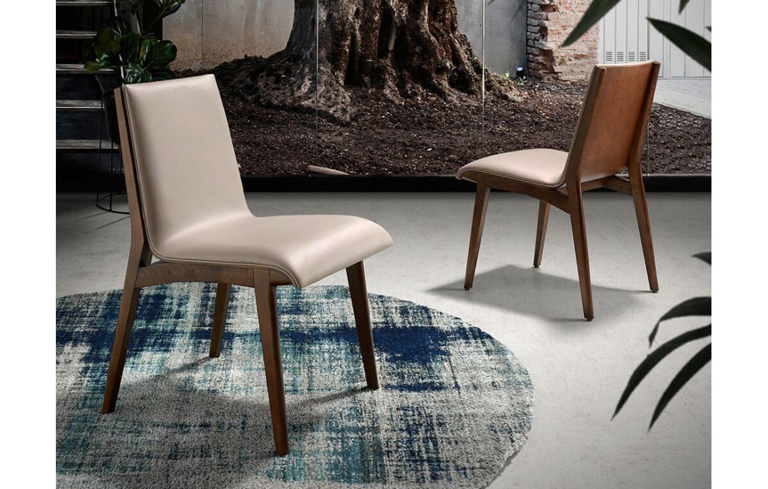 Cadeira de design moderno com assento e encosto estofados em pele sintética e as suas pernas de madeira na cor nogueira, com o seu estilo vanguardista e intemporalDestinatário :