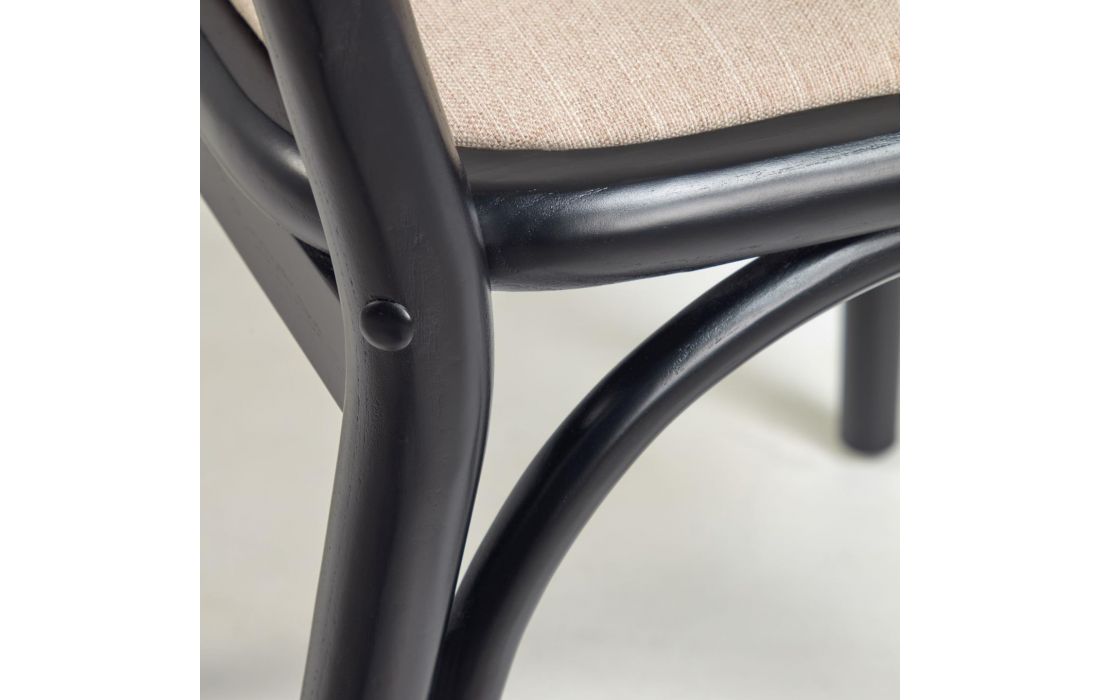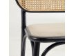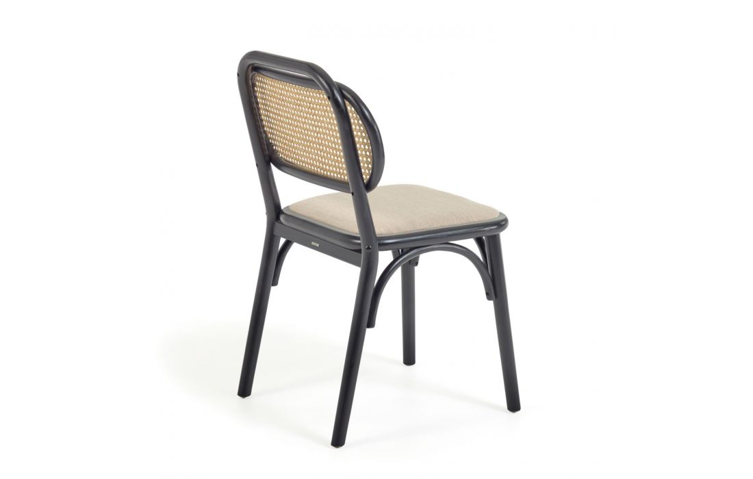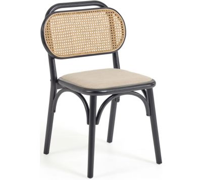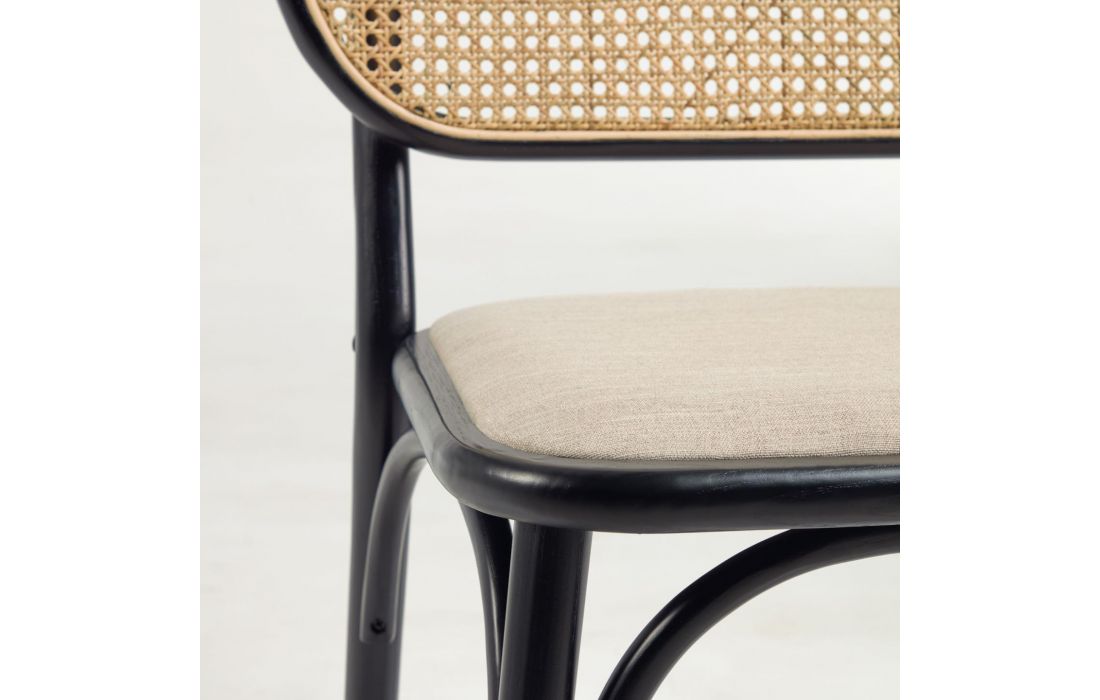 Cadeira em madeira maciça de olmo, acabamento lacado preto, encosto em palhinha e assento em tecido.Destinatário :