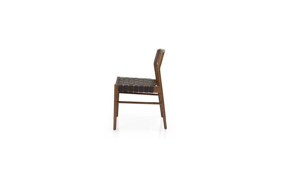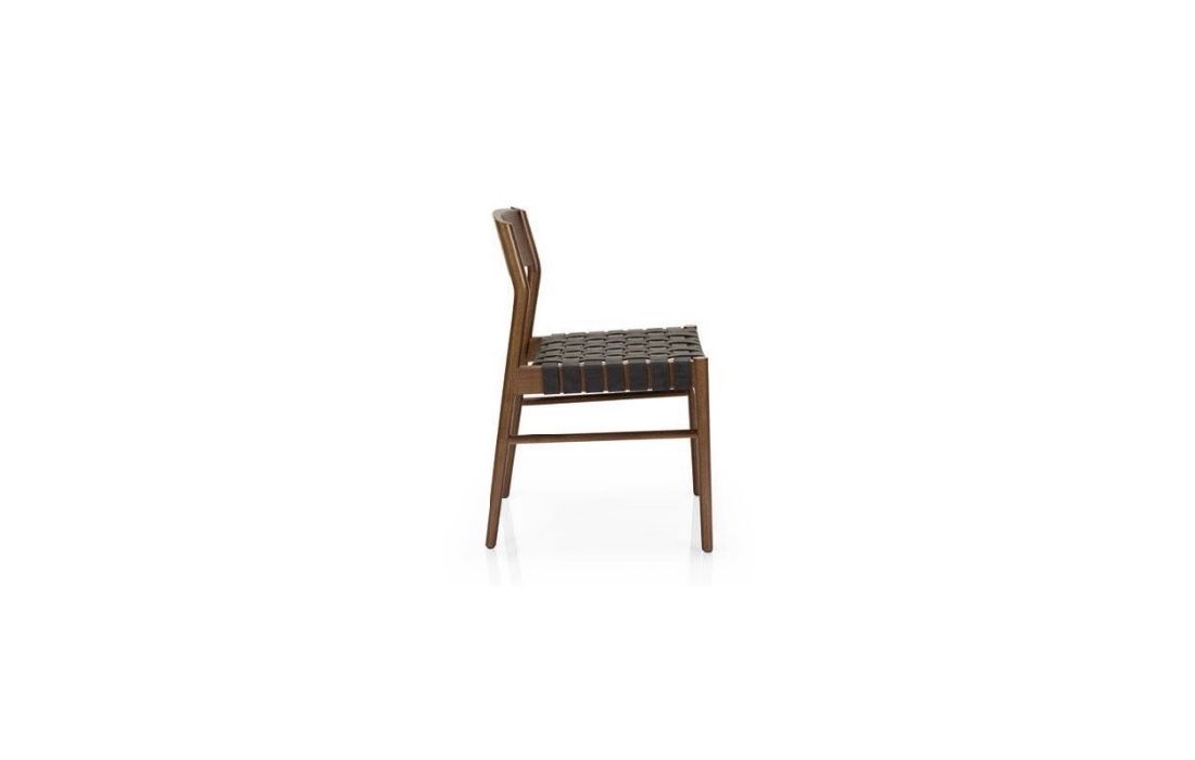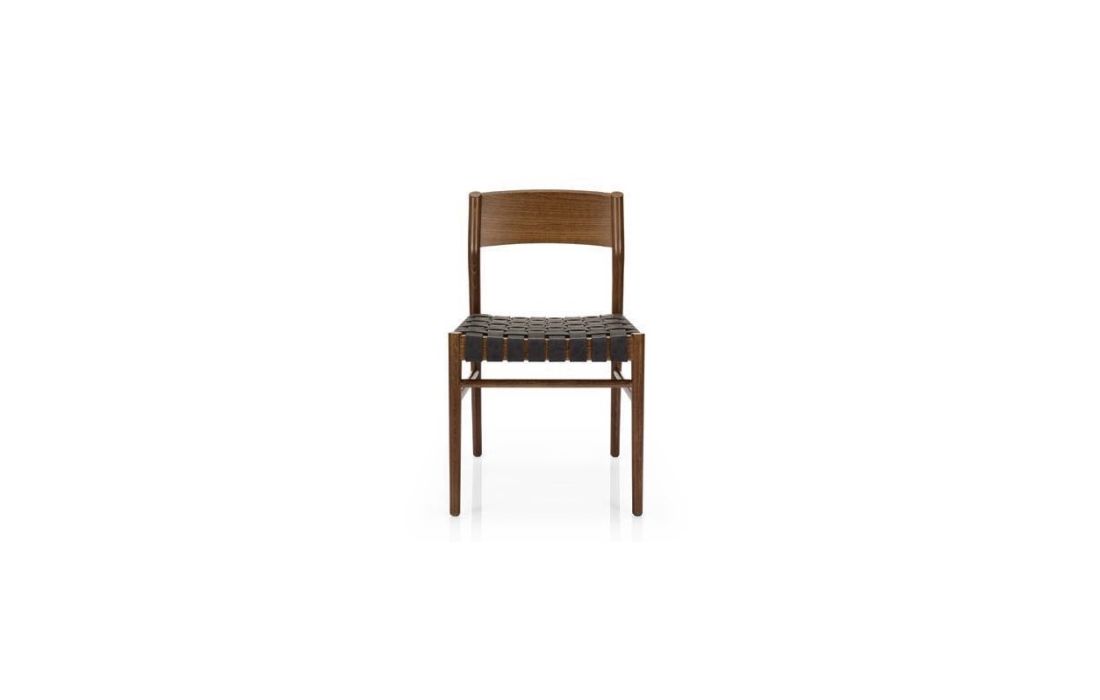 Cadeira de jantar estofada em pele sintética e estrutura de pernas em madeira de faia.
