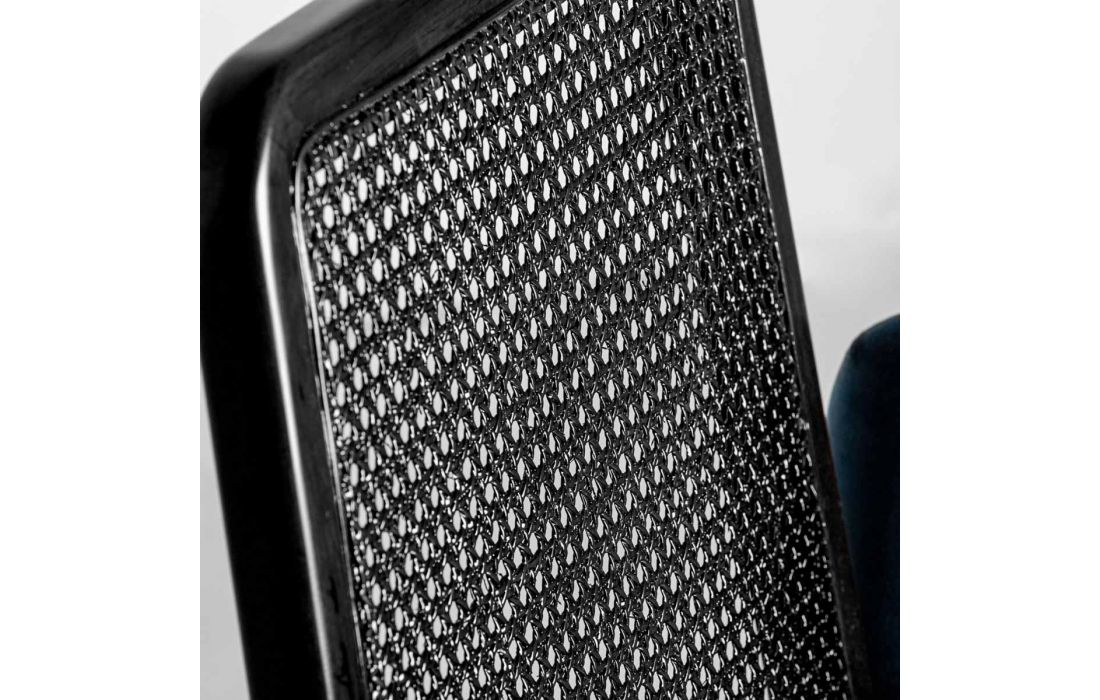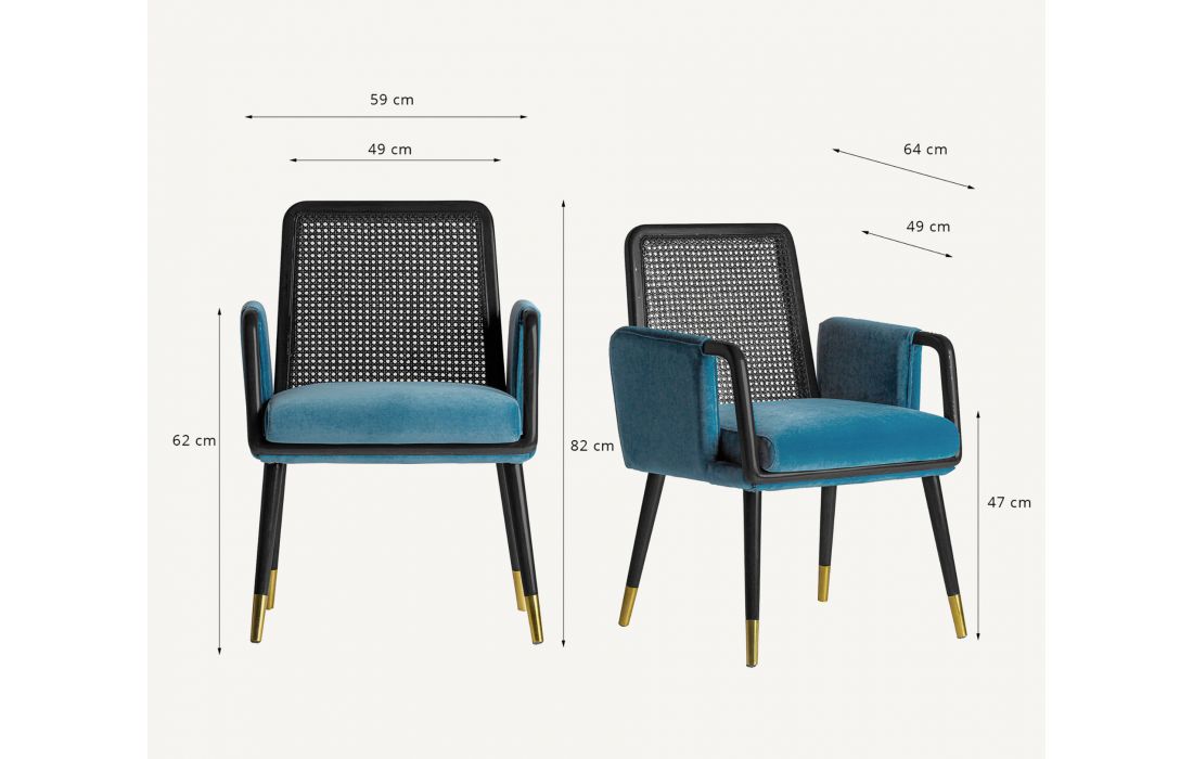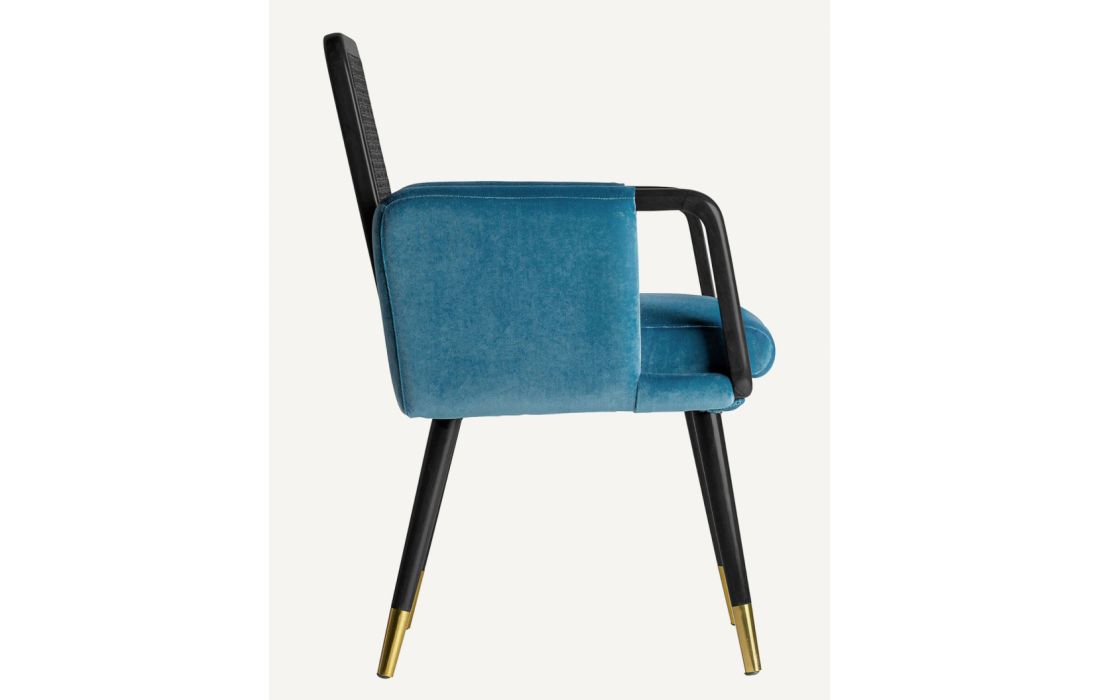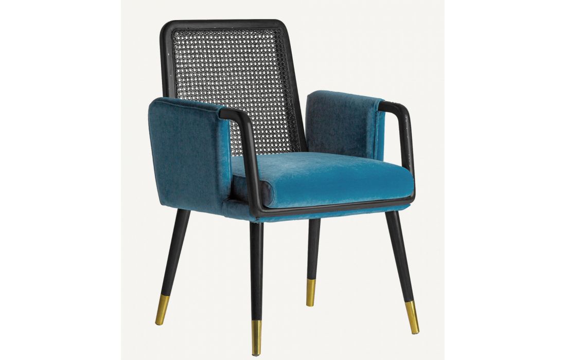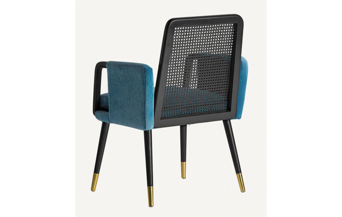 Cadeira de braços com estrutura em madeira de nogueira com pormenor em metal dourado nos pés e ratan na costa esofada em tecido de veludo cor azul