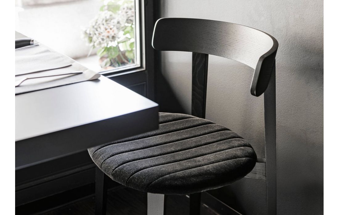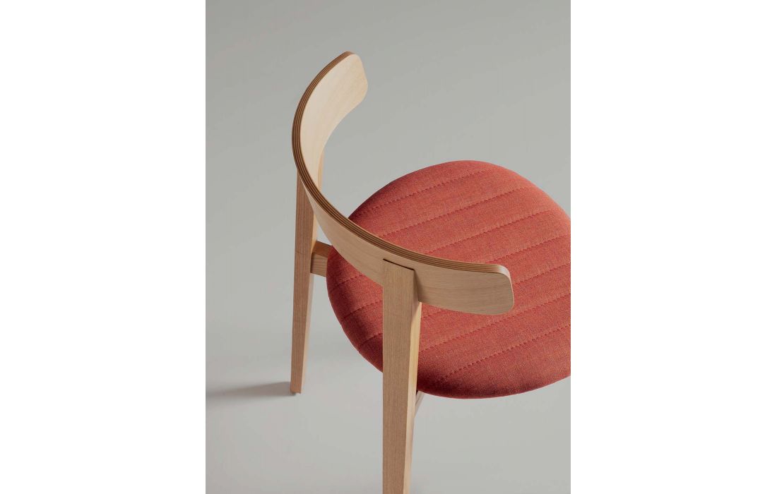 Cadeira com estrutura em madeira e assento revestido a tecido.
