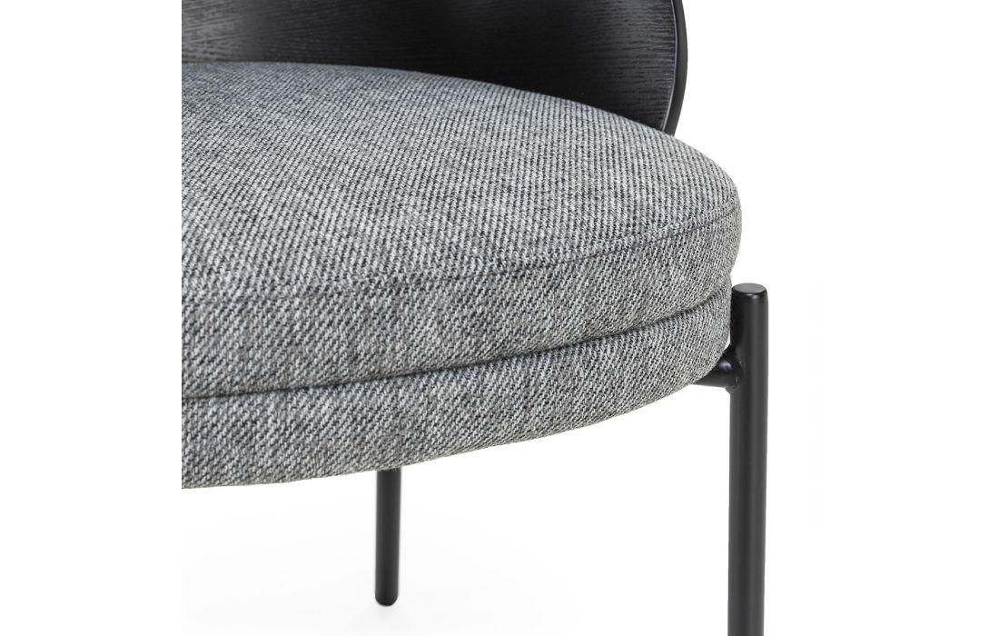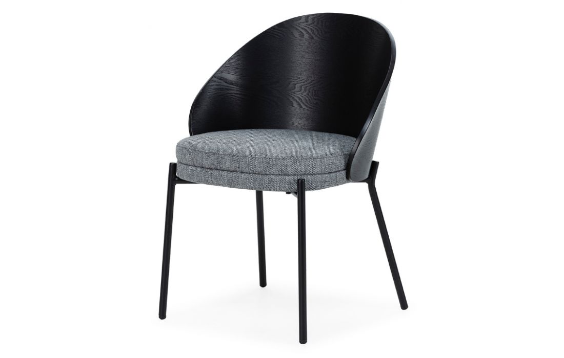 Cadeira em madeira de cor preta, com estofo em tecido cinzento e com os pés em metal preto.