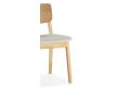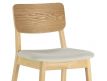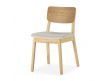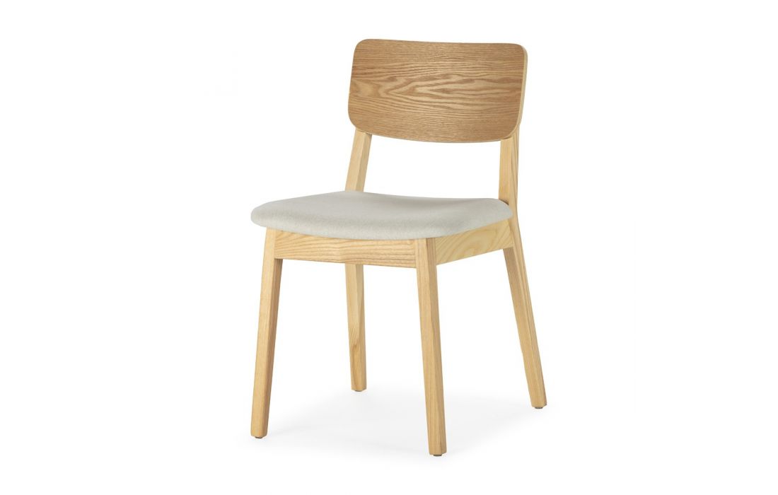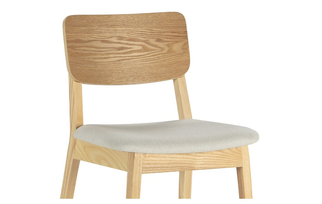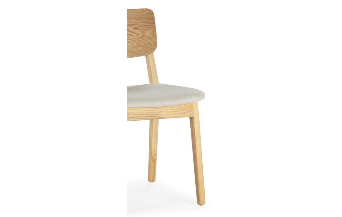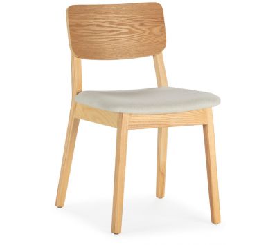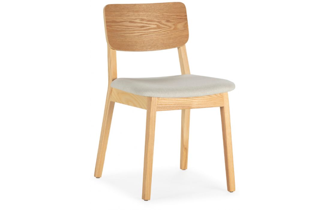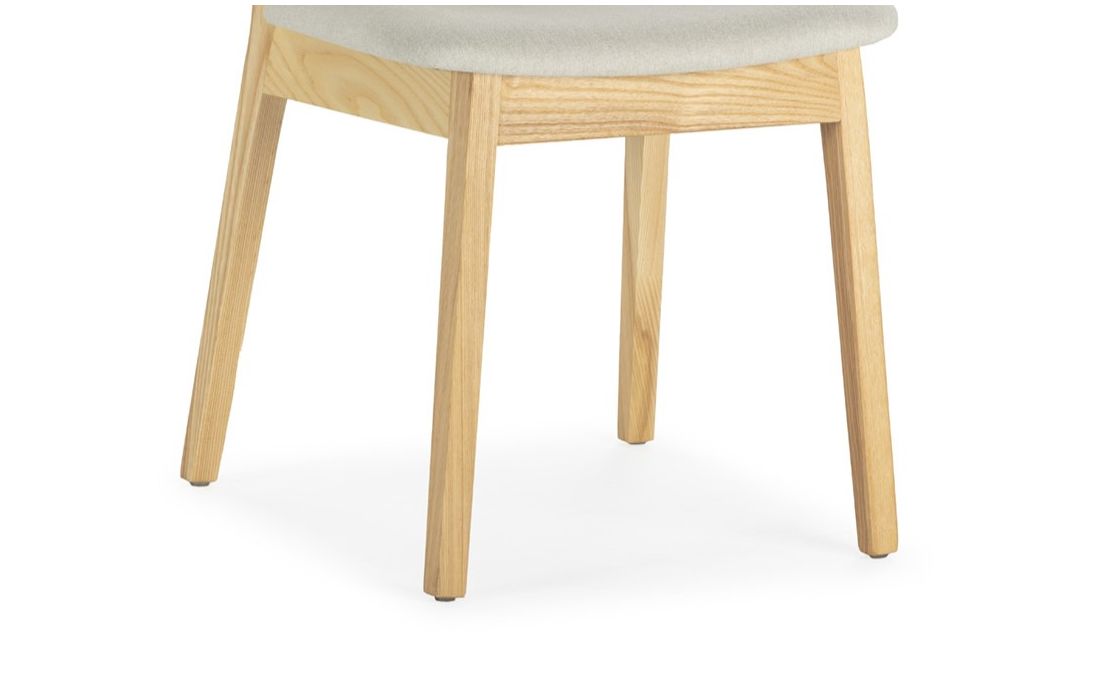 Cadeira em madeira de faia natural com estofo em tecido cinzento.
