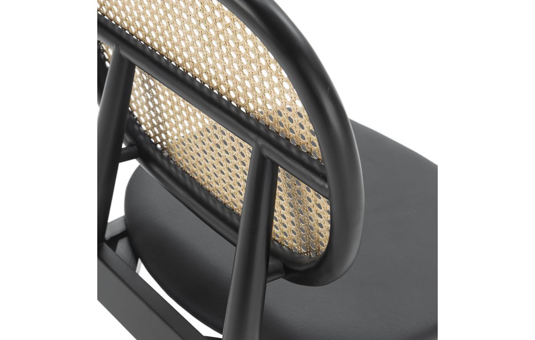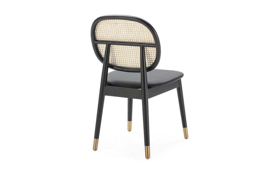 Cadeira em madeira preta, com encosto em ratan e com os pés em metal dourado.