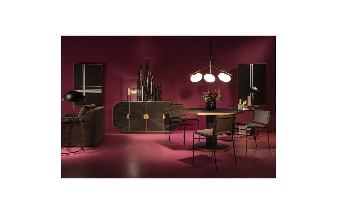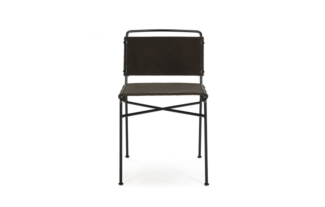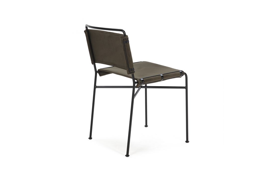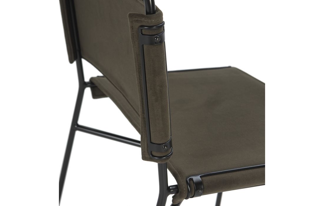 Cadeira em veludo de cor castanha com metal preto.