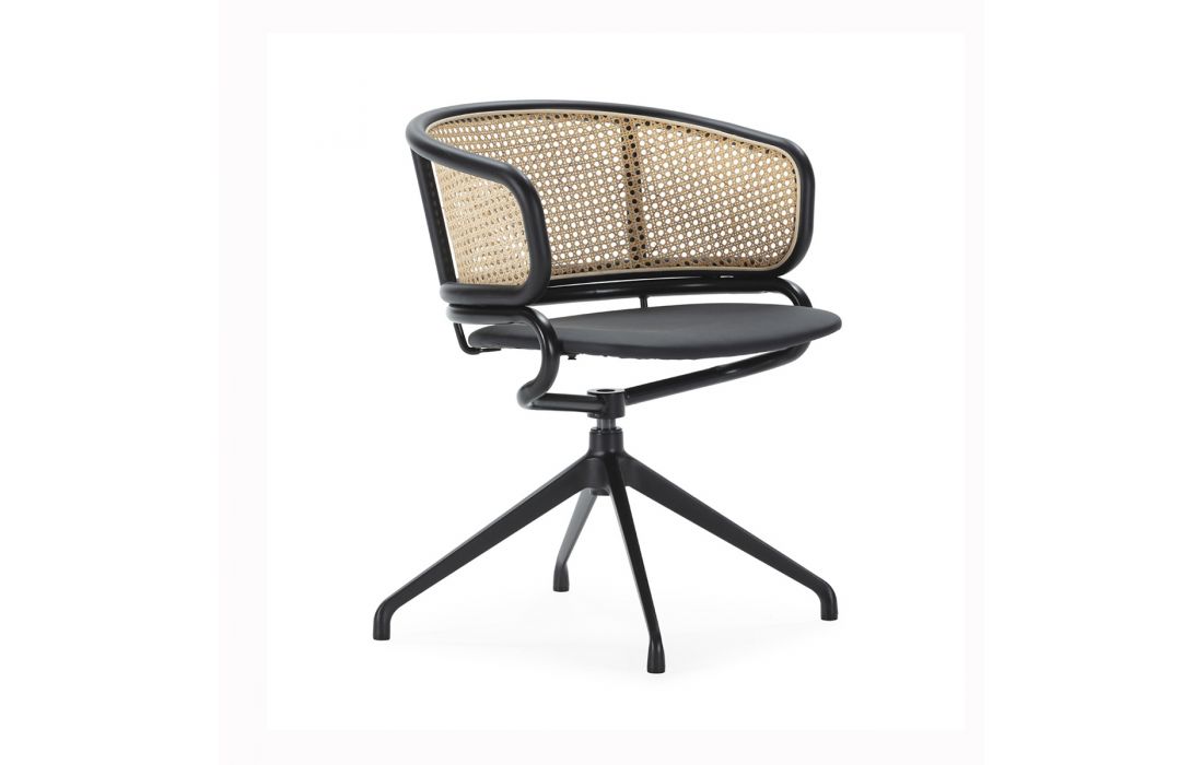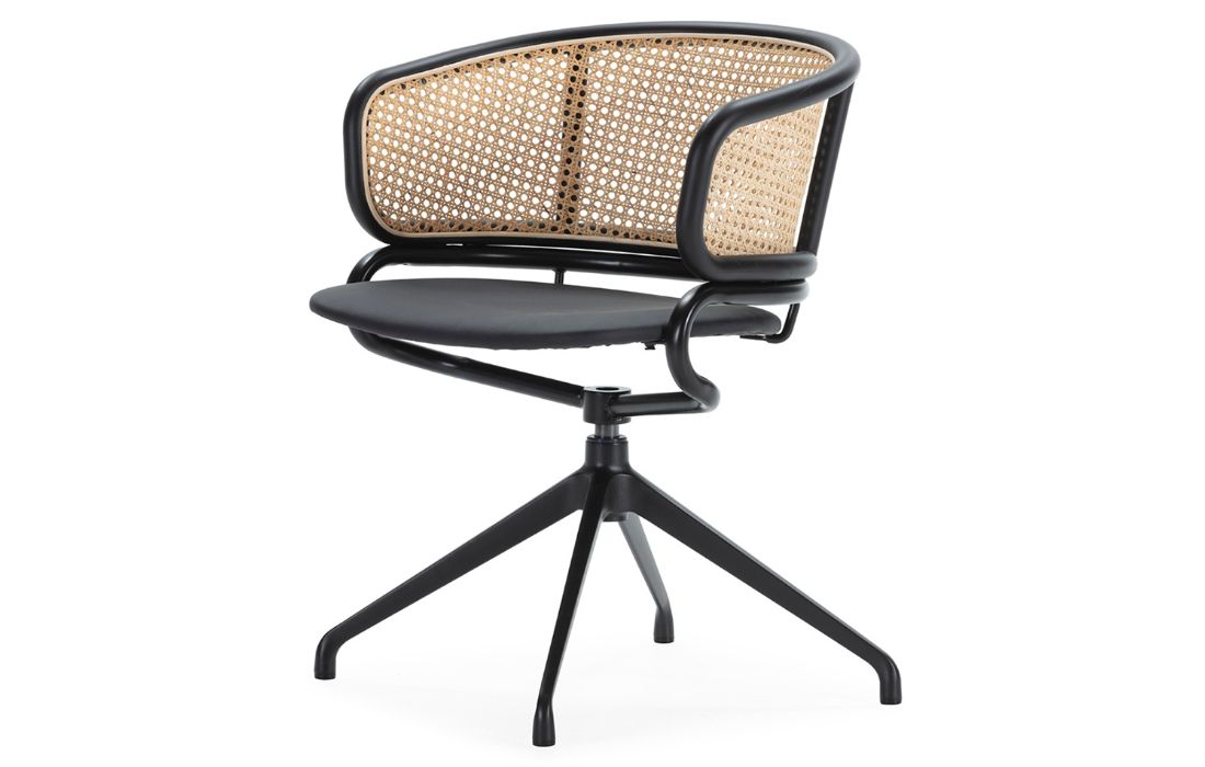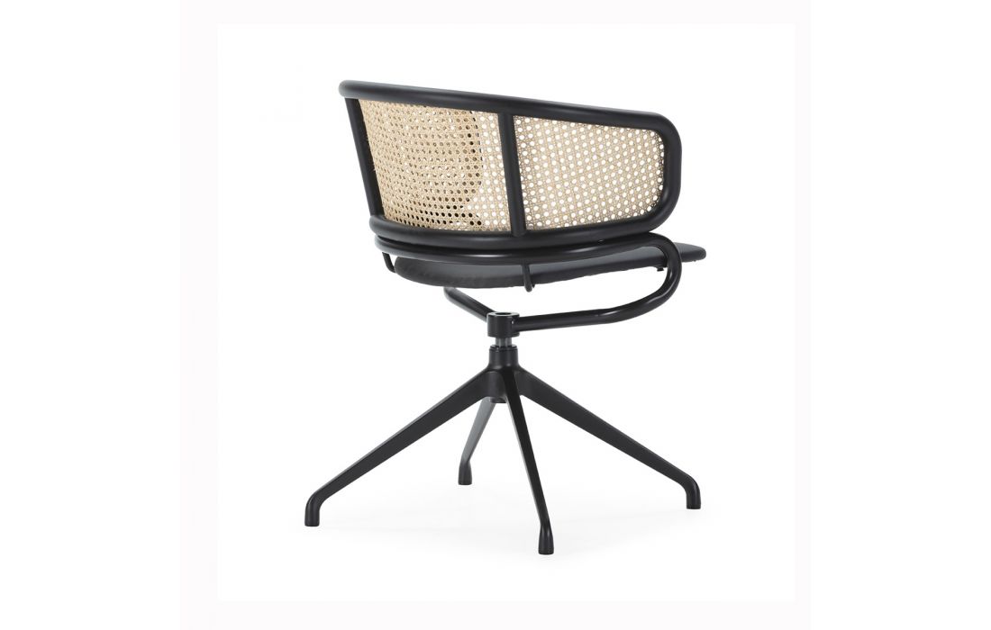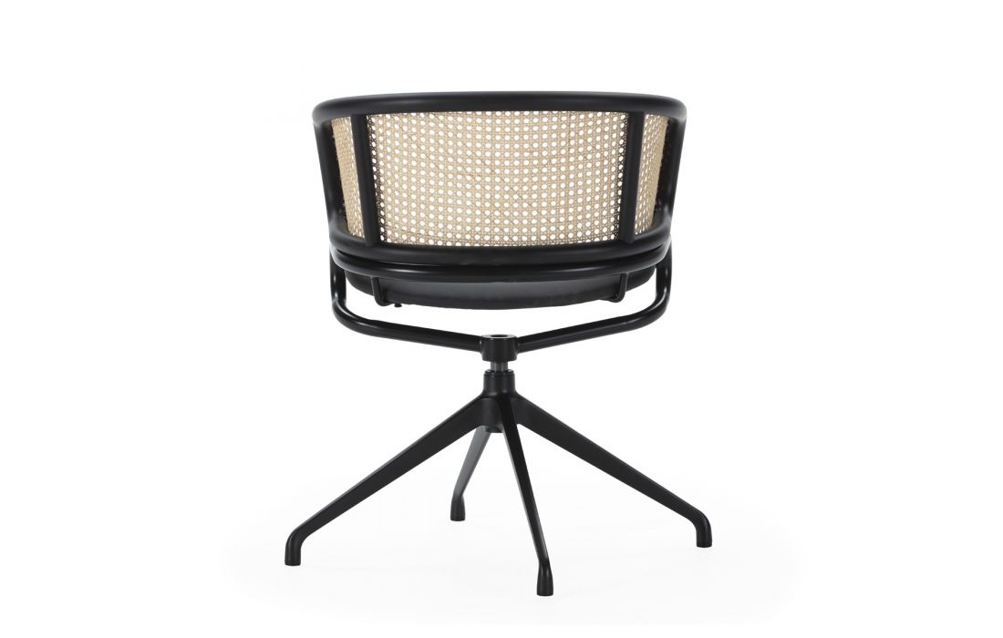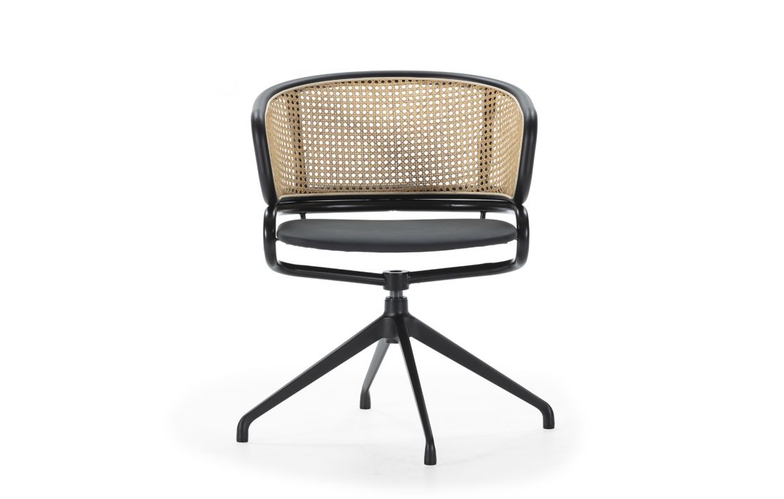 Cadeira em metal preto natural com a costa em ratan e com o acento em pele cor preta.