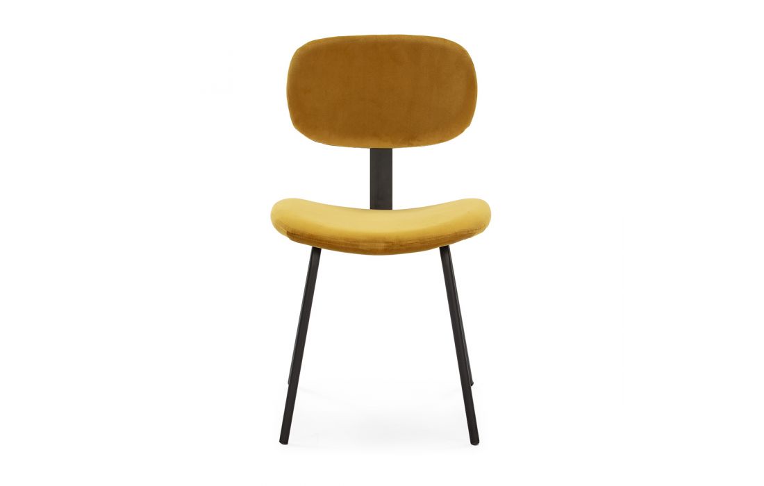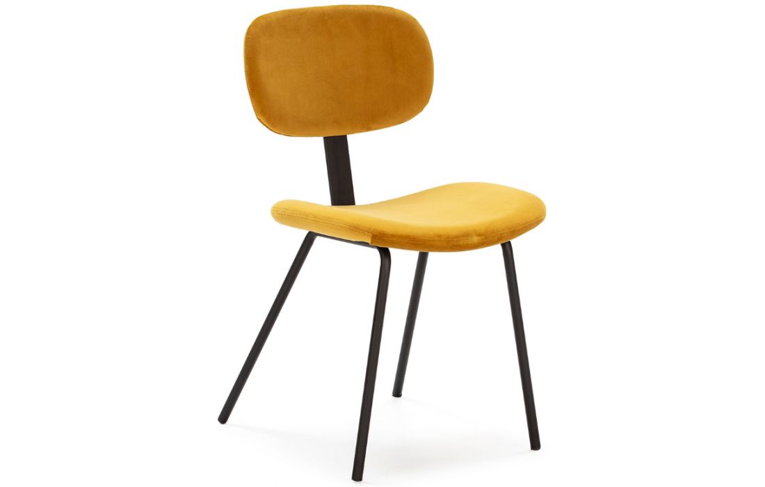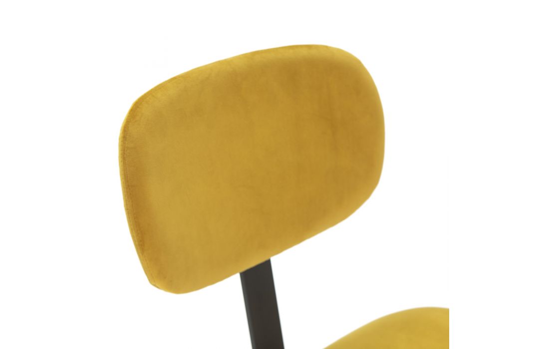 Cadeira em metal preto com tecido aveludado de cor amarela.