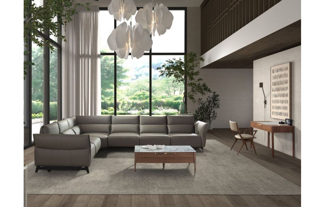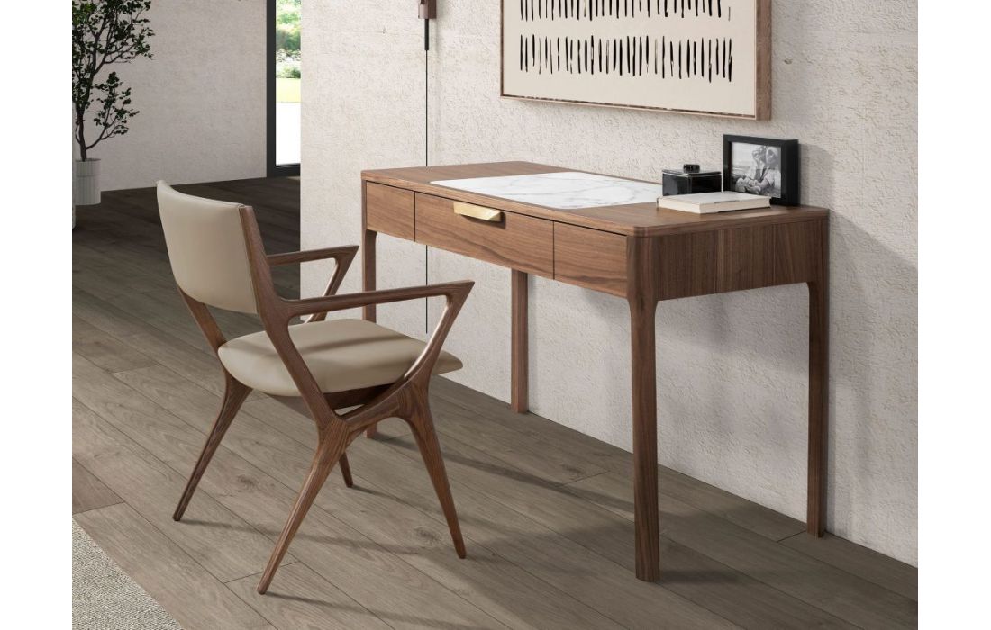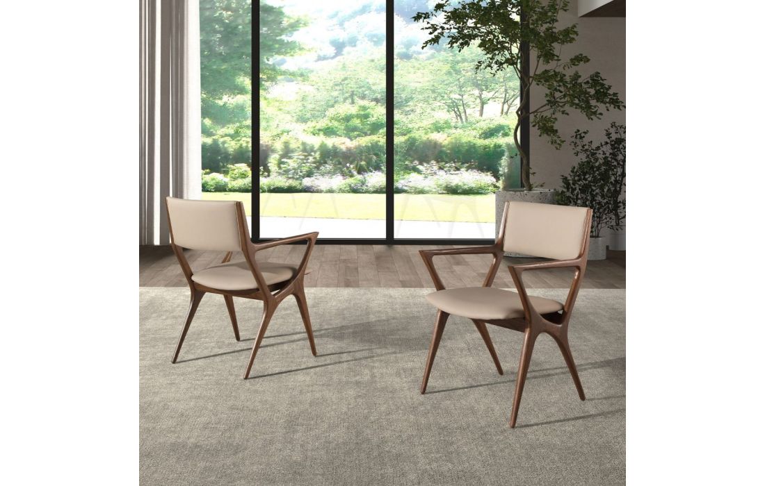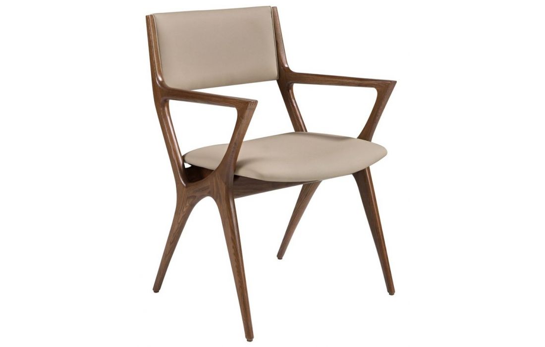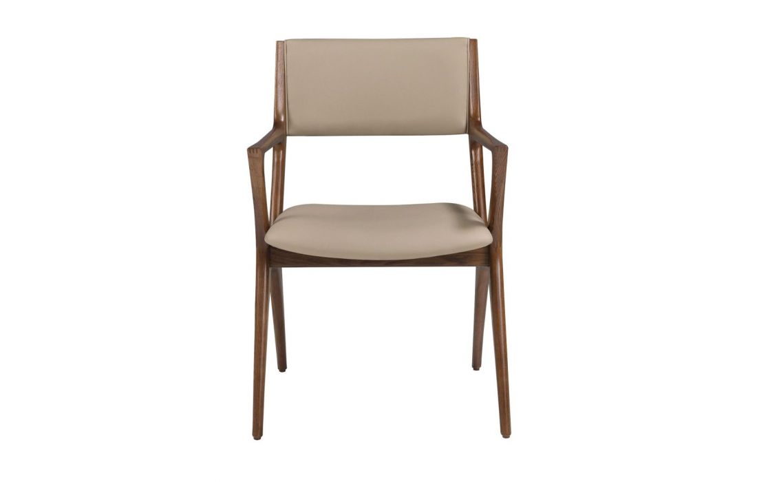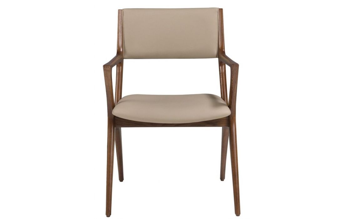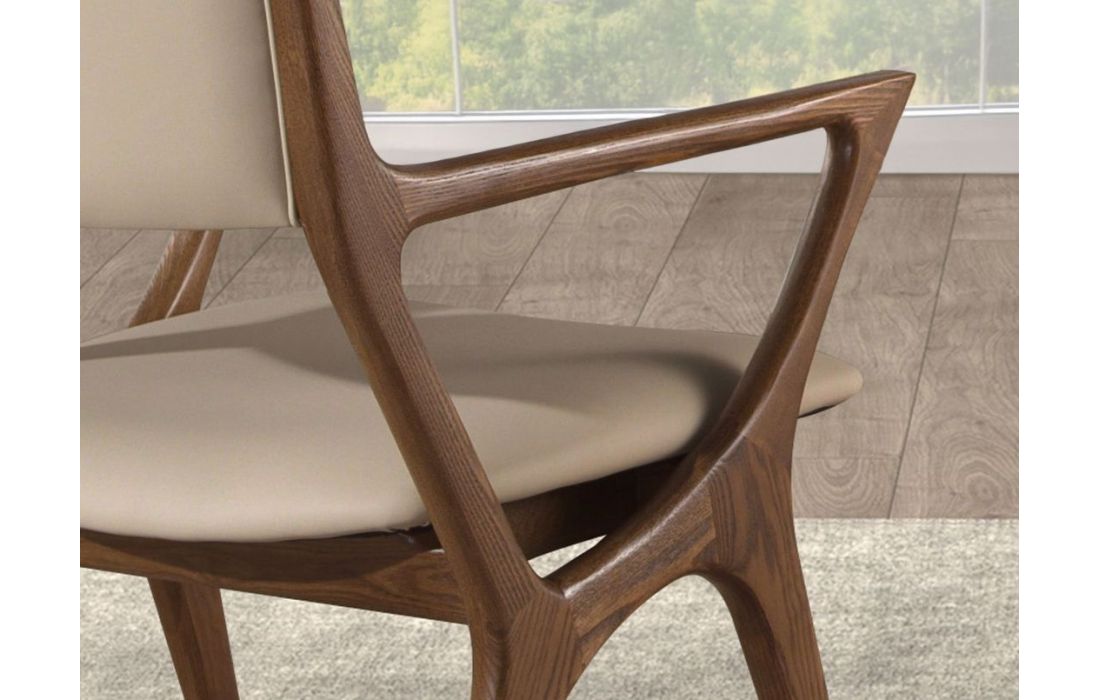 Cadeira de design moderno com braços, assento e encosto estofados em pele sintética e as suas pernas de madeira na cor nogueira, vanguardistas e intemporaisDestinatário :