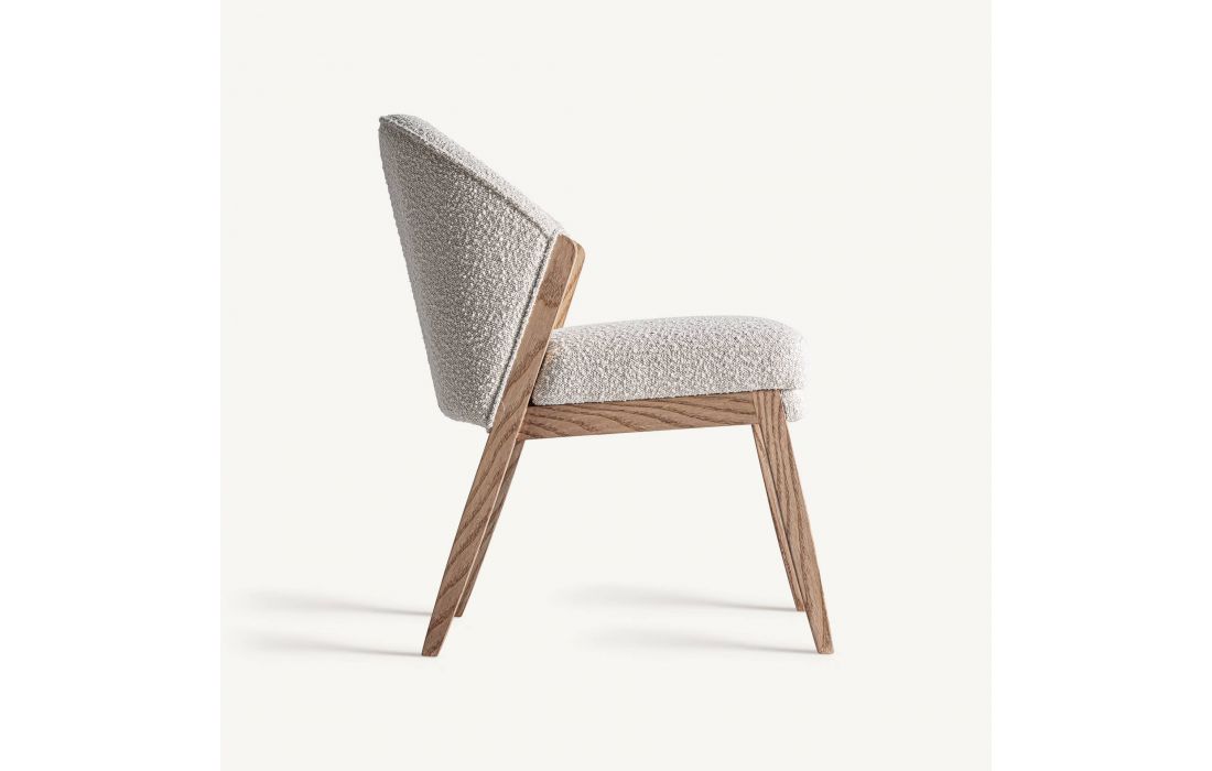 A cadeira Prati com tecido Bouclé destaca-se pela sua estrutura. Sua silhueta envolvente e textura macia fazem dela uma peça aconchegante e sofisticada, ideal para espaços relaxantes.