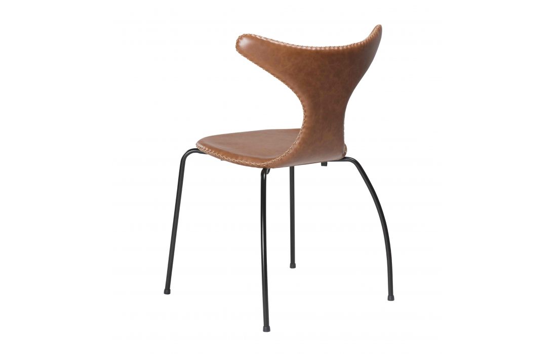 Cadeira com estofo em pele genuína castanho claro com pés em metal preto