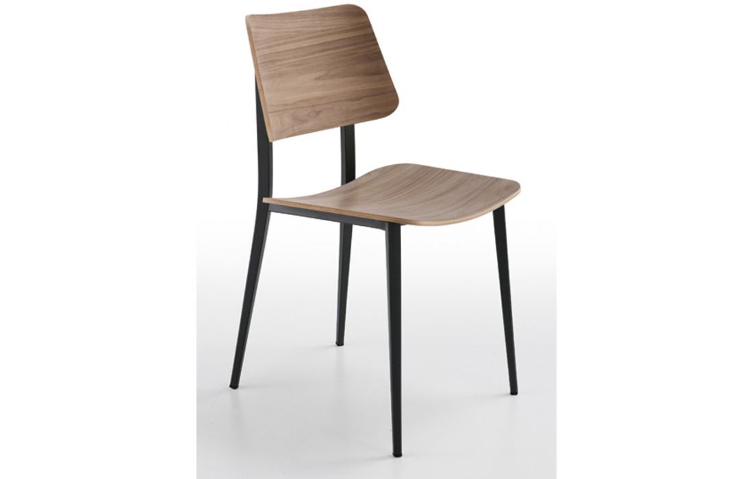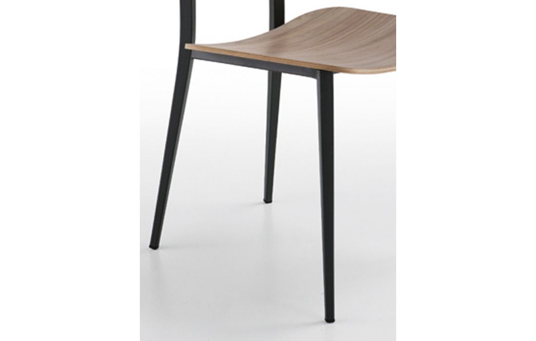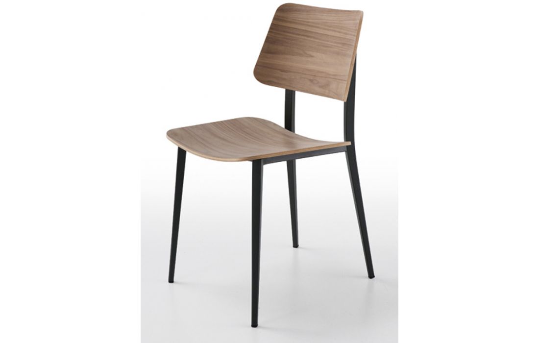 Cadeira com estrutura em aço branco ou preto com assento e encosto em nogueira, carvalho ou carvalho queimado