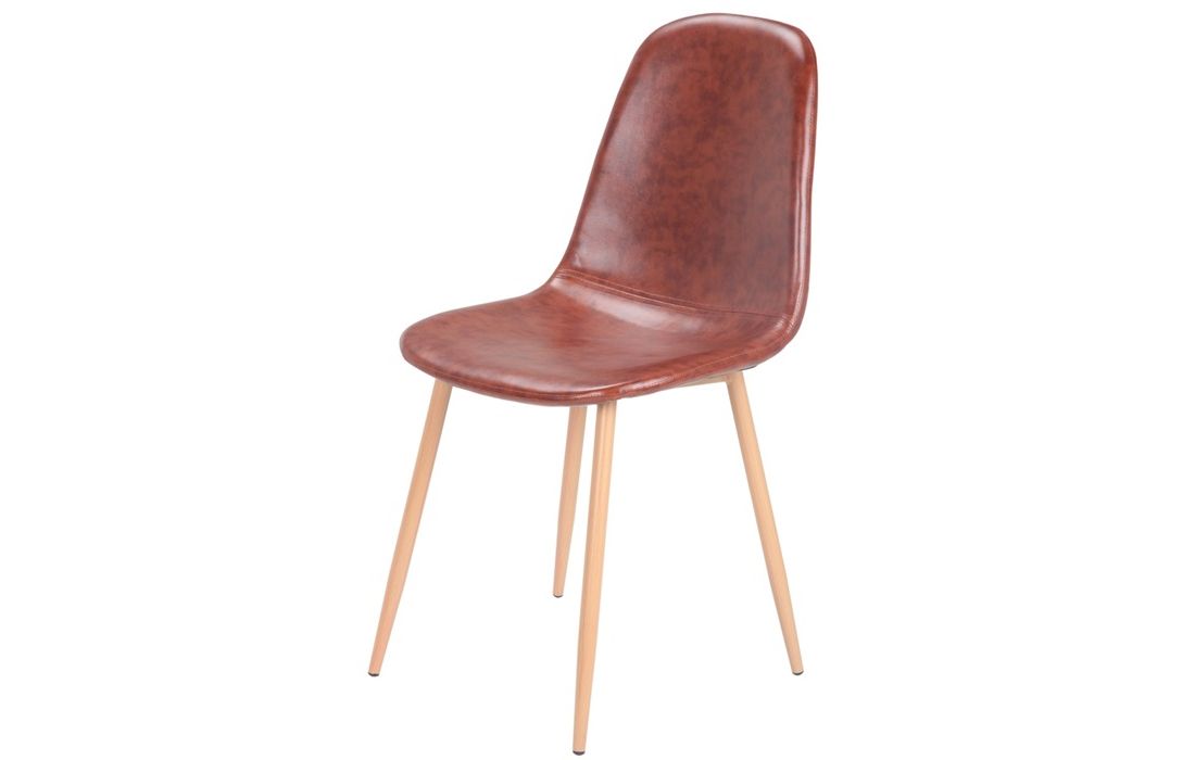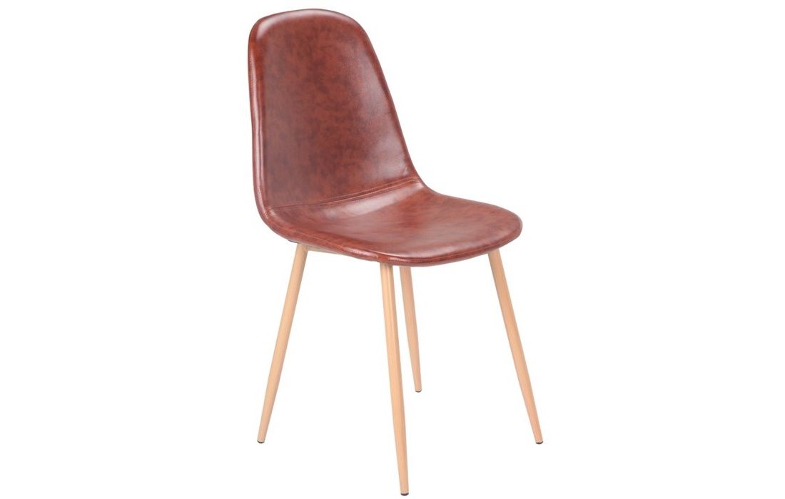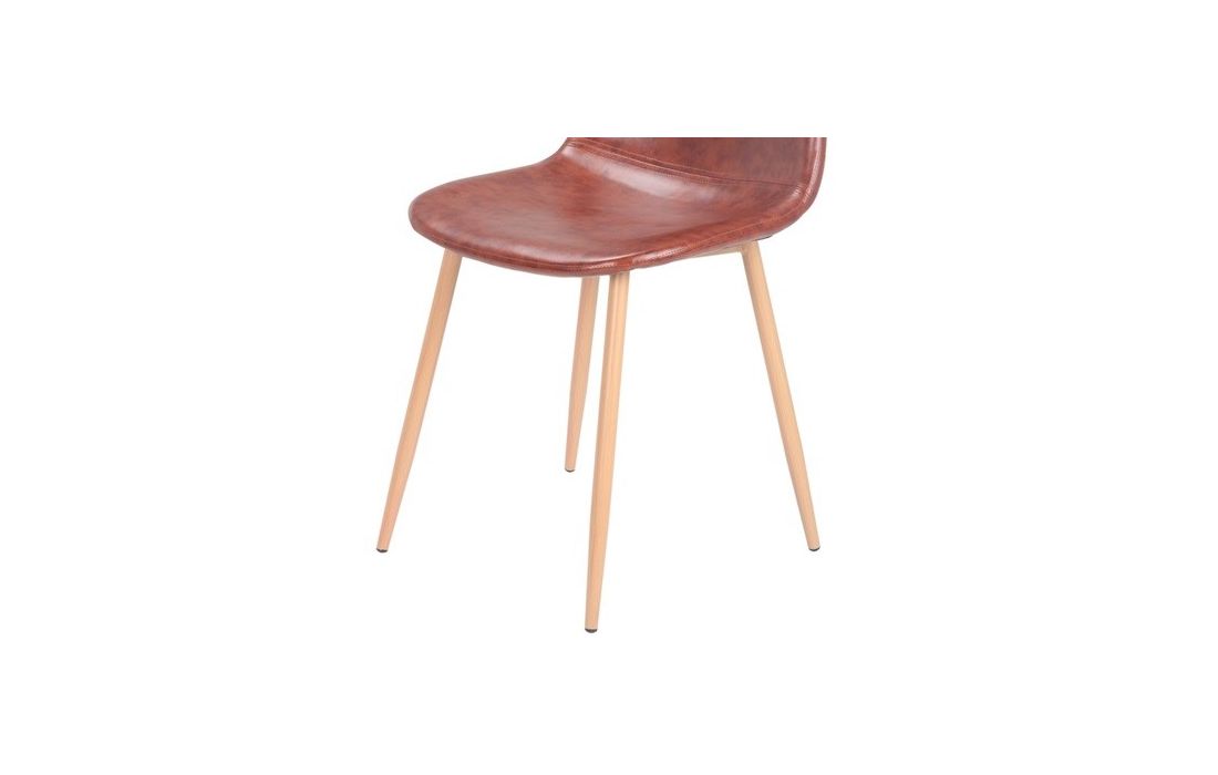 Cadeira com estrutura em metal, acabamento em epoxi cor de madeira e assento e costa em pele sintética couro envelhecido.
