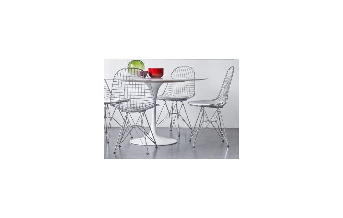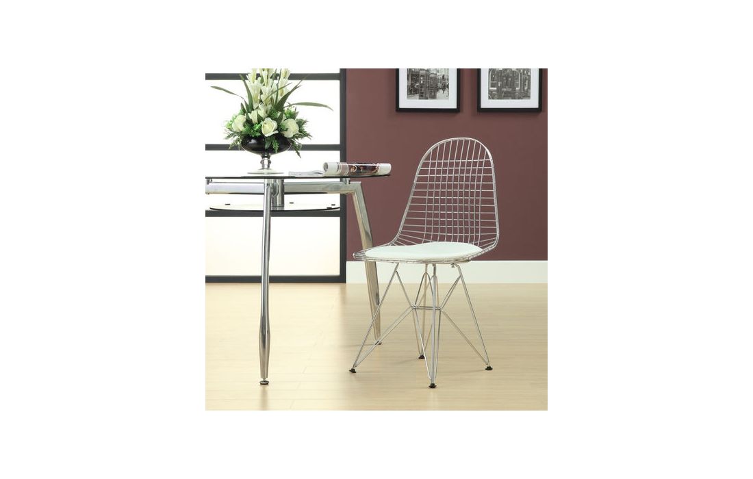 Cadeira com estrutura metal cromado e assento em pele sintética de cor branco ou preto.