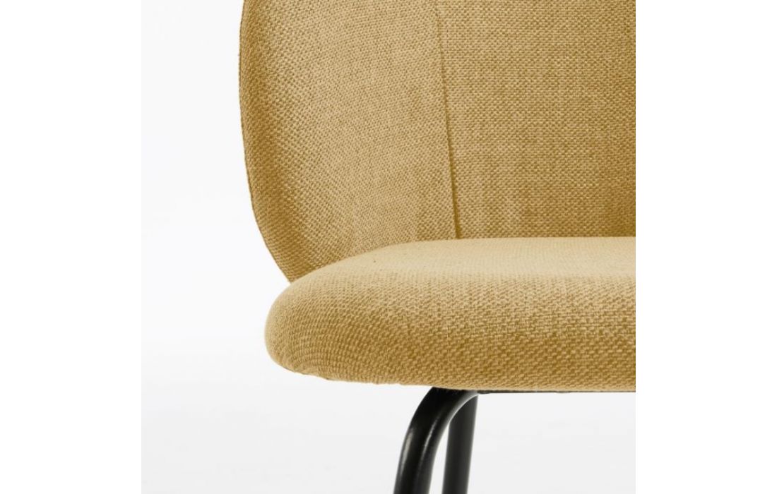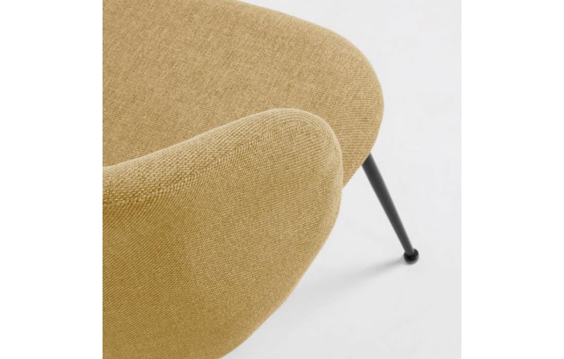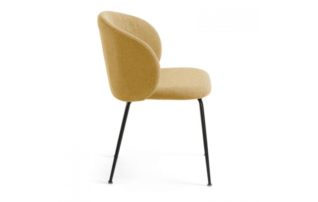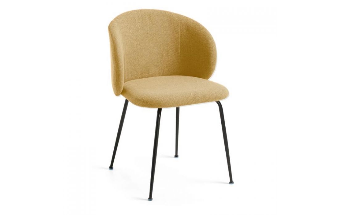 Cadeira com estrutura de metal com acabamento preto e estofada em tecido de cor mostarda.