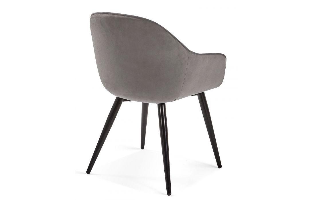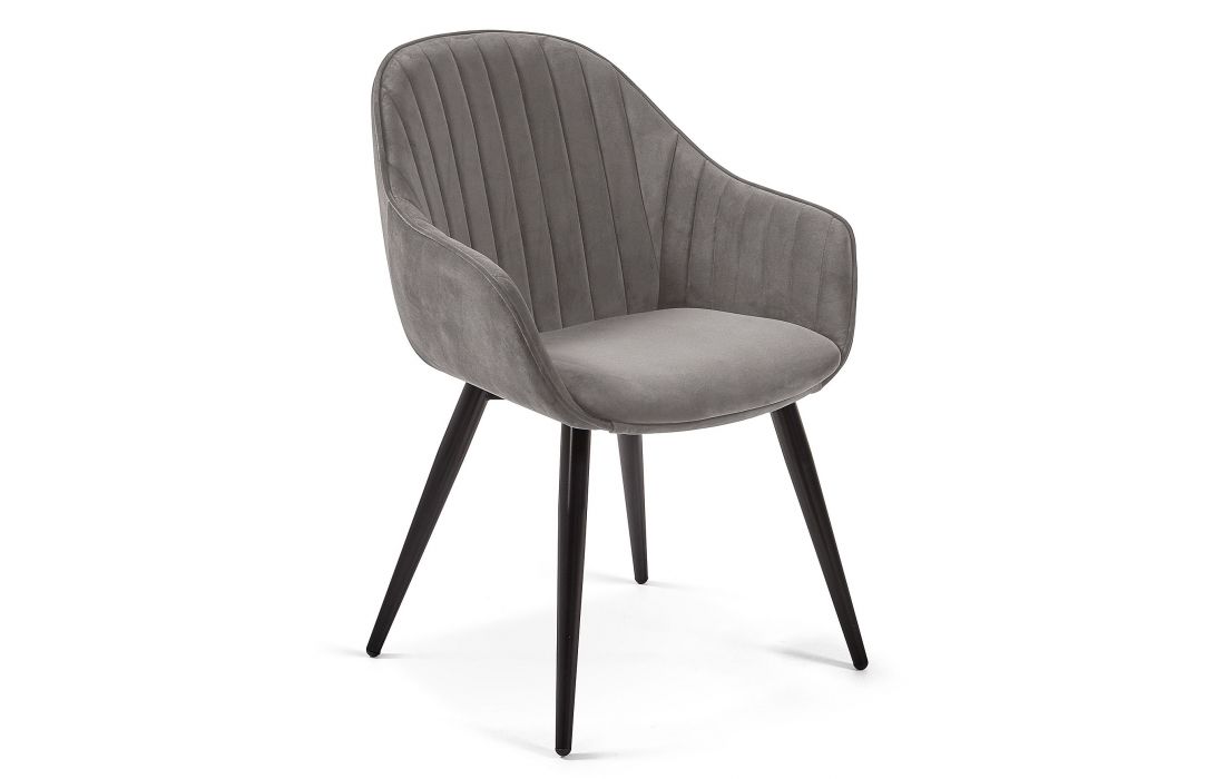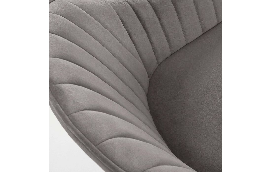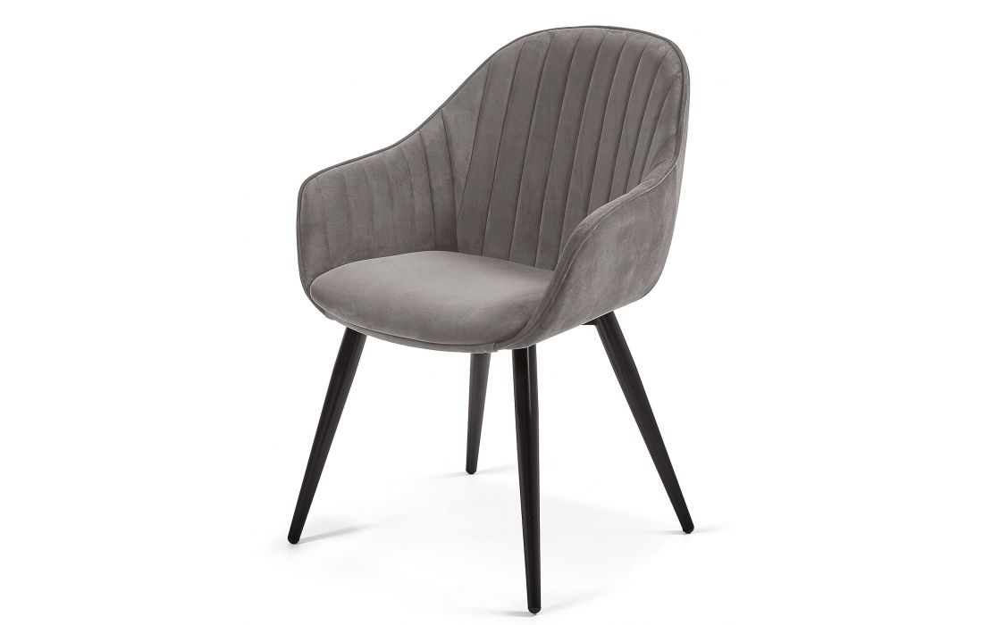 Cadeirão com estrutura em metal de cor preta e estofo em tecido veludo de cor cinza.
