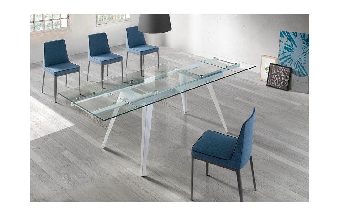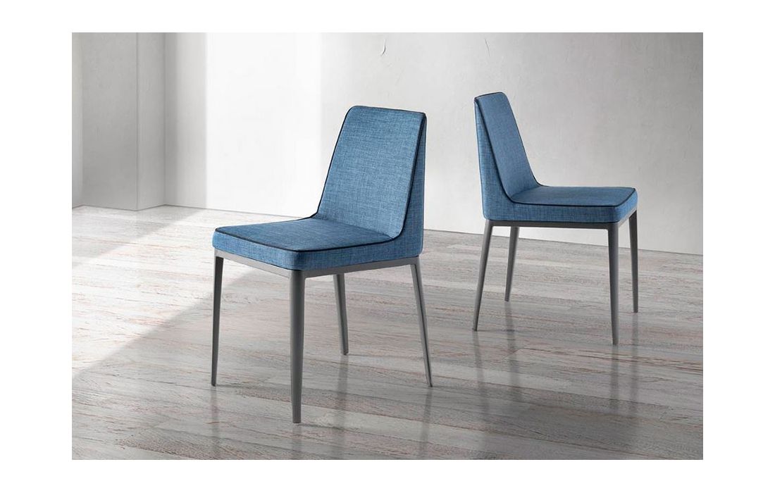 Cadeira de jantar estofada em tecido com guarnições pretas e estrutura de aço pintada de preto.