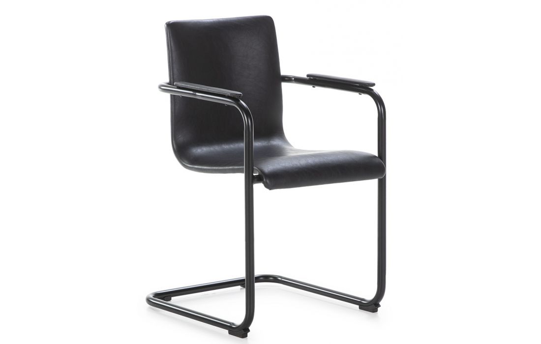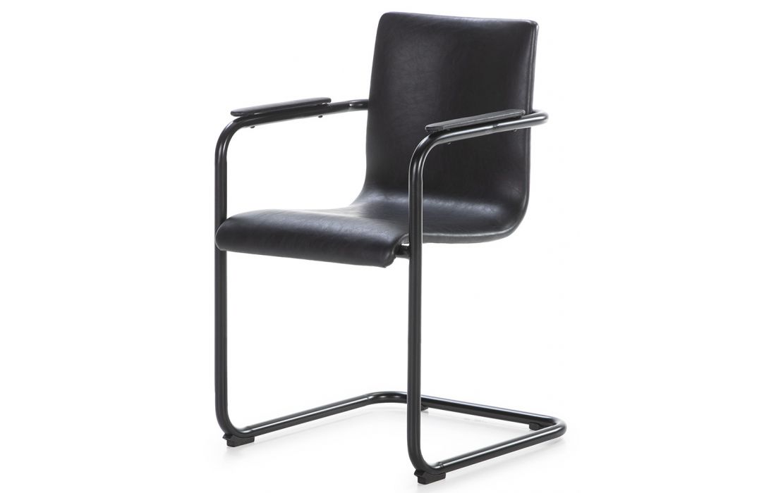 Cadeira de braços com estrutura em metal preto e estofo em pele preta