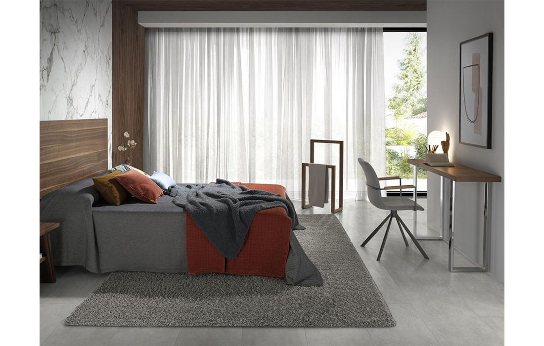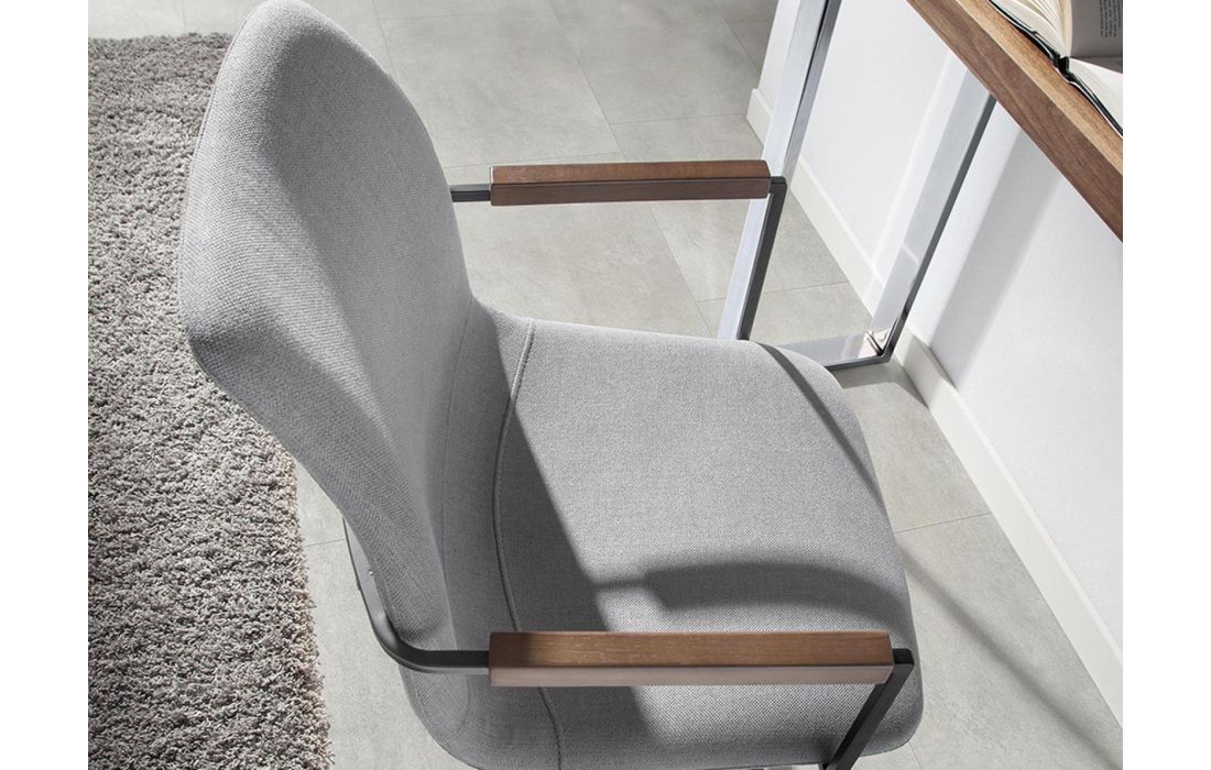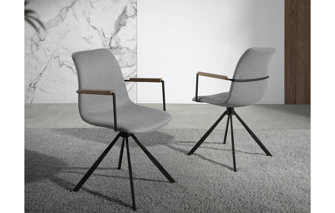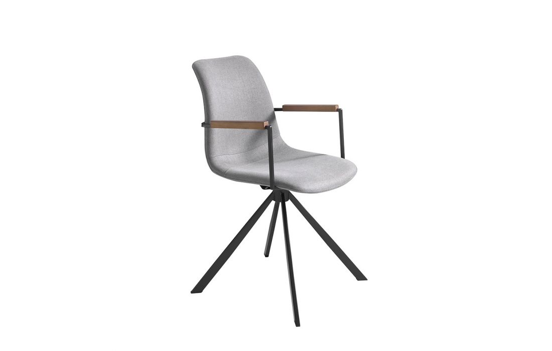 Cadeira giratória estofada em tecido com pernas em aço preto e braços em madeira de nogueiraDestinatário :