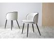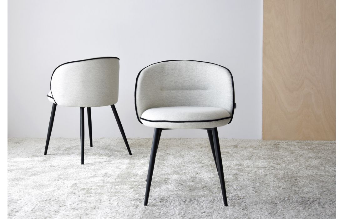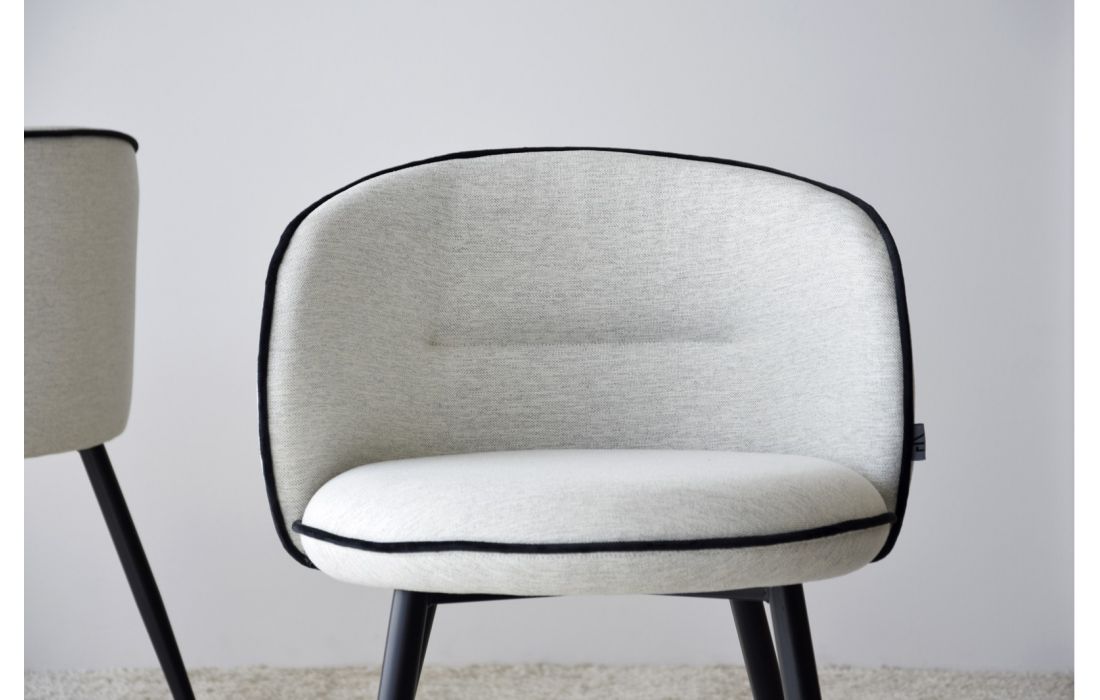 Cadeira estofada em tecido bege com detalhes em tecido de veludo na cor preto. A cadeira tem as suas formas arredondadas, e pés metálicos na cor preto mate.