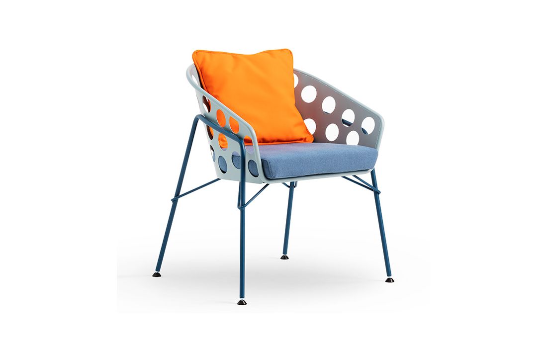 Cadeira com estrutura e encosto em metal lacado e almofadas em tecido. Possibilidade de vários revestimentos e cores de estrutura. Design Paola Navone.